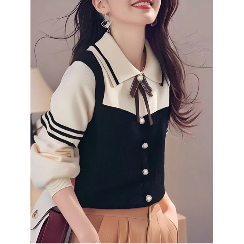 플러스 사이즈 여자 통통녀 가을 겨울 올 매치 대비 컬러 스티칭 니트 탑 디자인 센스 슬림 샤넬 스타일 풀오버 스웨터