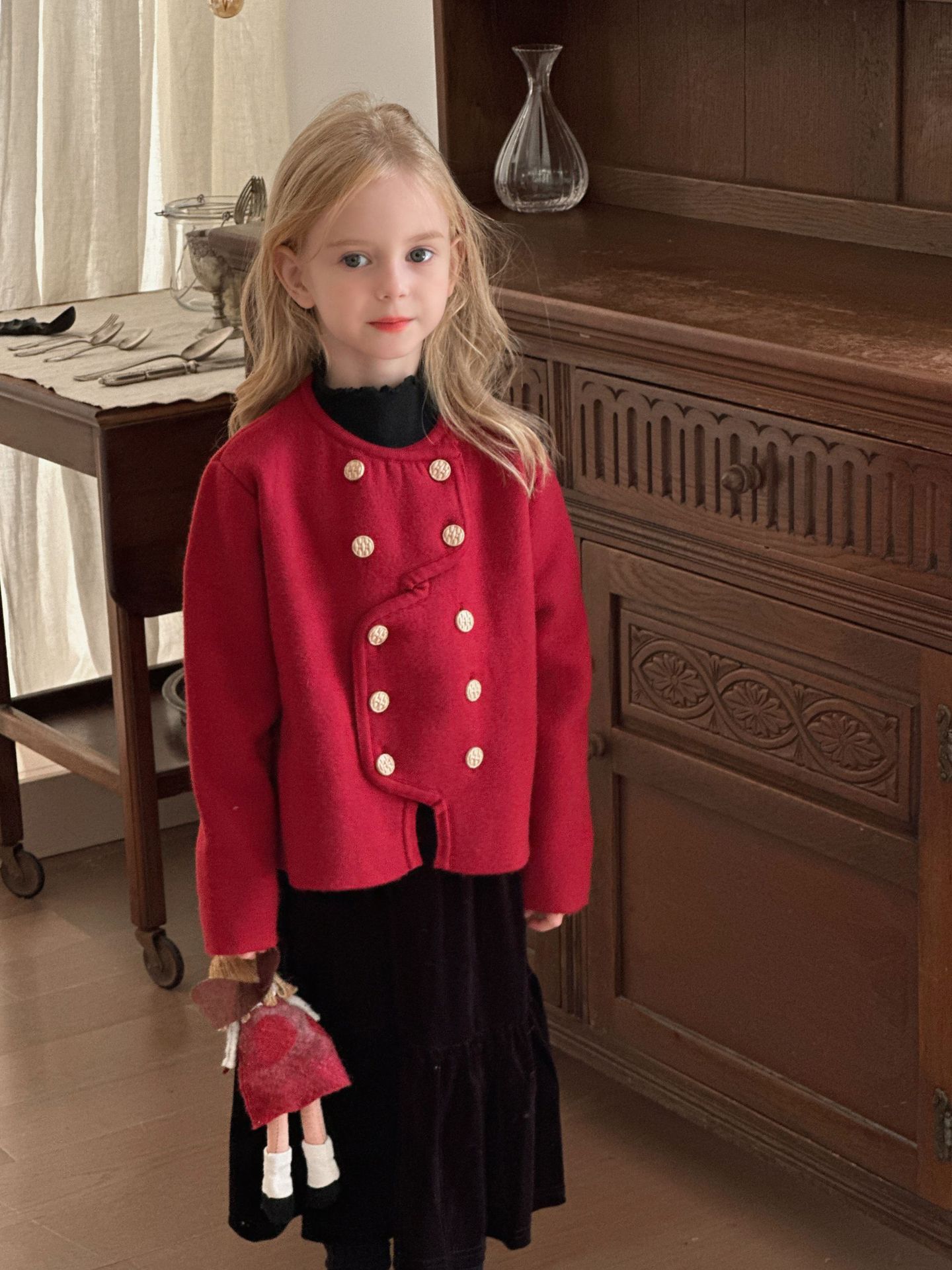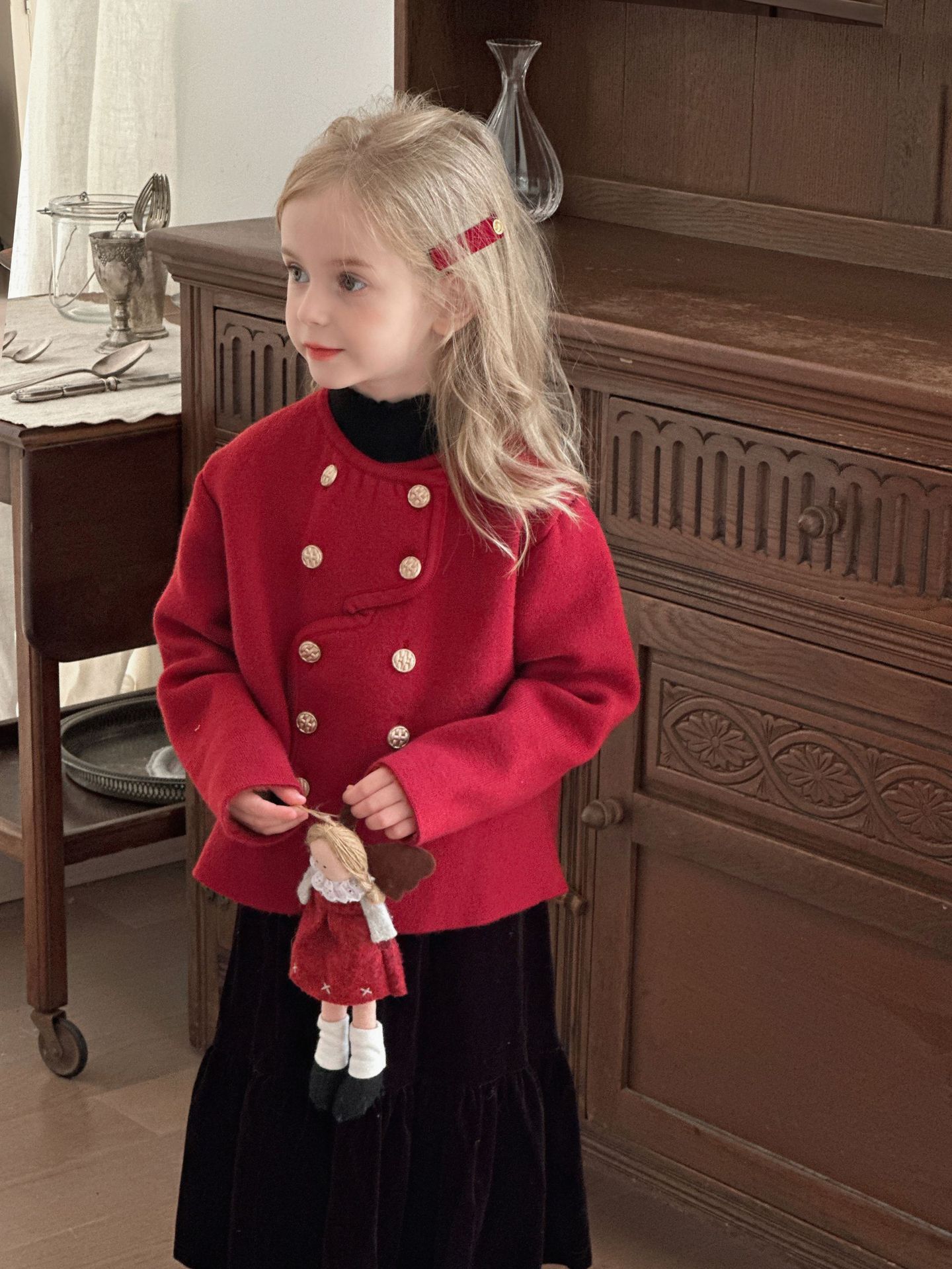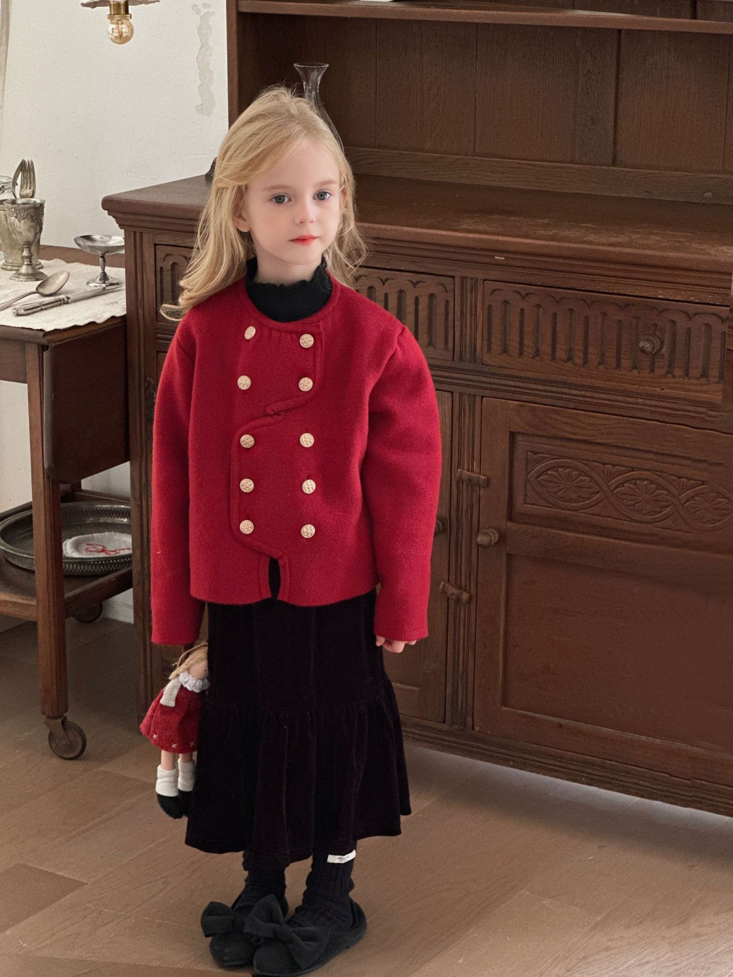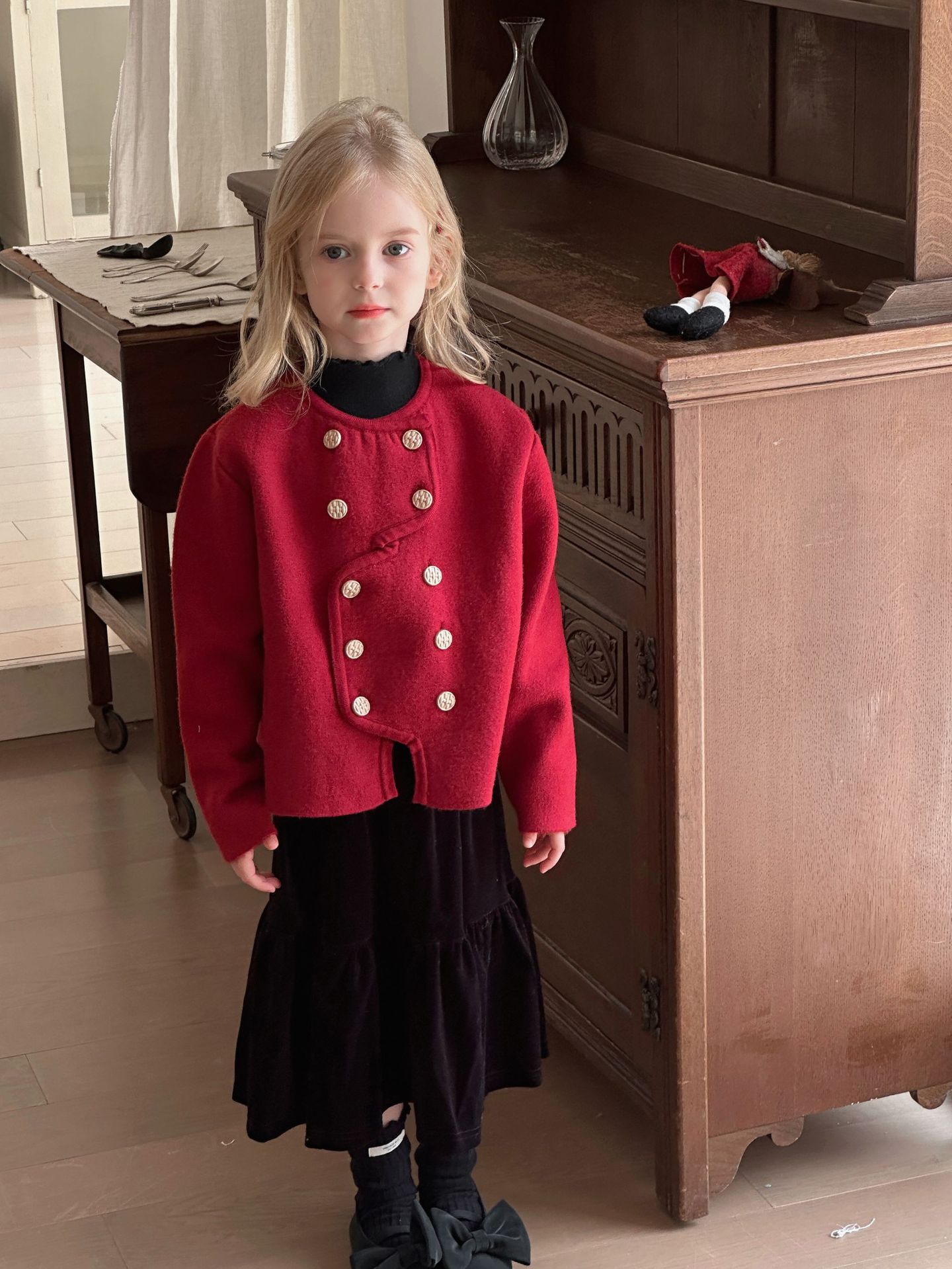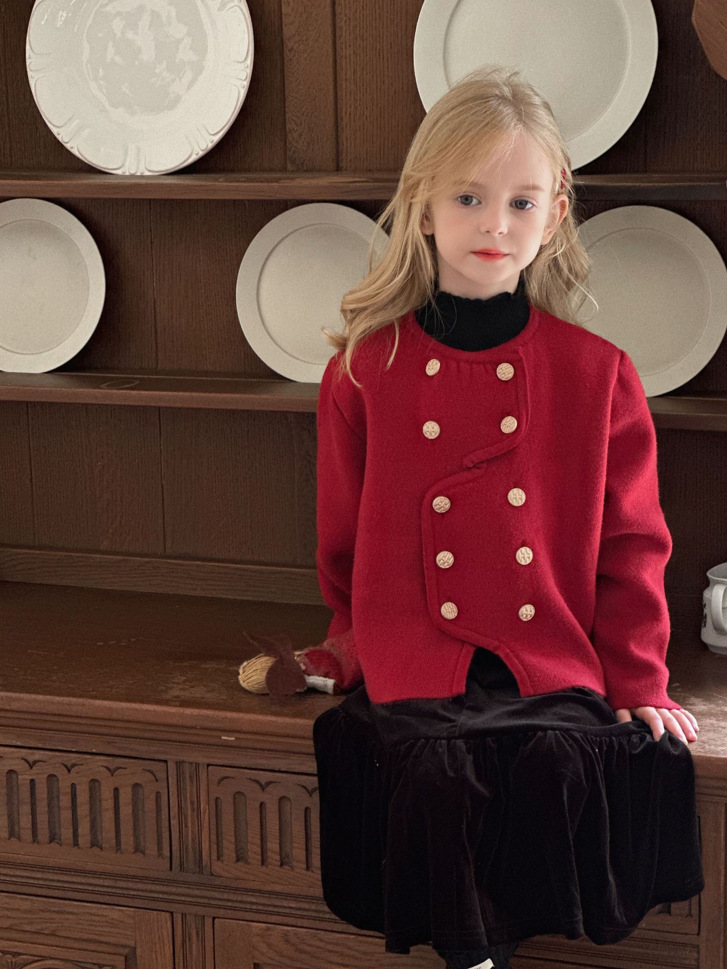 【기간한정 50% off】여아용 작은 향기로운 향기를 지닌 스타일리시한 코트, 겨울 신상 더블 버튼 레드 니트 가디건, 새해맞이 의상