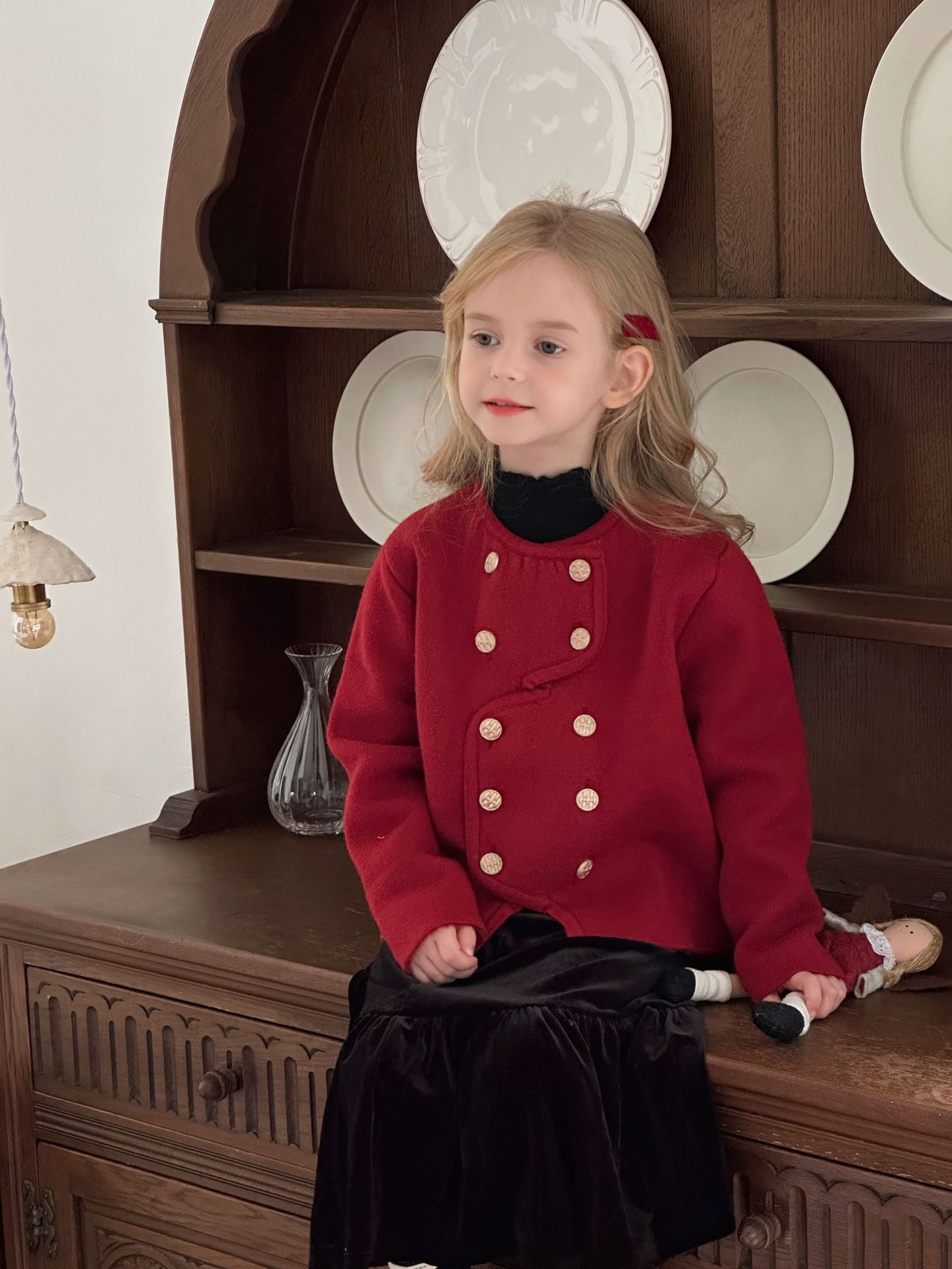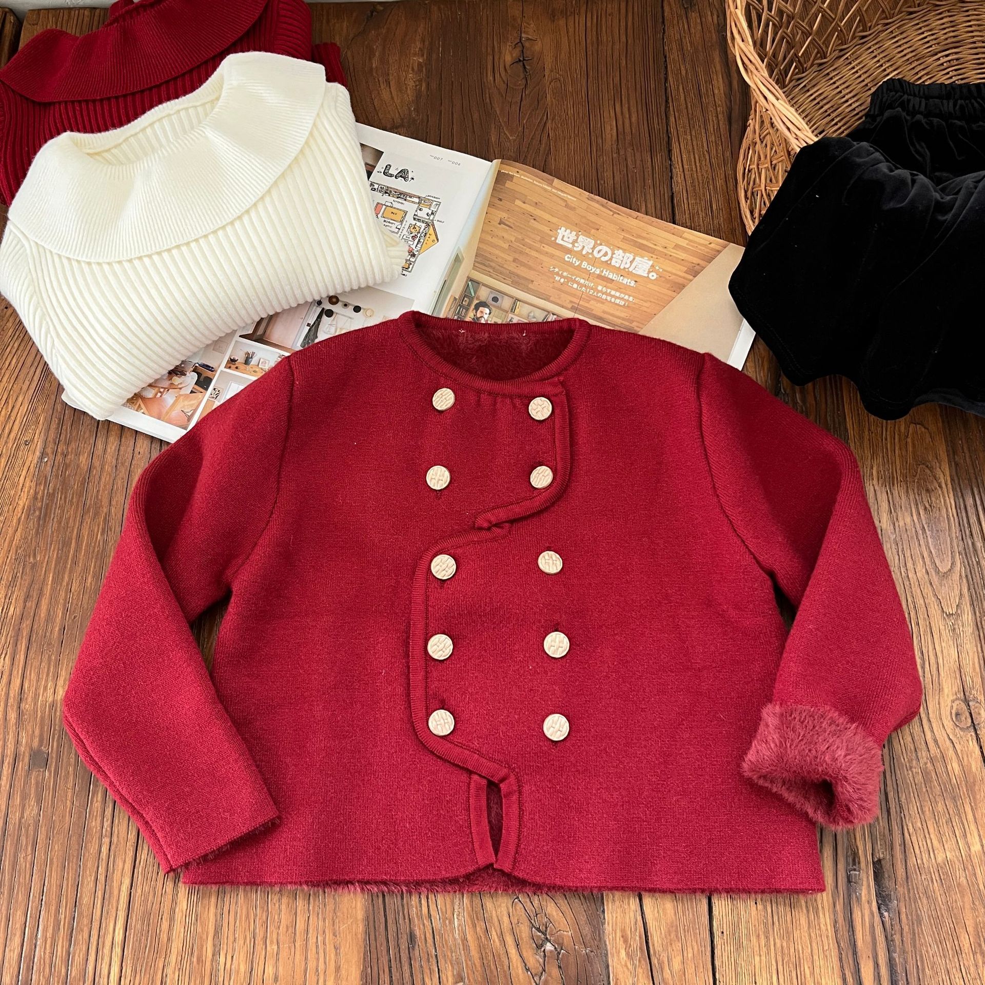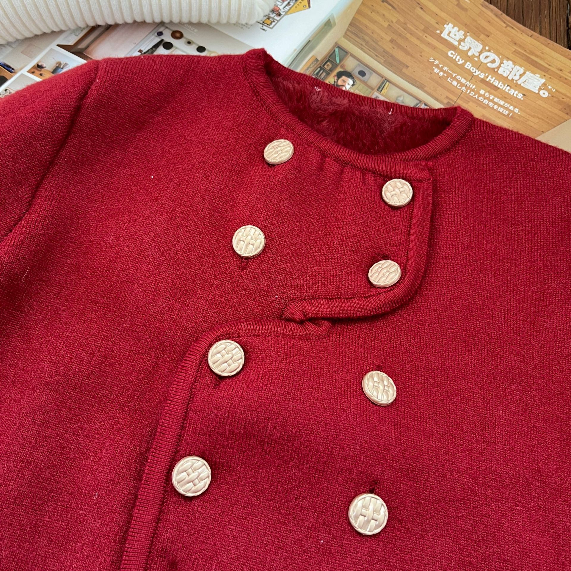 【기간한정 50% off】여아용 작은 향기로운 향기를 지닌 스타일리시한 코트, 겨울 신상 더블 버튼 레드 니트 가디건, 새해맞이 의상스토어 가기