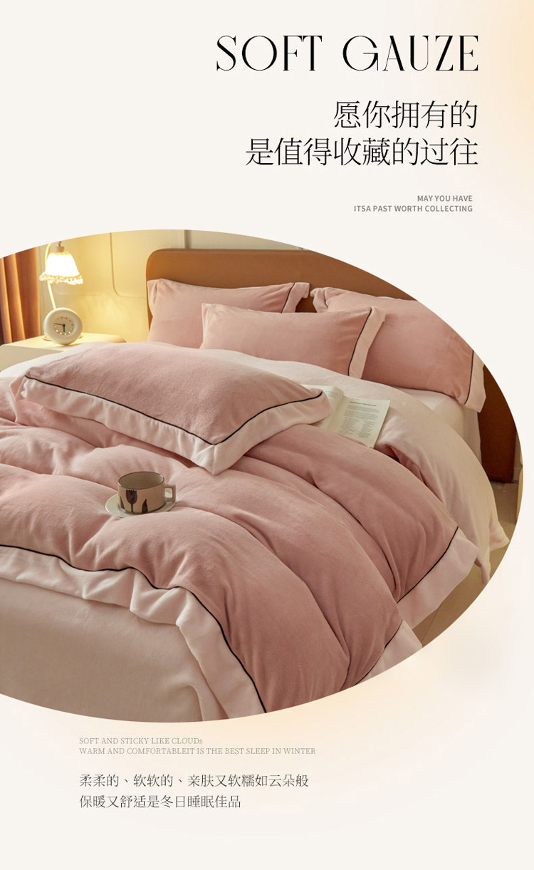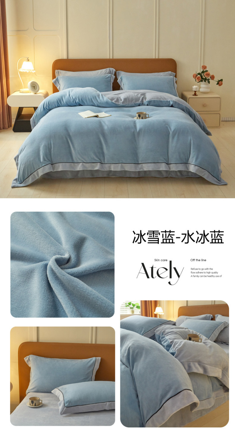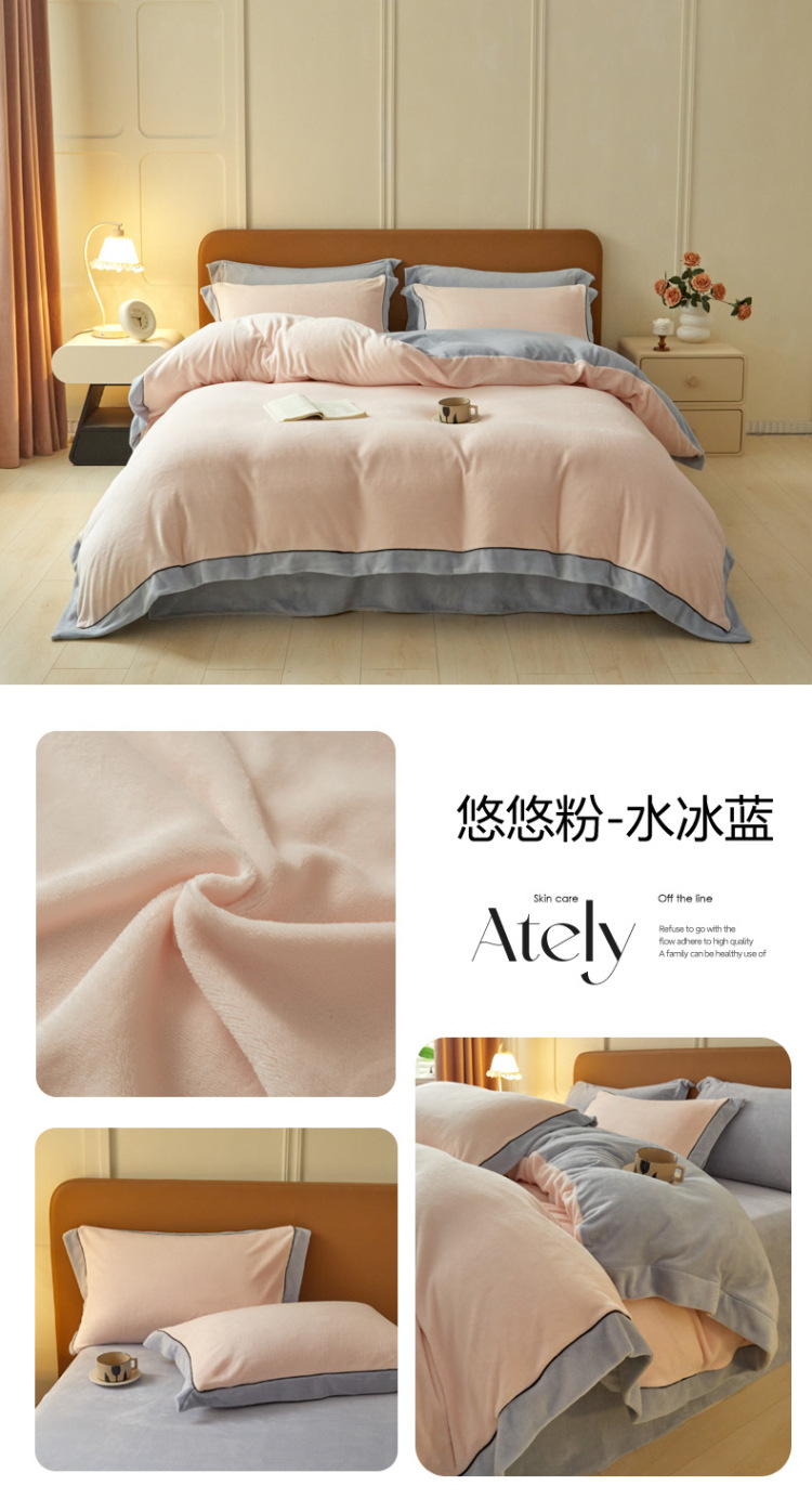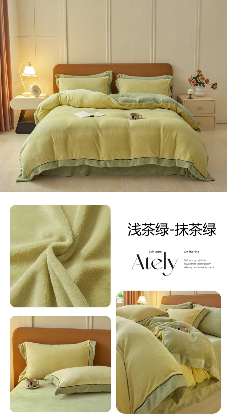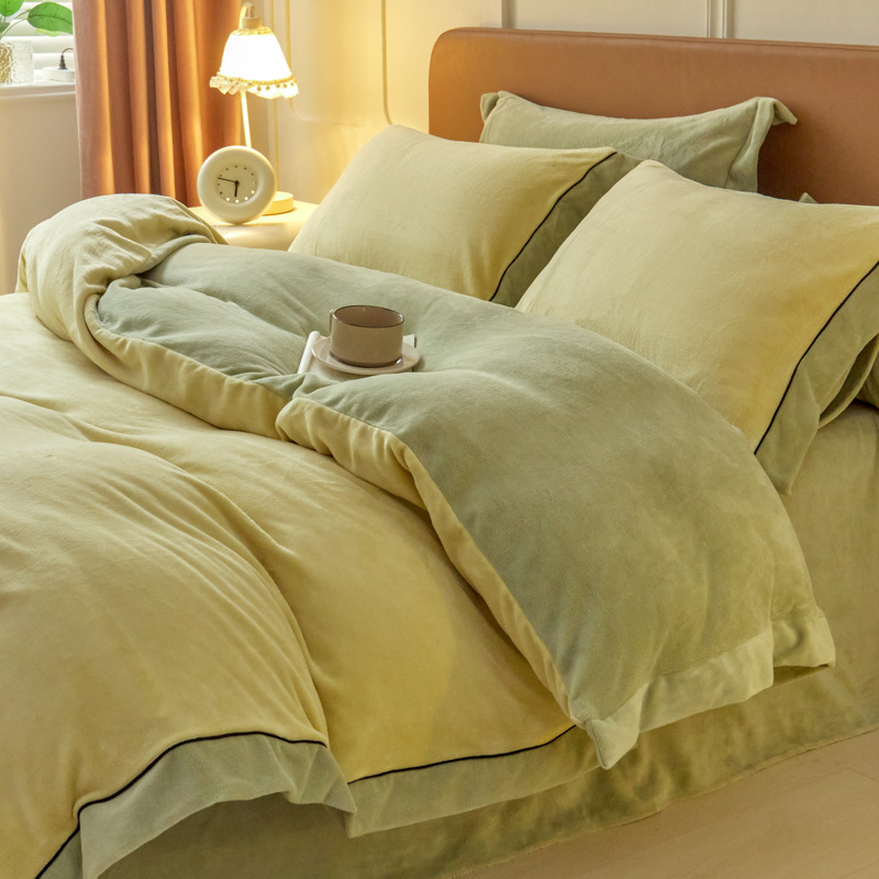가을과 겨울 우유 벨벳 침대 4 피스 세트 단색 넓은 가장자리 코너 패딩 따뜻한 더블 퀼트 커버 시트 침구 도매스토어 가기