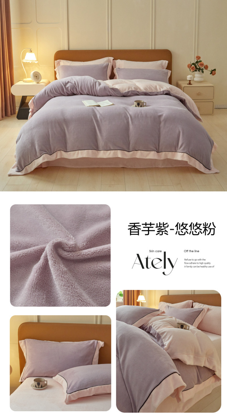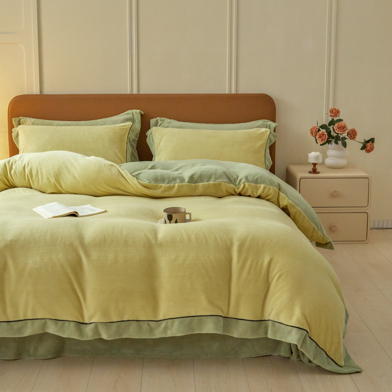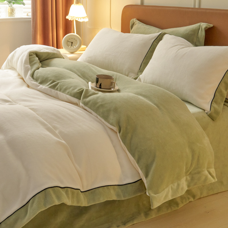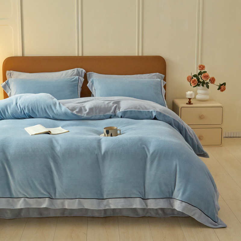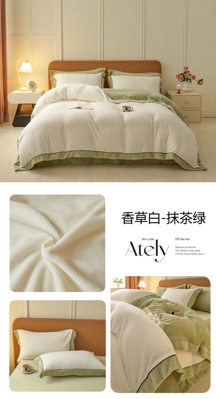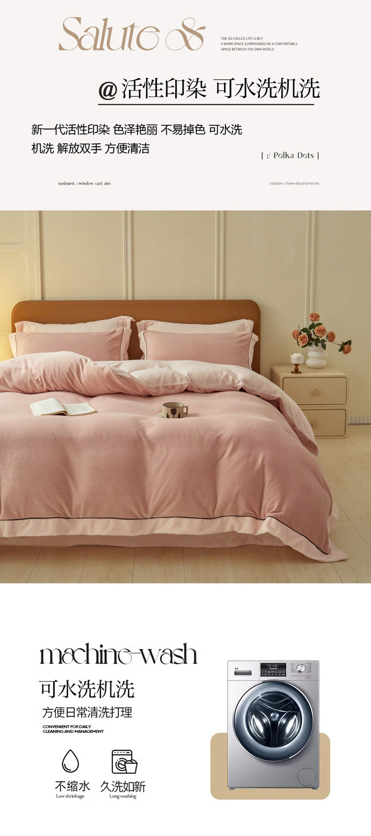 가을과 겨울 우유 벨벳 침대 4 피스 세트 단색 넓은 가장자리 코너 패딩 따뜻한 더블 퀼트 커버 시트 침구 도매스토어 가기