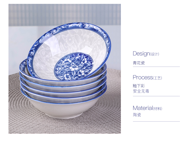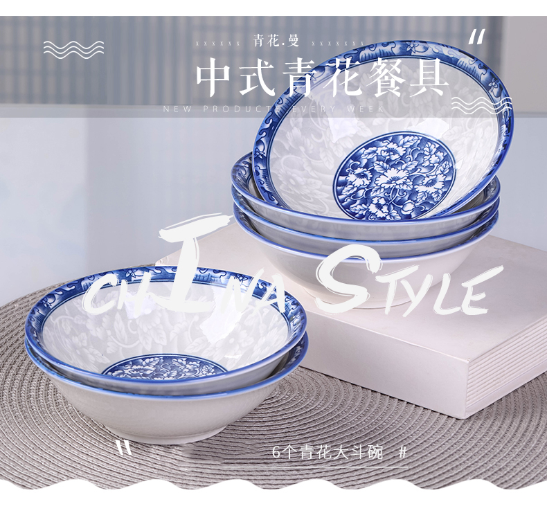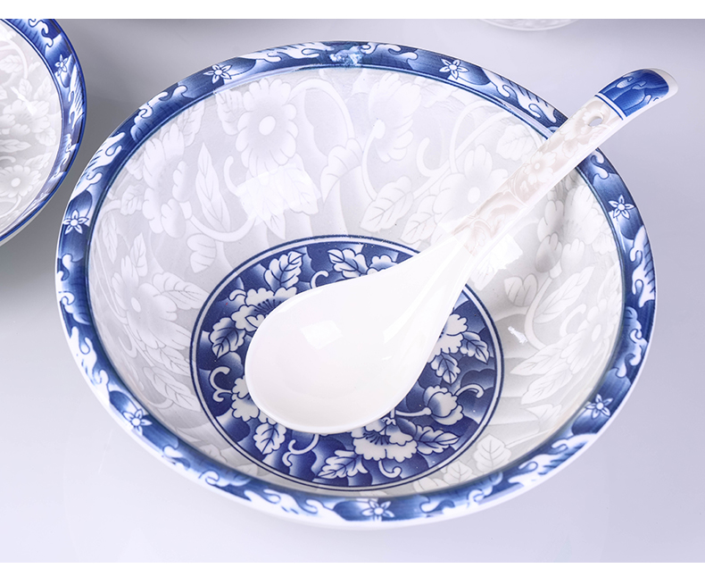 Jingdezhen 파란색과 흰색 도자기 그릇 10 양동이 그릇 큰 죽라면 그릇 중국 저 유약 색상은 전자 레인지로 채울 수 있습니다스토어 가기