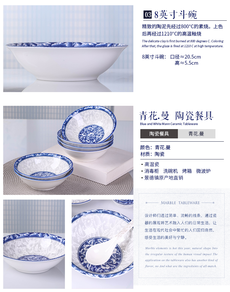 Jingdezhen 파란색과 흰색 도자기 그릇 10 양동이 그릇 큰 죽라면 그릇 중국 저 유약 색상은 전자 레인지로 채울 수 있습니다