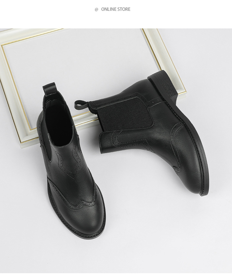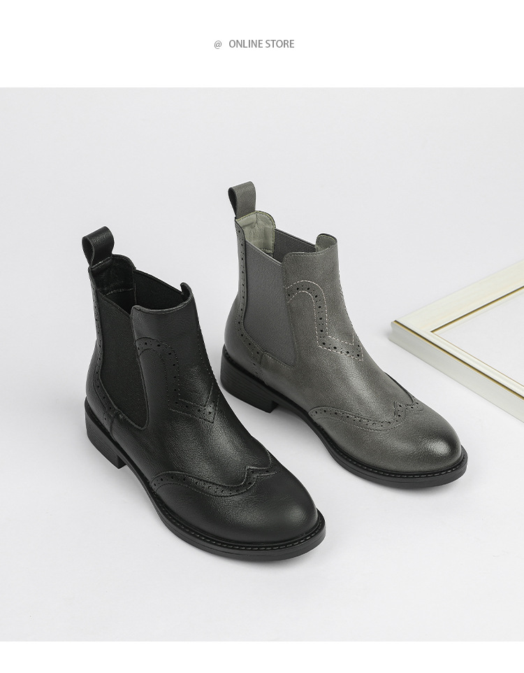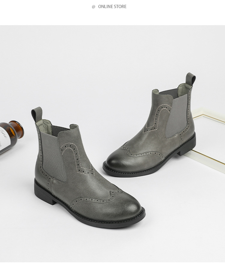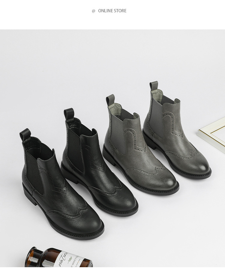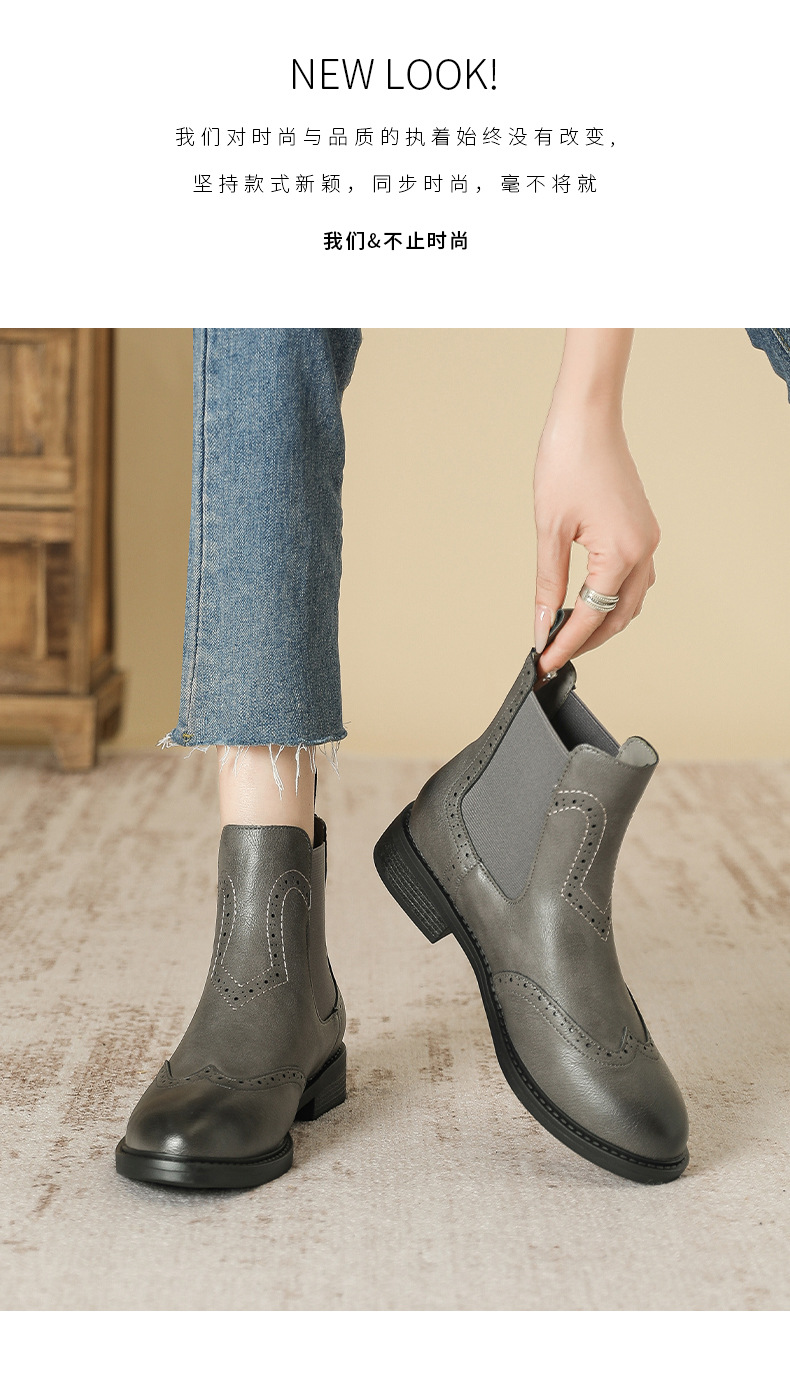 2024 새로운 라운드 발가락 첼시 부츠 여자 영국 브록 조각 짧은 부츠 트렌디 하이탑 신발 통근 소프트 Cowhide 부츠스토어 가기