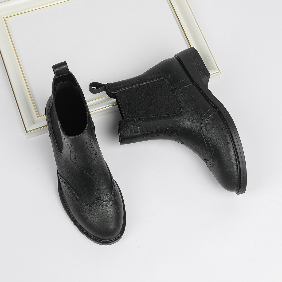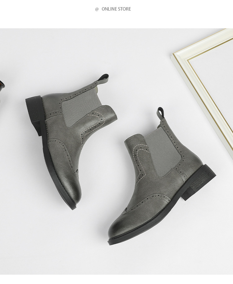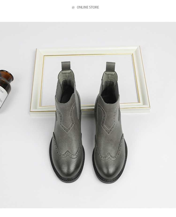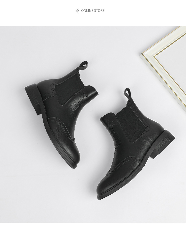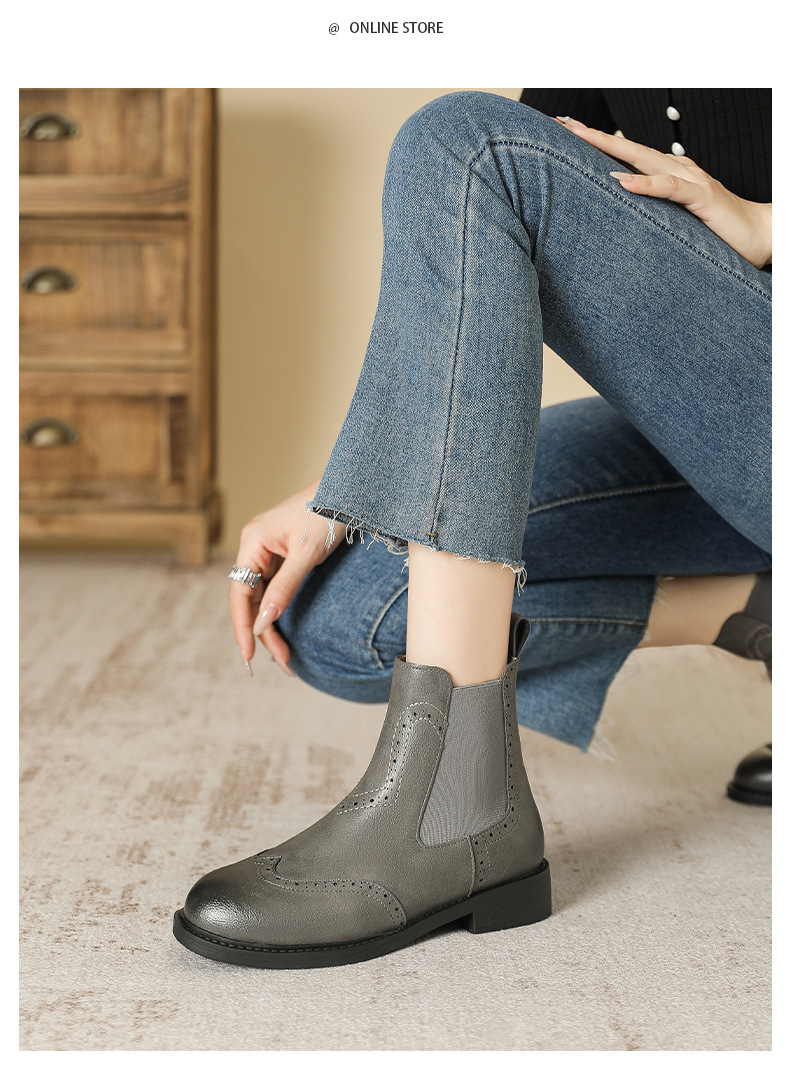 2024 새로운 라운드 발가락 첼시 부츠 여자 영국 브록 조각 짧은 부츠 트렌디 하이탑 신발 통근 소프트 Cowhide 부츠스토어 가기