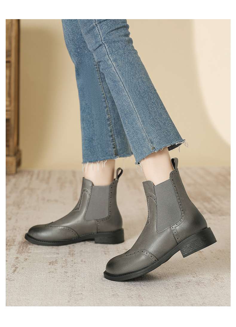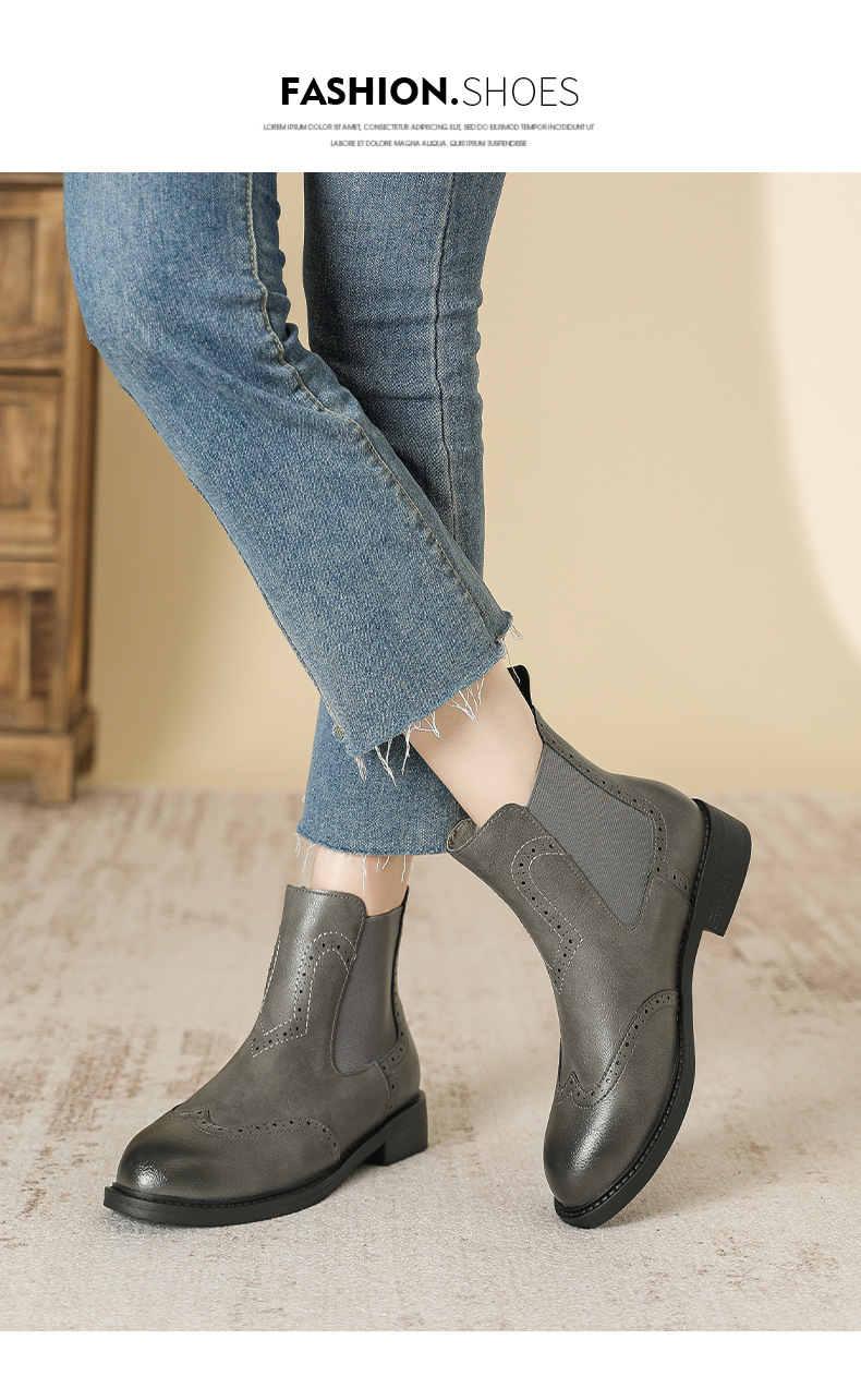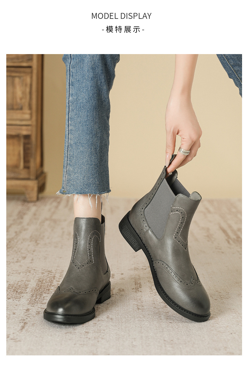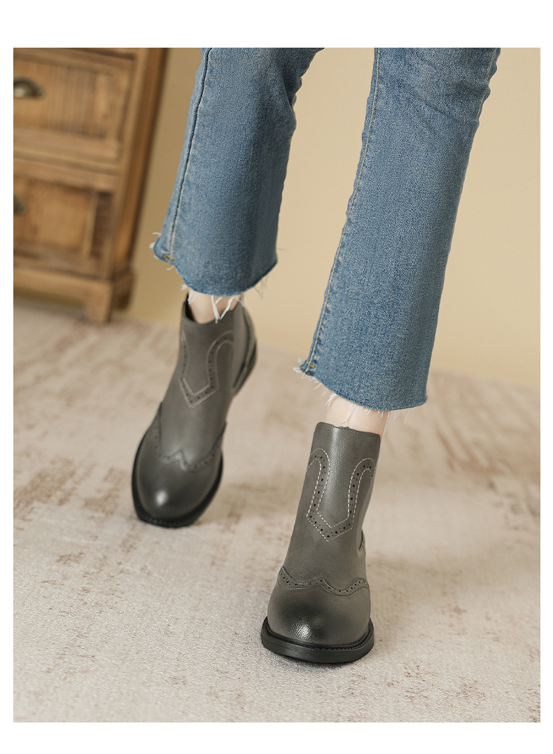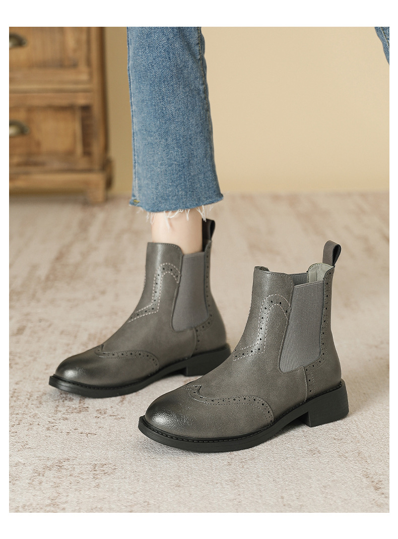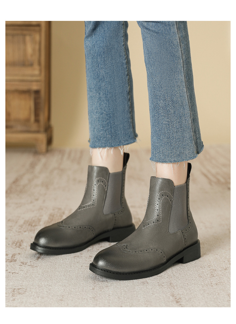 2024 새로운 라운드 발가락 첼시 부츠 여자 영국 브록 조각 짧은 부츠 트렌디 하이탑 신발 통근 소프트 Cowhide 부츠
