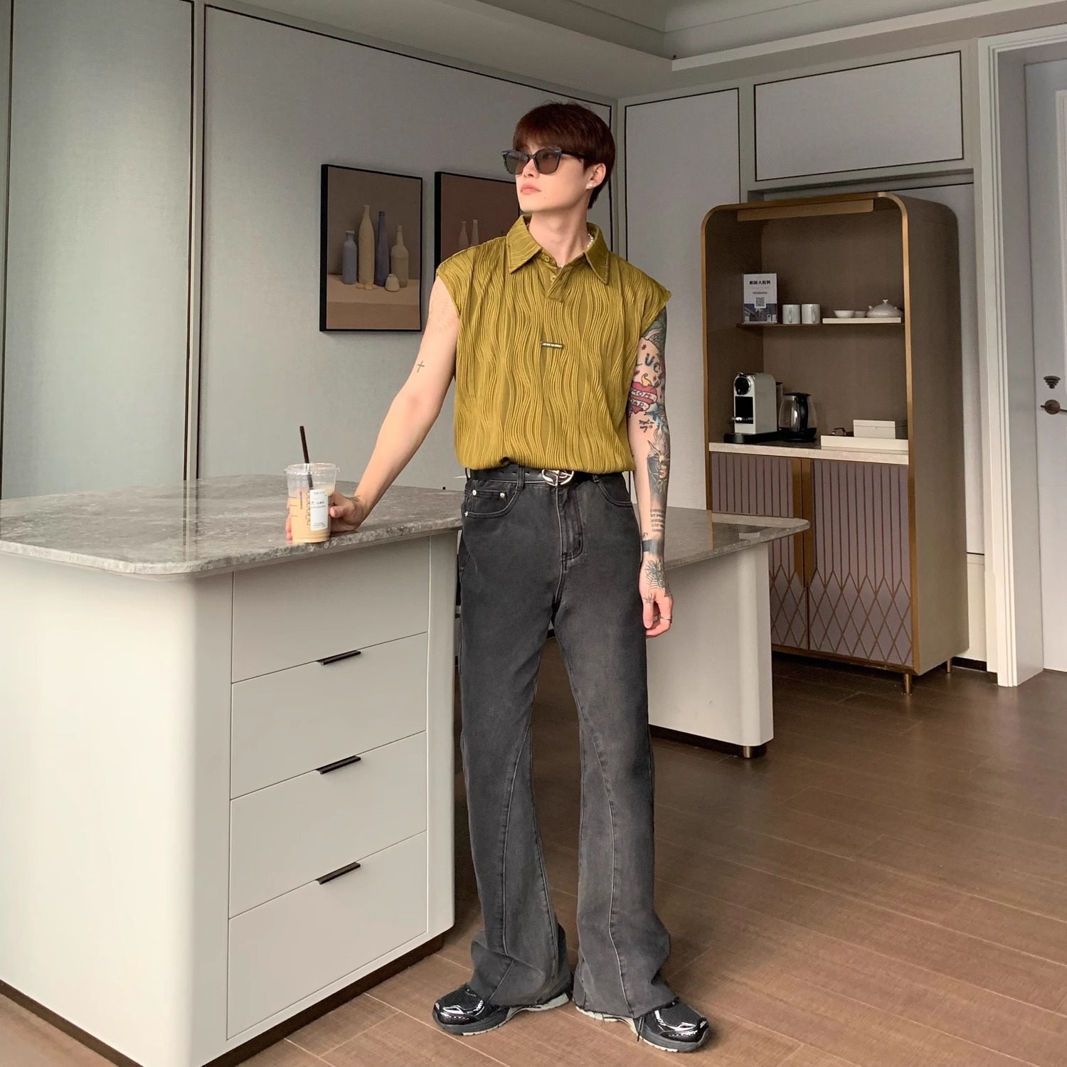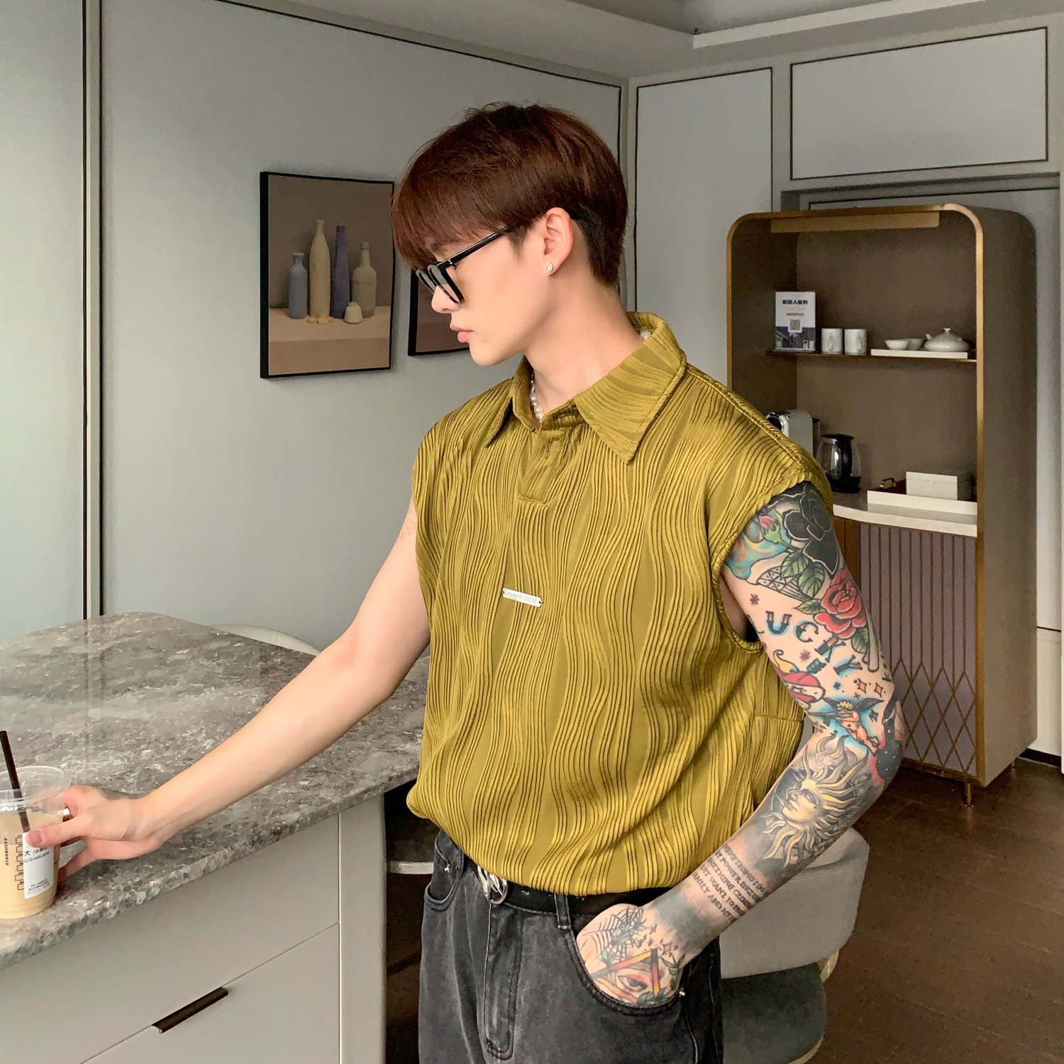여름 빈티지 디자인 센스 웨이브 스트라이프 아이스 실크 조끼 남성 패션 독특한 느슨한 허리 코트 패배 민소매 티셔츠스토어 가기