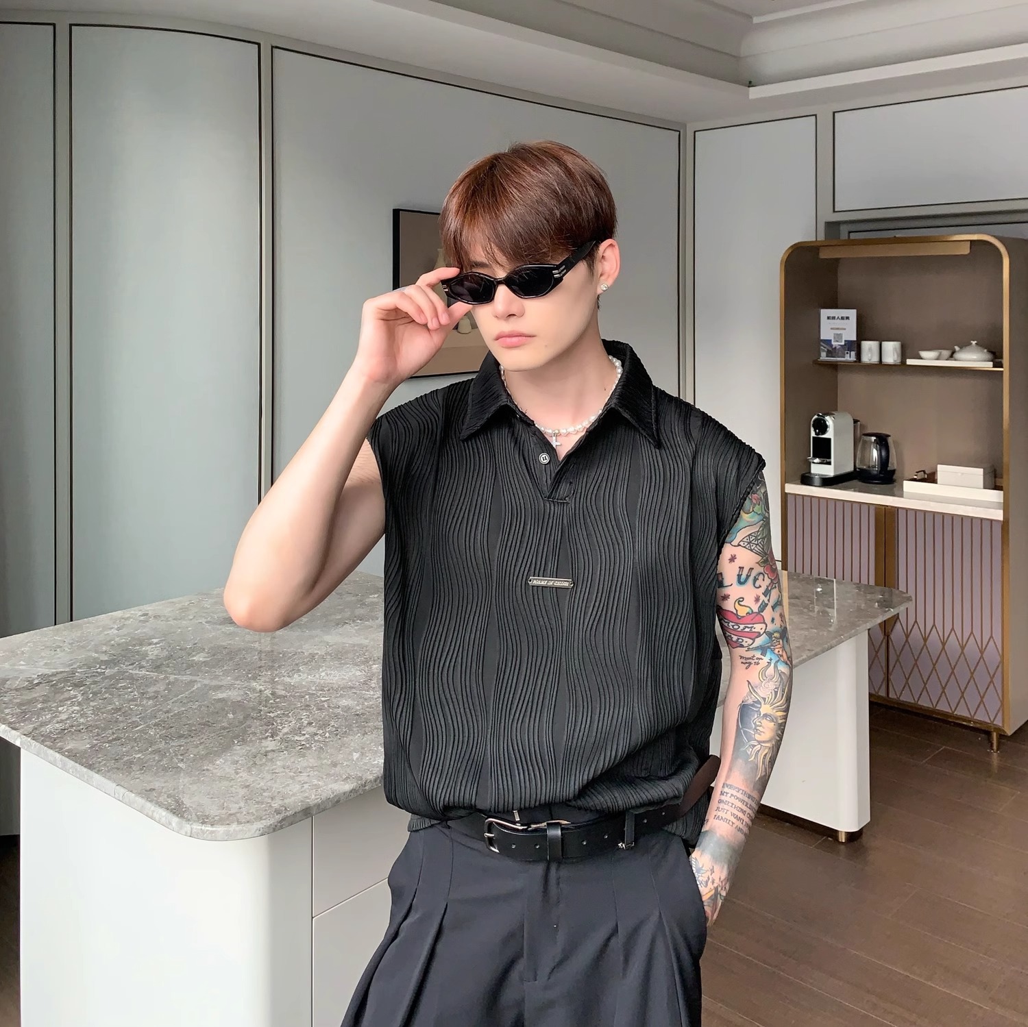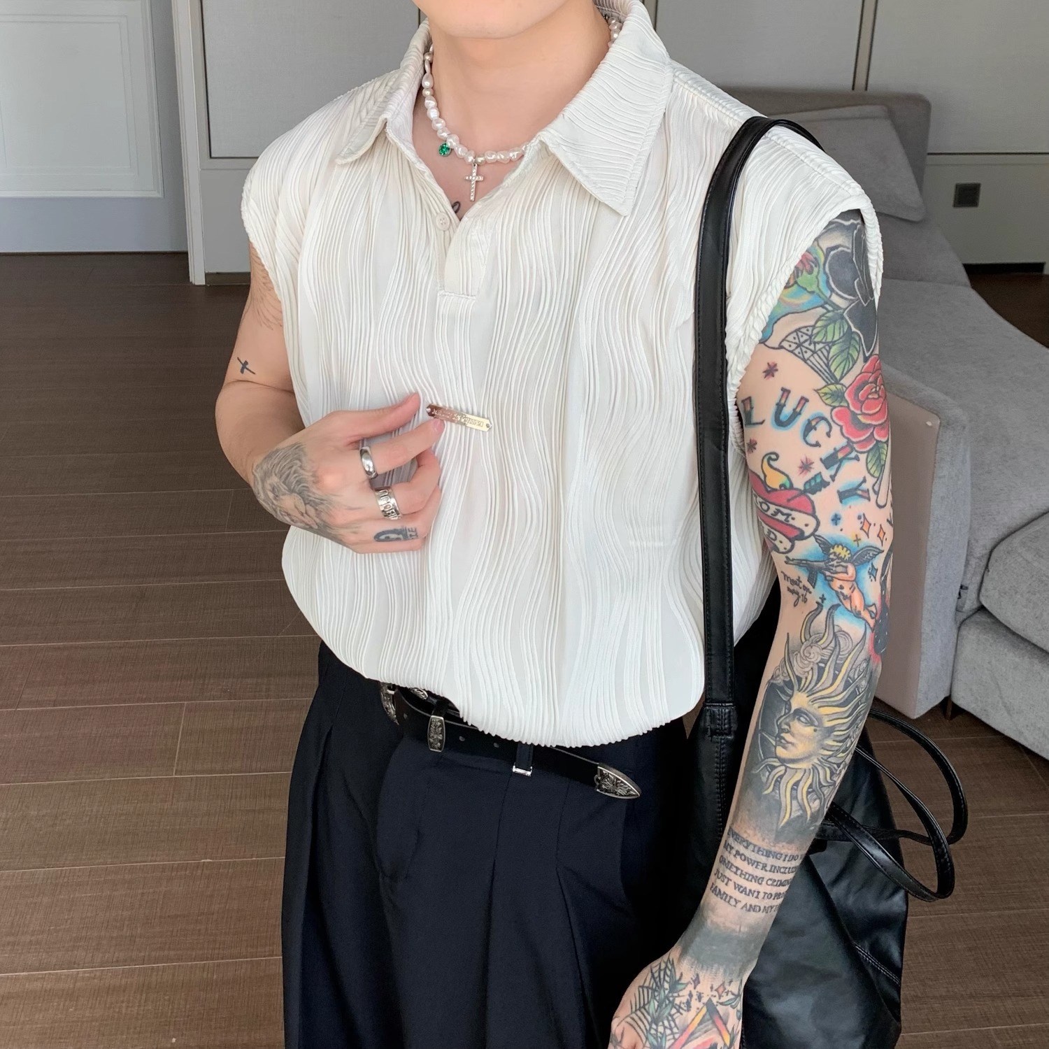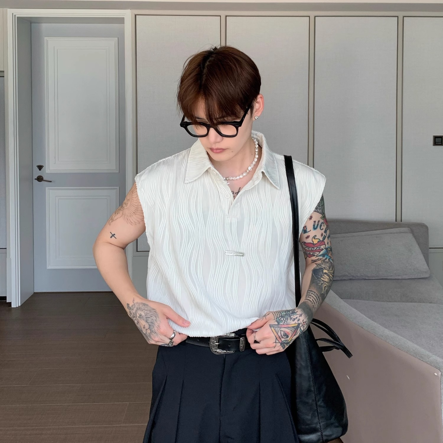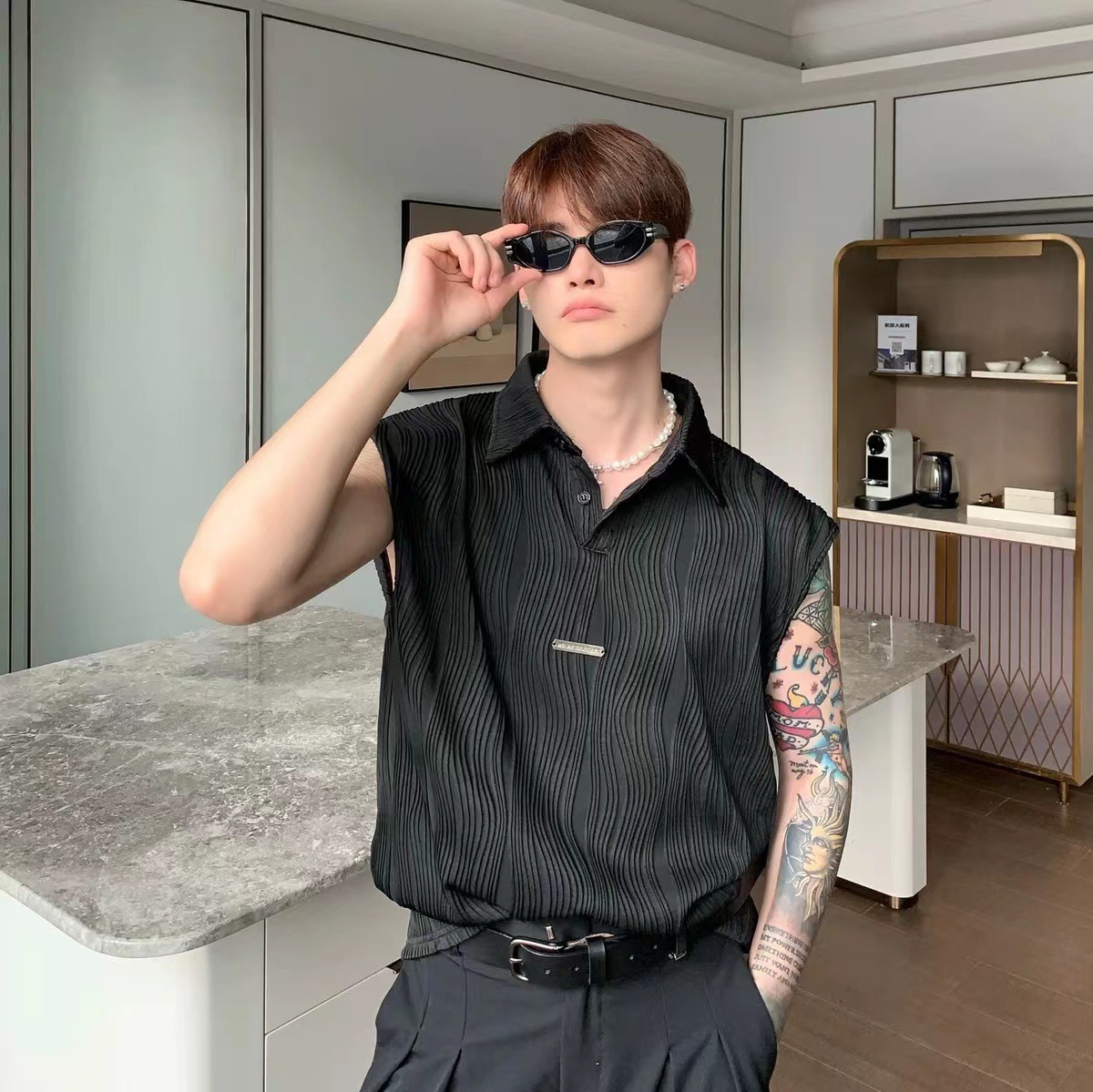 여름 빈티지 디자인 센스 웨이브 스트라이프 아이스 실크 조끼 남성 패션 독특한 느슨한 허리 코트 패배 민소매 티셔츠