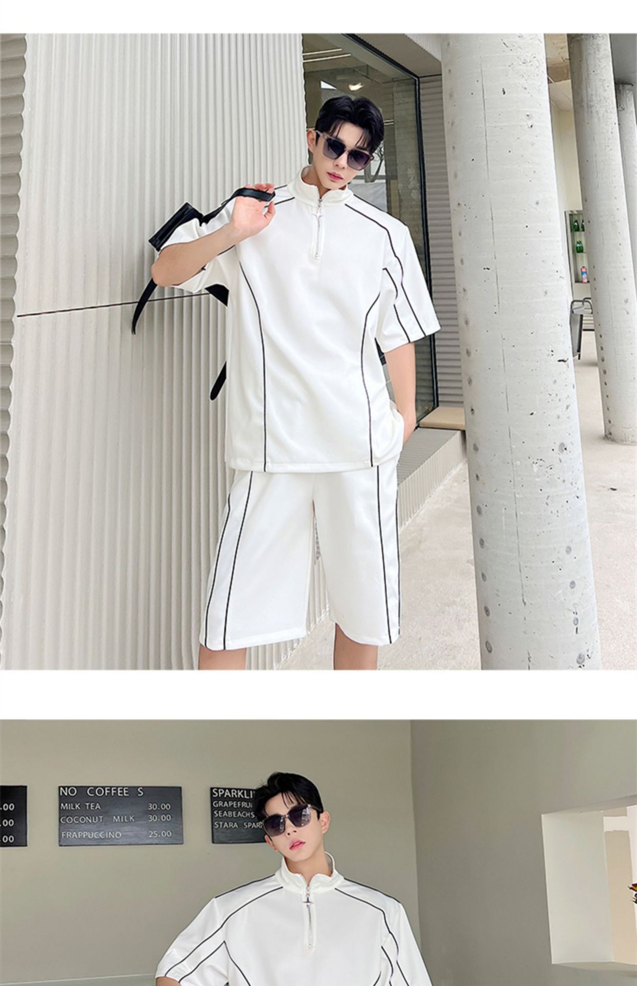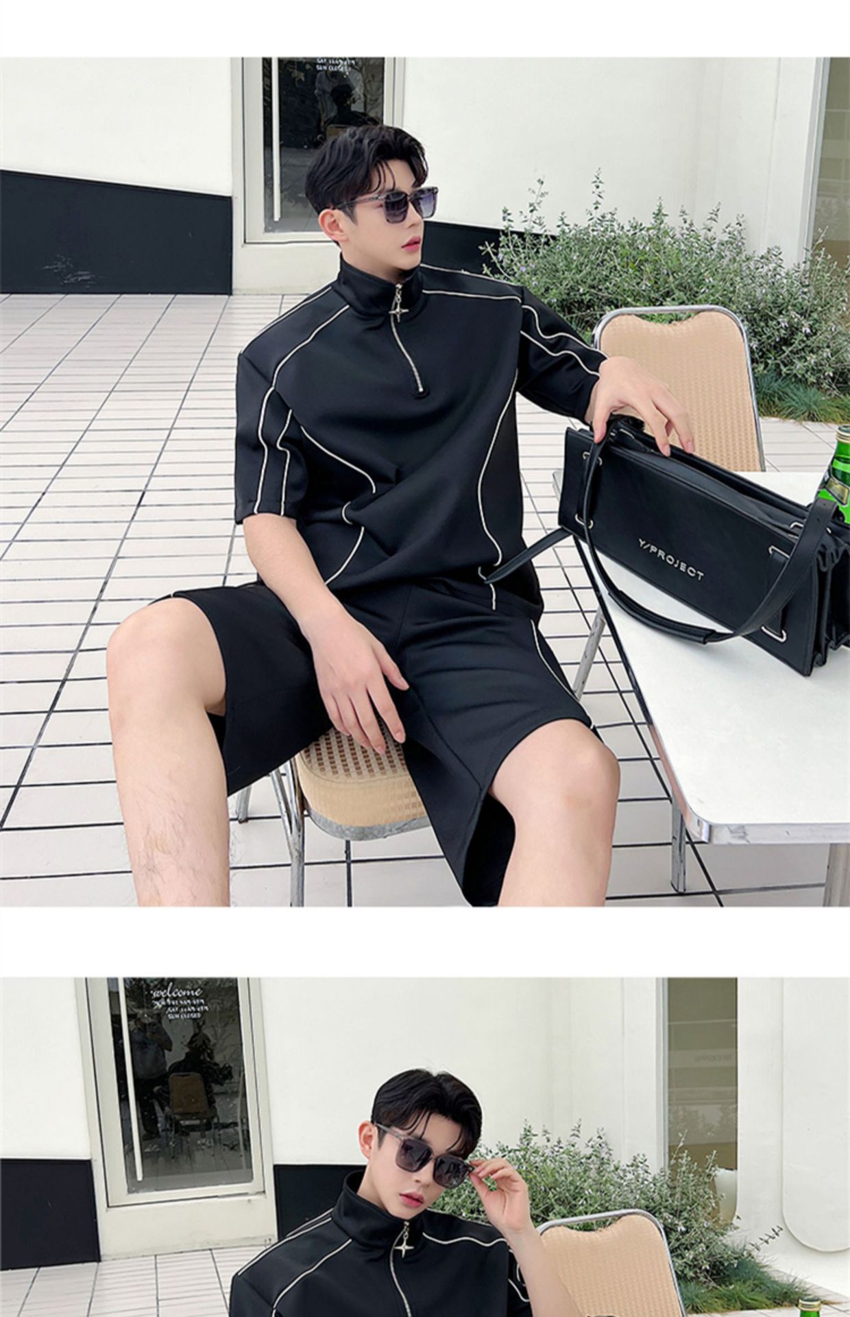 여름 하이 엔드 느낌 ruffian 잘 생긴 캐주얼 스포츠 세트 남자 한국식 느슨한 하프 지퍼 티셔츠 틈새 반바지 투피스 세트스토어 가기