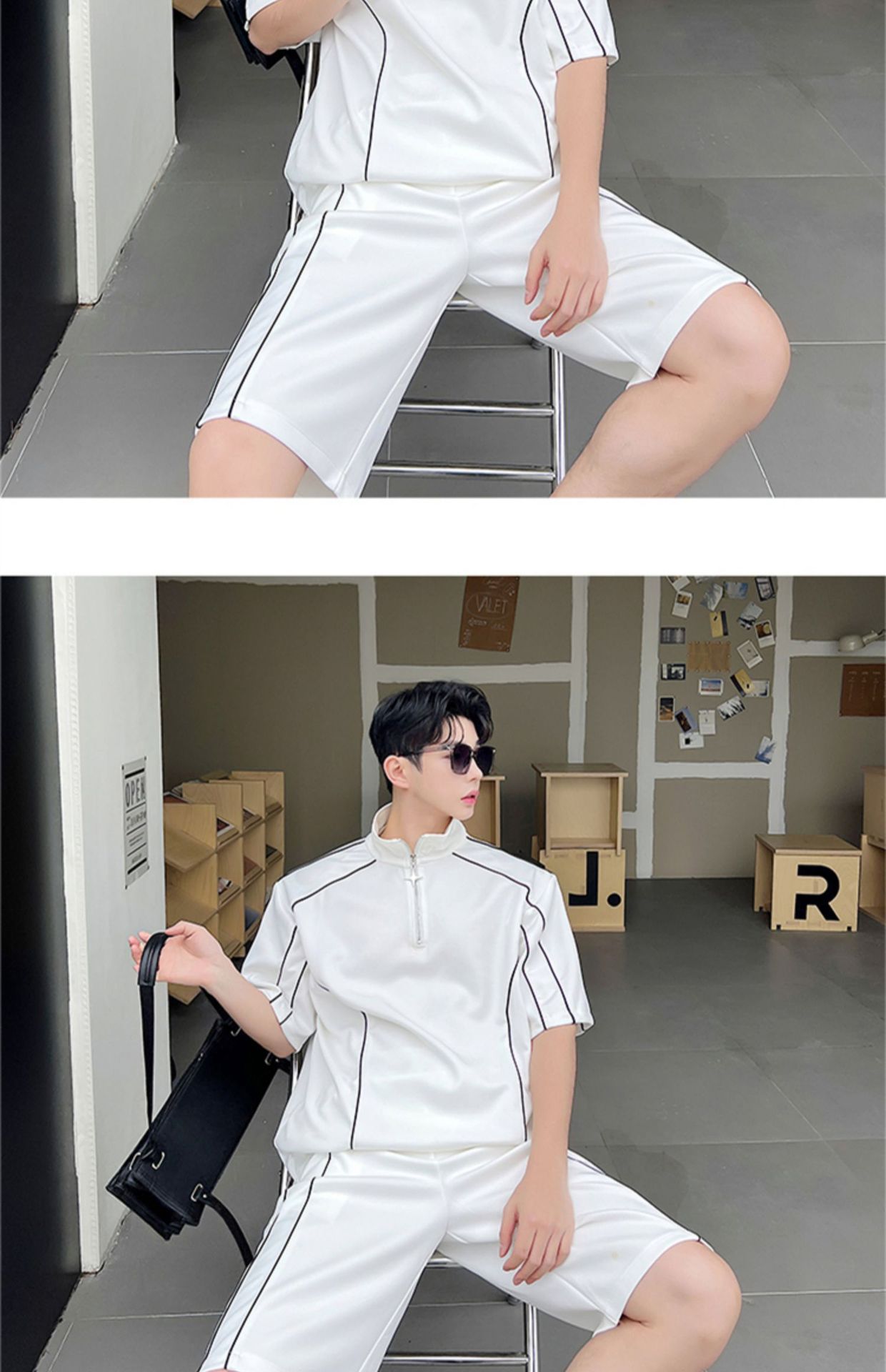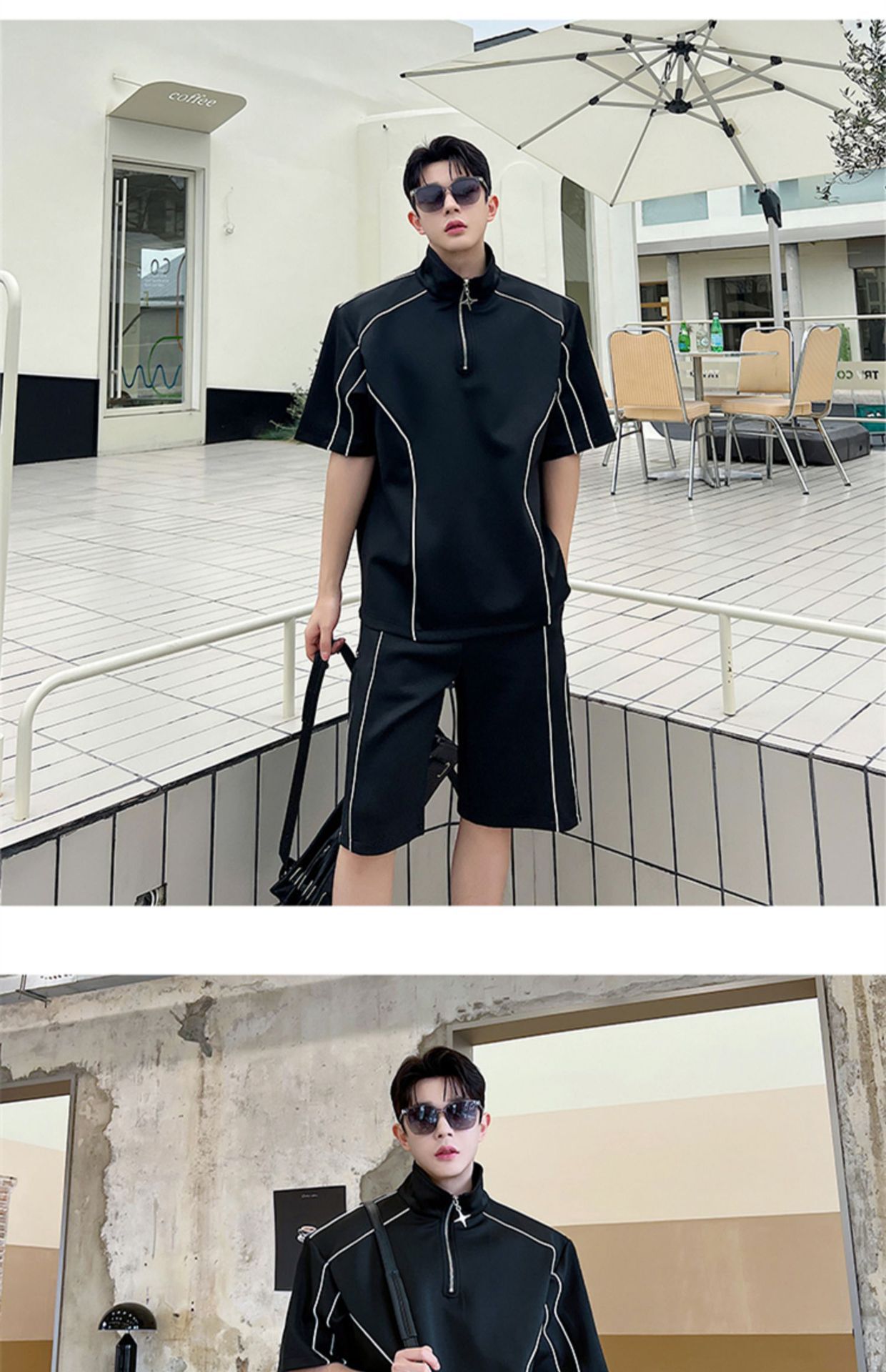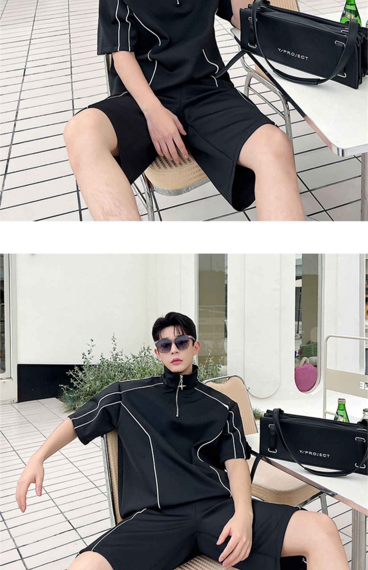 여름 하이 엔드 느낌 ruffian 잘 생긴 캐주얼 스포츠 세트 남자 한국식 느슨한 하프 지퍼 티셔츠 틈새 반바지 투피스 세트