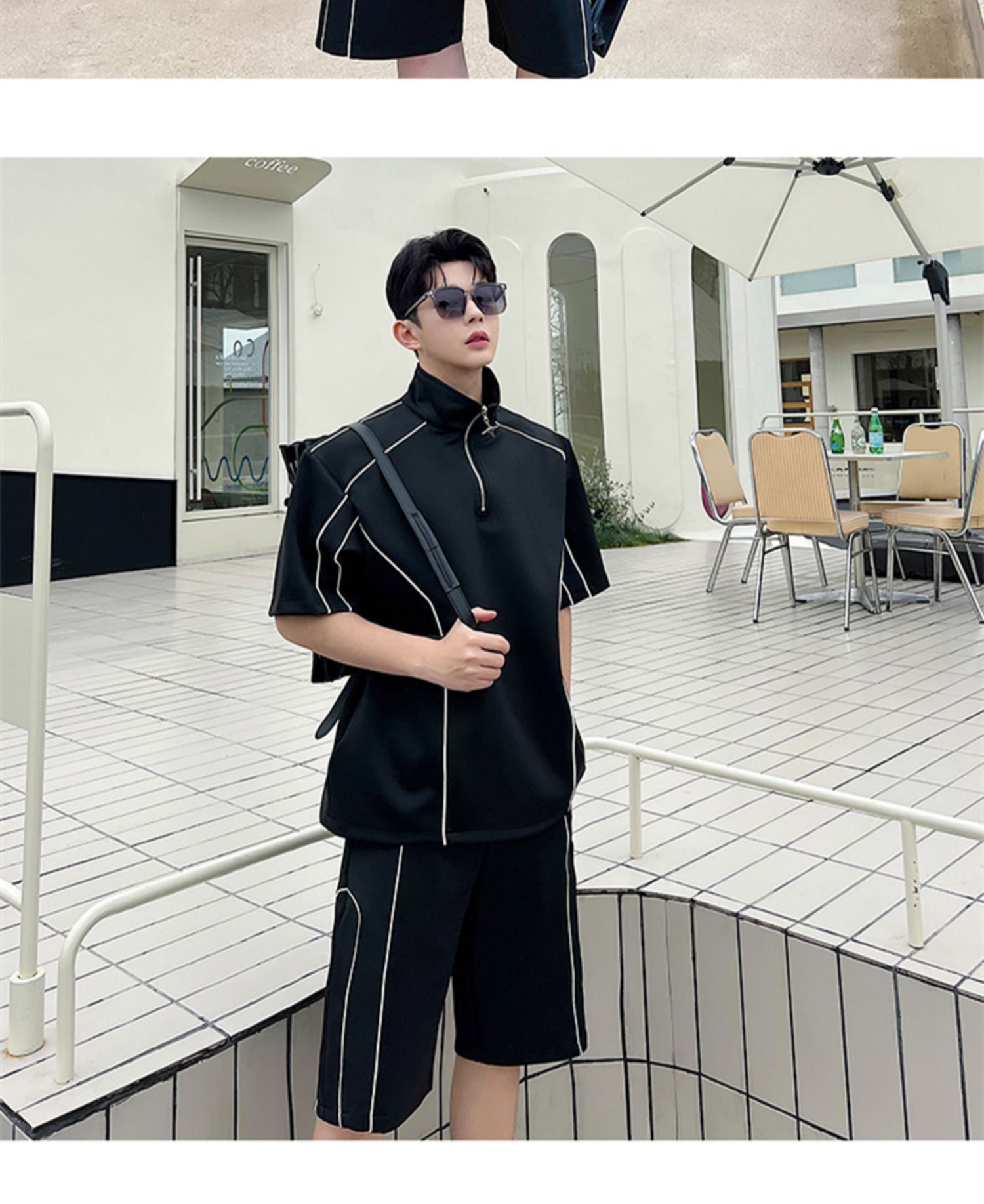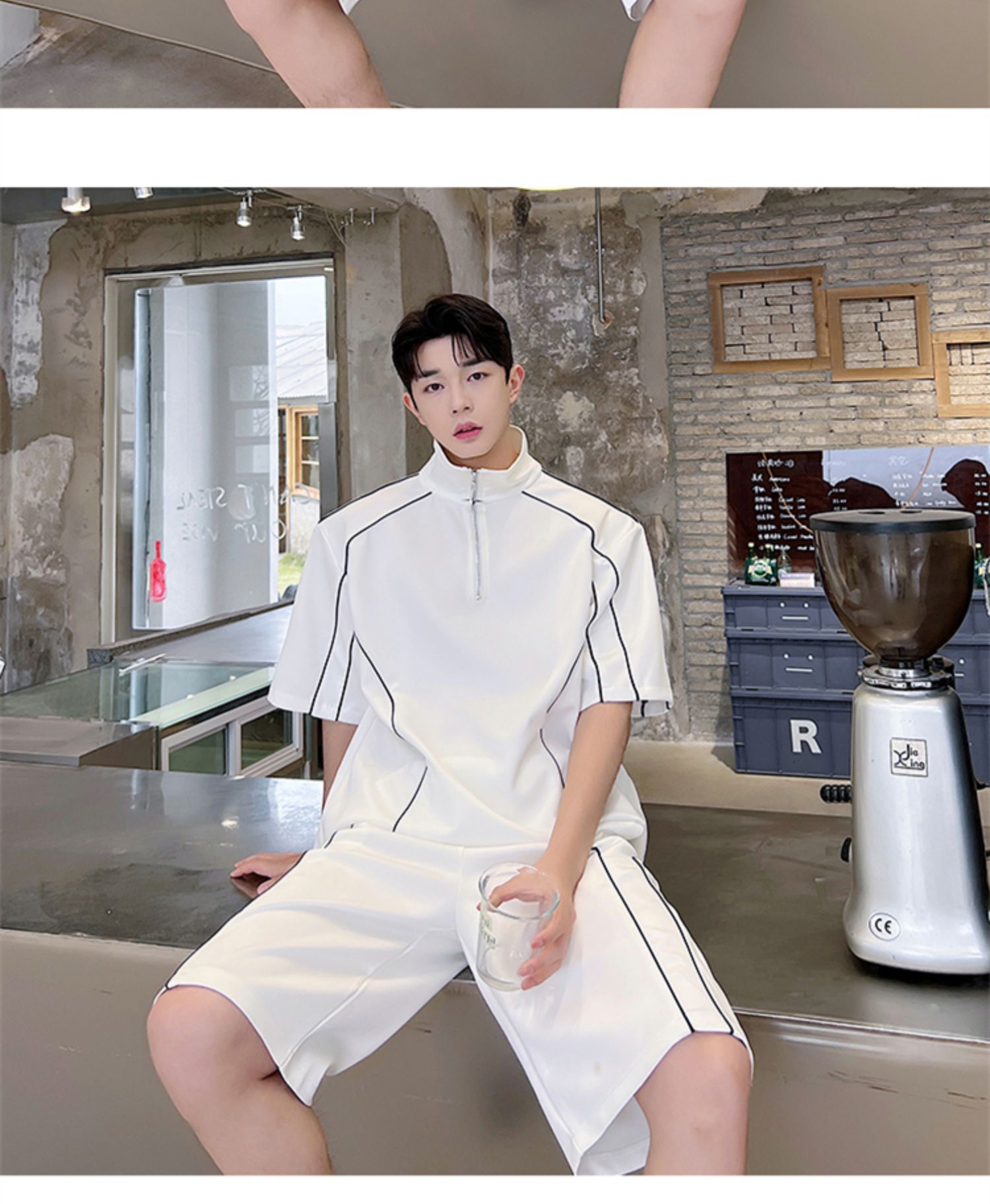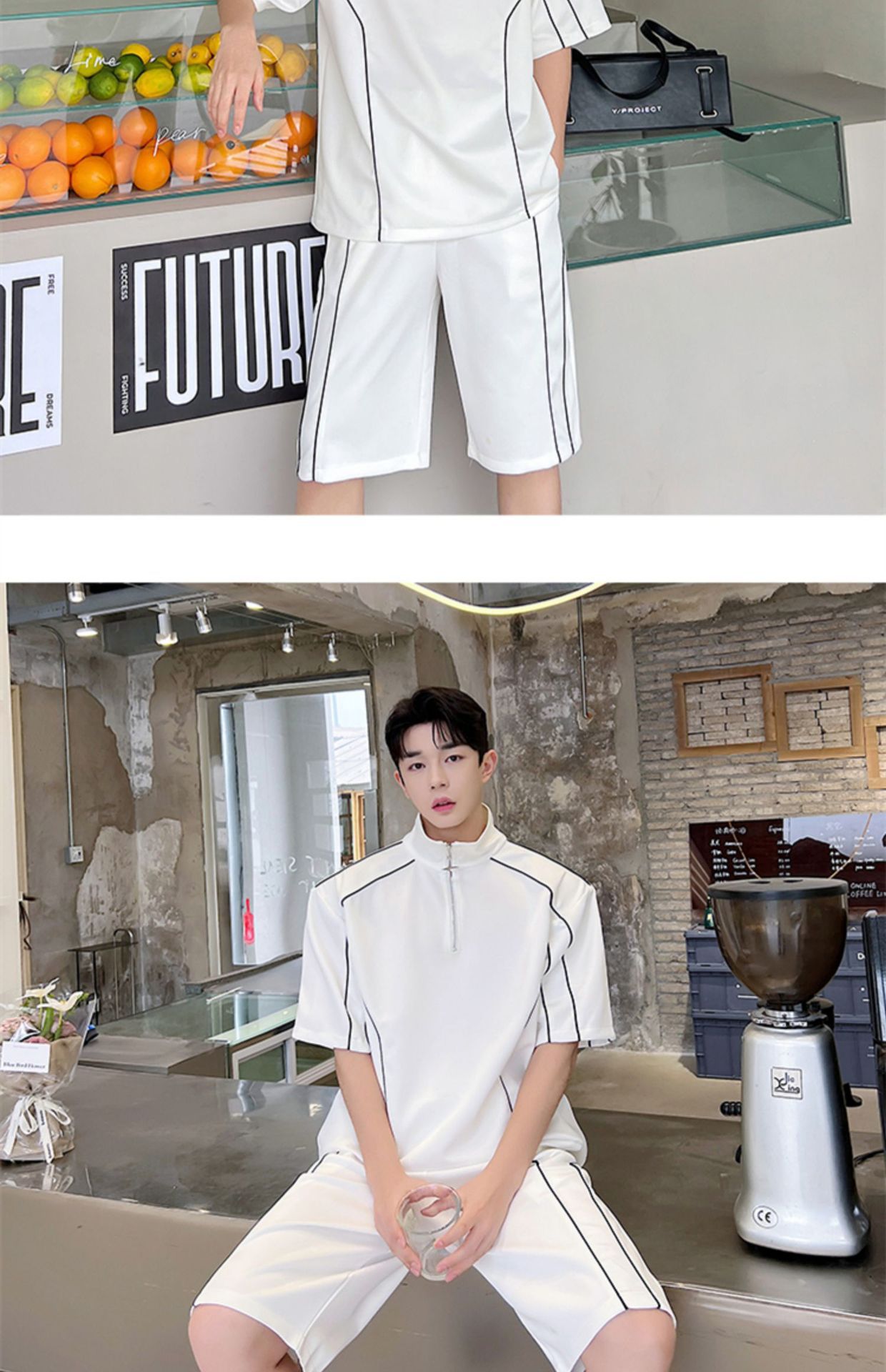 여름 하이 엔드 느낌 ruffian 잘 생긴 캐주얼 스포츠 세트 남자 한국식 느슨한 하프 지퍼 티셔츠 틈새 반바지 투피스 세트