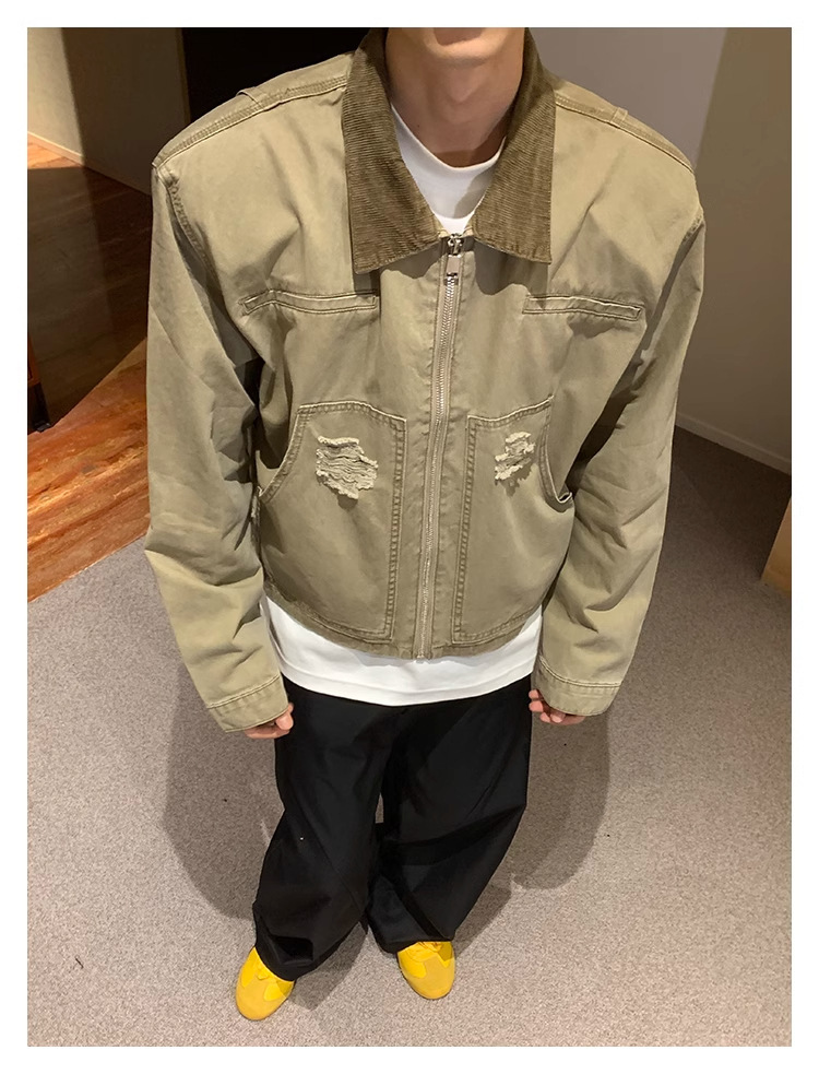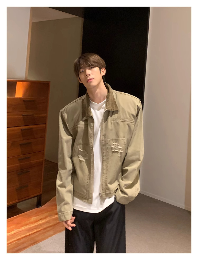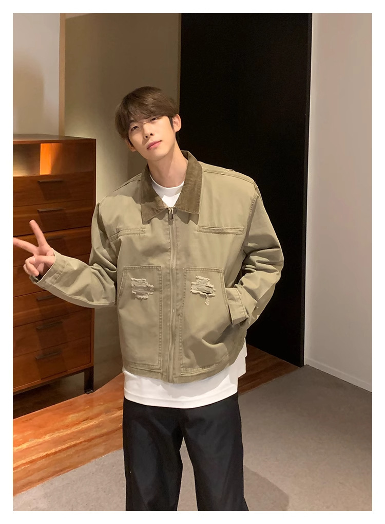 한국 스타일 복고풍 오래된 파괴 데님 재킷 남자의 봄과 가을 새로운 느슨한 라젤 크록 재킷 트렌디 탑스토어 가기