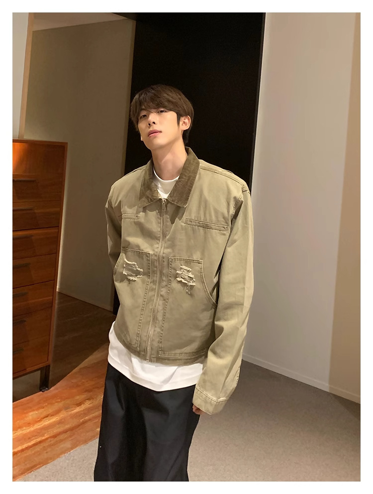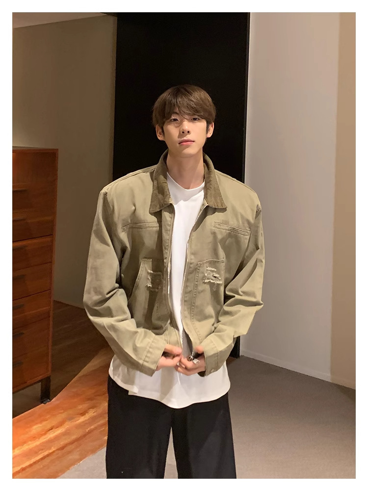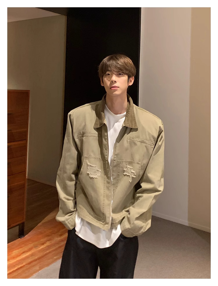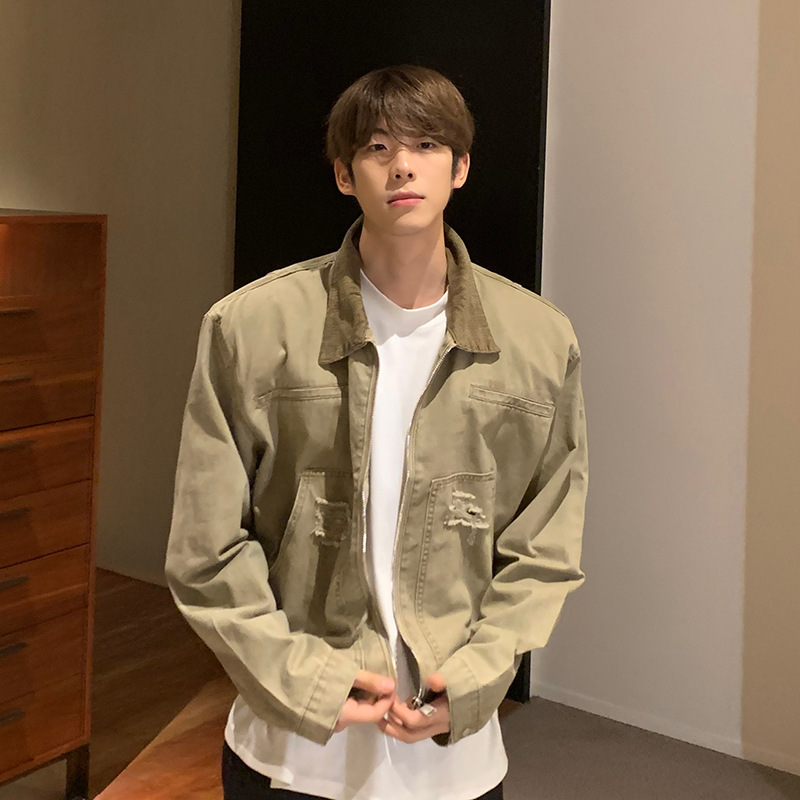 한국 스타일 복고풍 오래된 파괴 데님 재킷 남자의 봄과 가을 새로운 느슨한 라젤 크록 재킷 트렌디 탑
