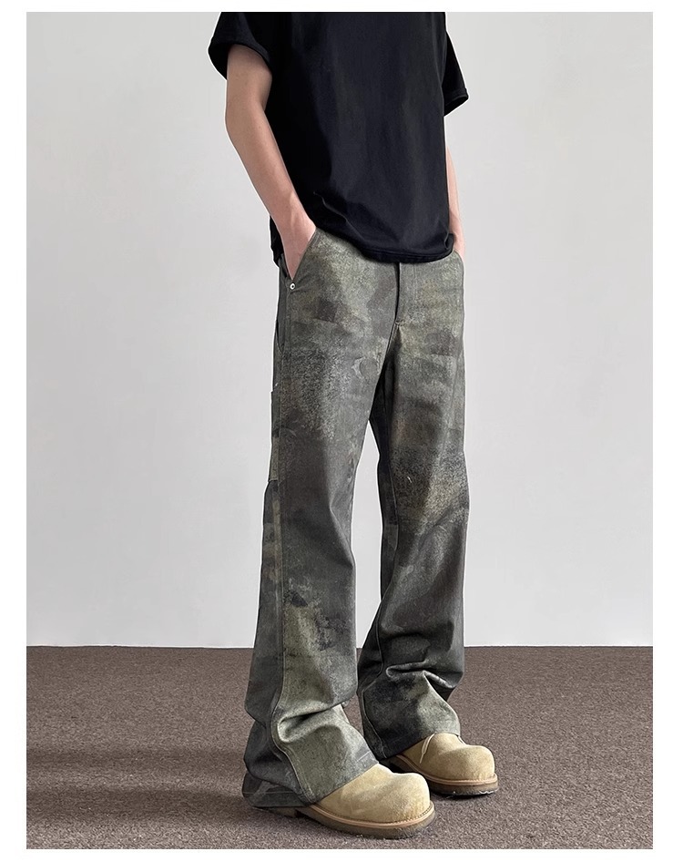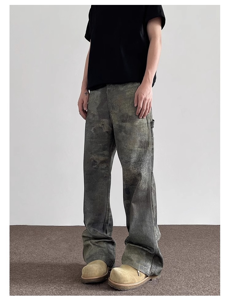 매일 고민 된 퇴색 한 위장 마이크로 lar 빈티지 청바지 트렌디 한 스트레이트 지퍼 정사이즈 바지 넓은 다리 바지 중간 허리 유행스토어 가기