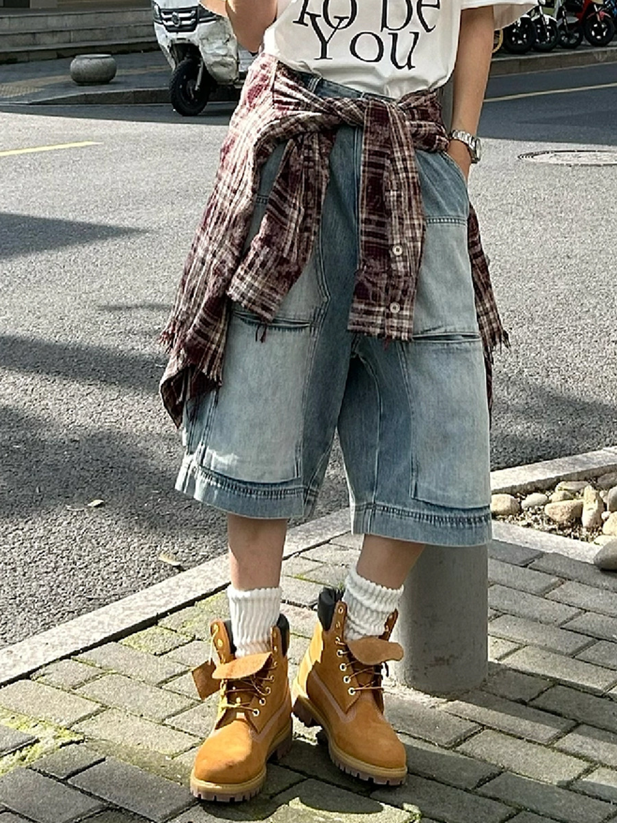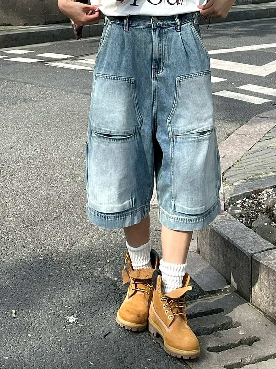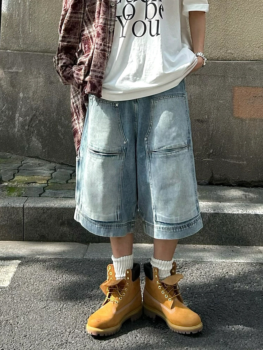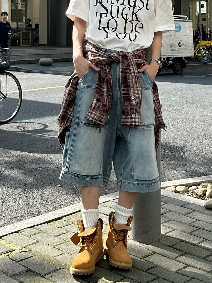 아메리칸 스타일 하이 스트리트 멀티 포켓 툴링 데님 반바지 남자 레트로 니치 올 매치 루즈 스트레이트 미드 팬츠 크롭 트렌디 팬츠스토어 가기