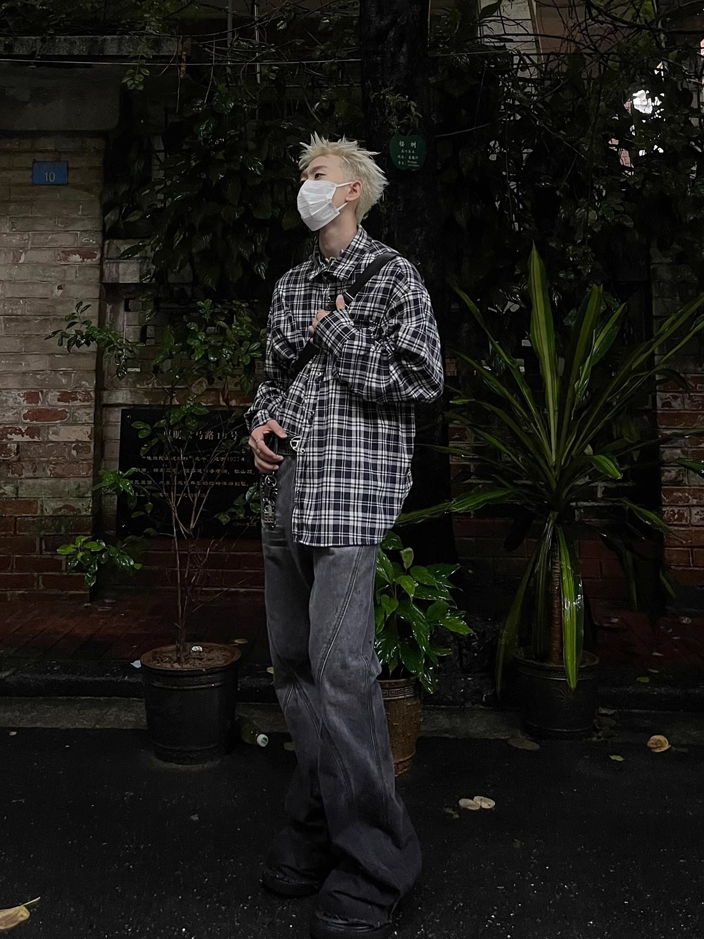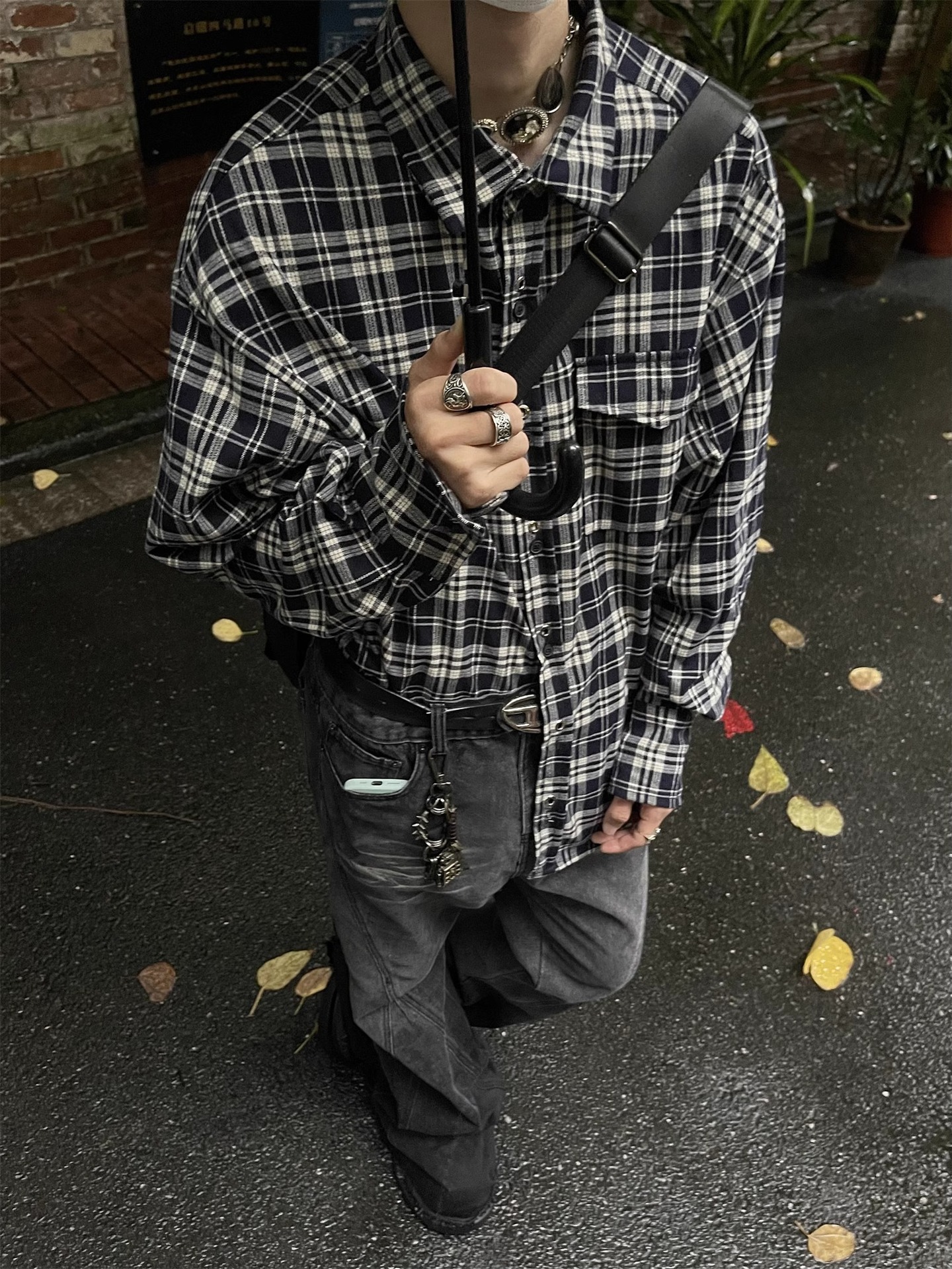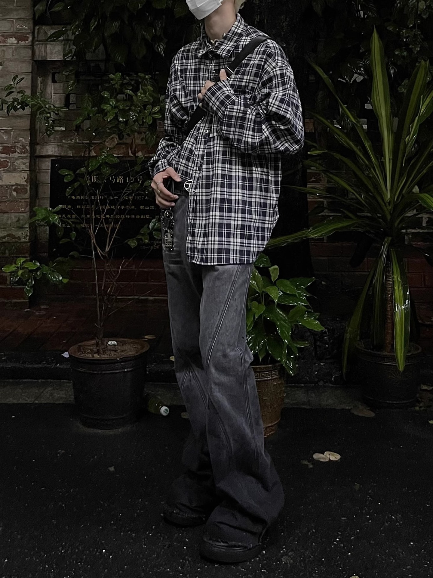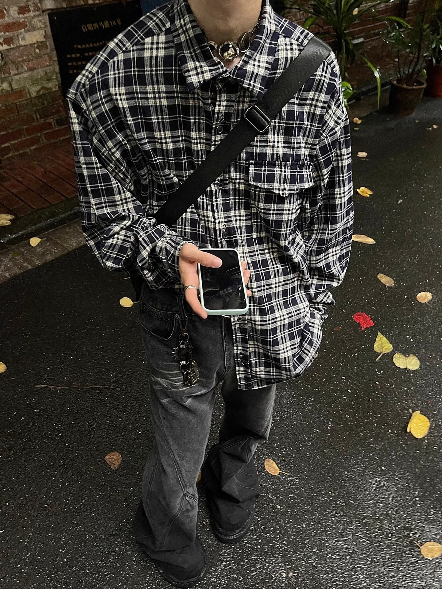 미국 스타일 느슨한 게으른 스타일 흑백 격자 무늬 셔츠 남자의 봄과 가을 새로운 스타일 체크 무늬 셔츠 캐주얼 코트 Ins 트렌디스토어 가기