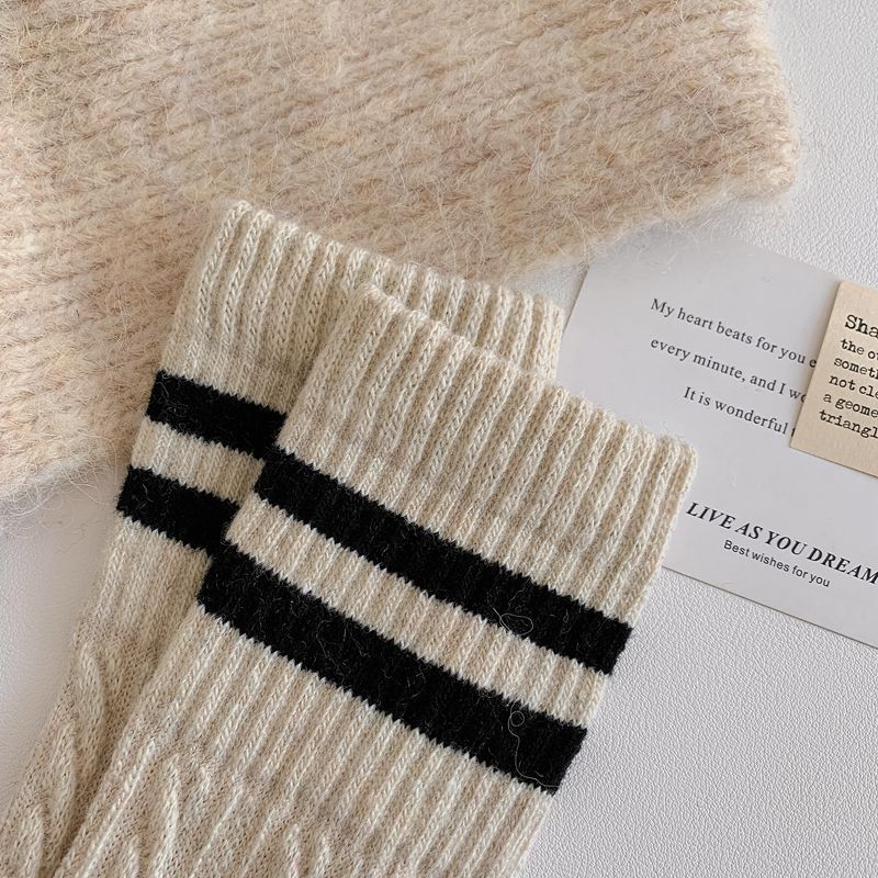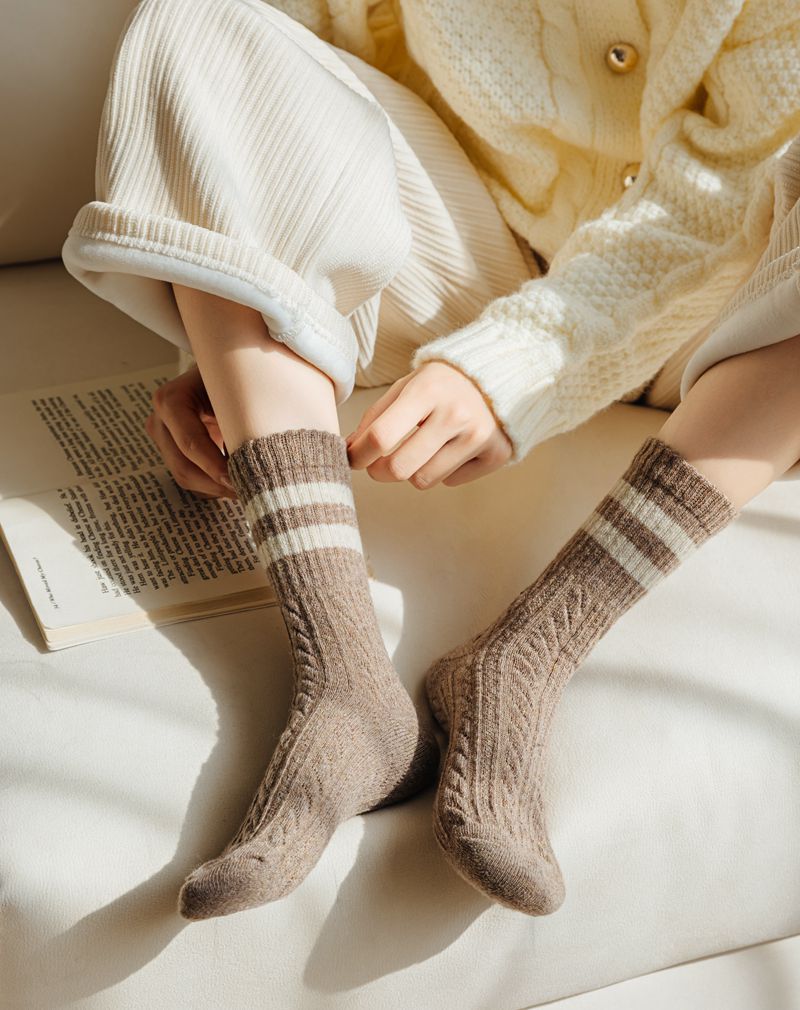 가을과 겨울 따뜻한 양모 트위스트 양말 여성용 한국식 2 바 두꺼운 미드 튜브 양말 빈티지 캐시미어 더미 여성용 양말
