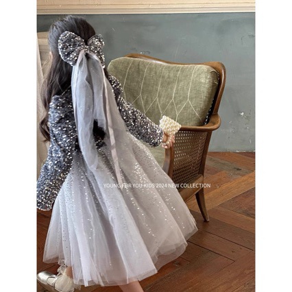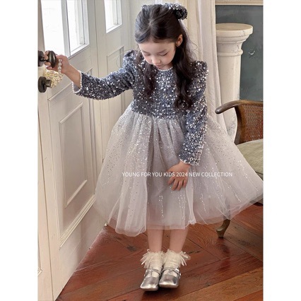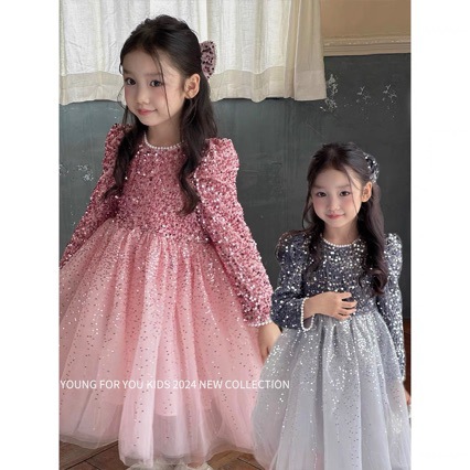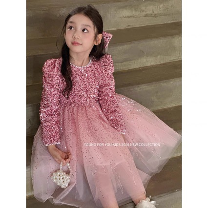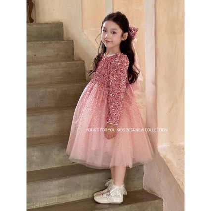 24 가을과 겨울 소녀 중공업 반짝이 스퀸 공주 원피스 핑크 원피스 생일 원피스 성능 메쉬 원피스 OU
