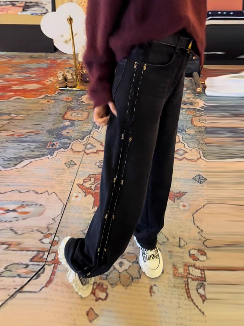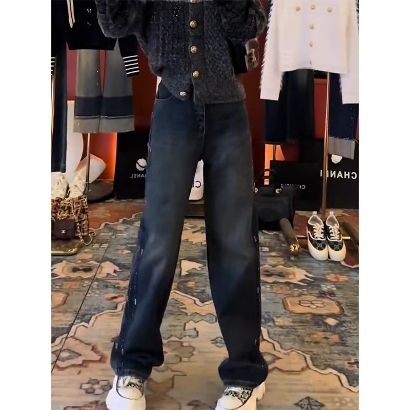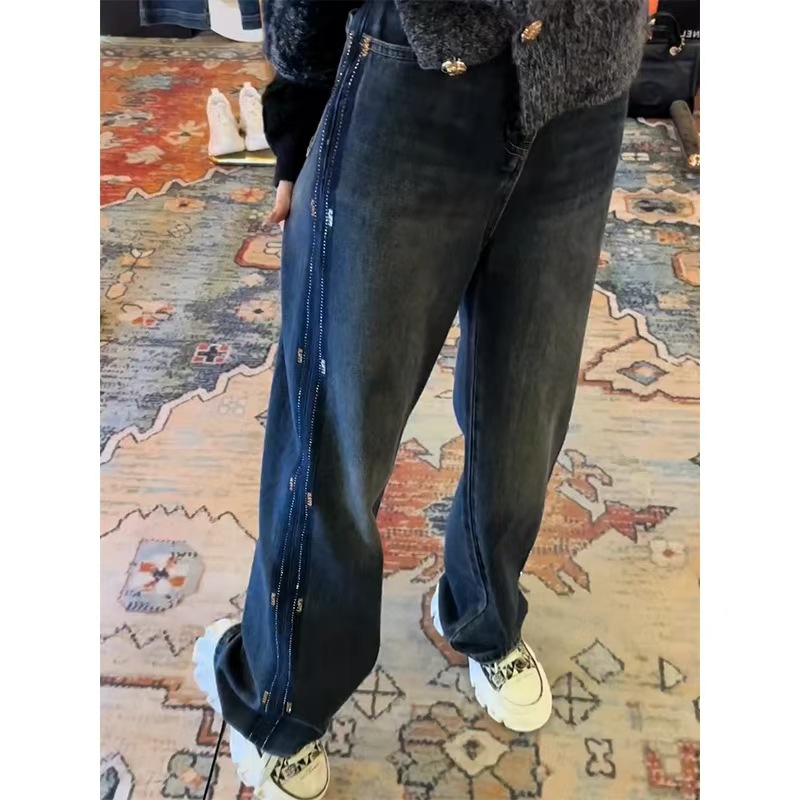 Ins 콘트라스트 컬러 핫 드릴링 데님 바지 여성 트렌디 2024 새로운 가을 높은 허리 느슨한 올매치 와이드 다리 바지스토어 가기