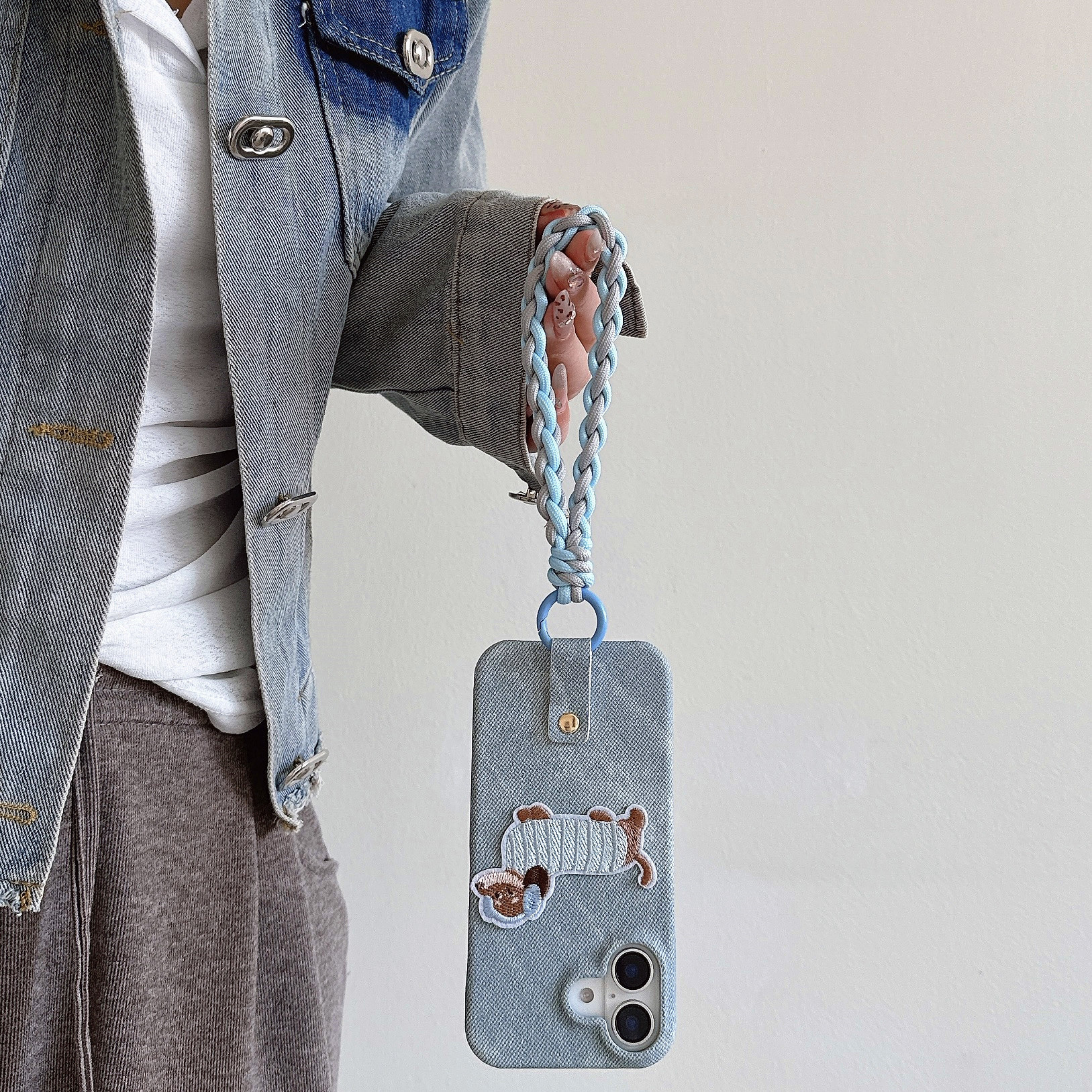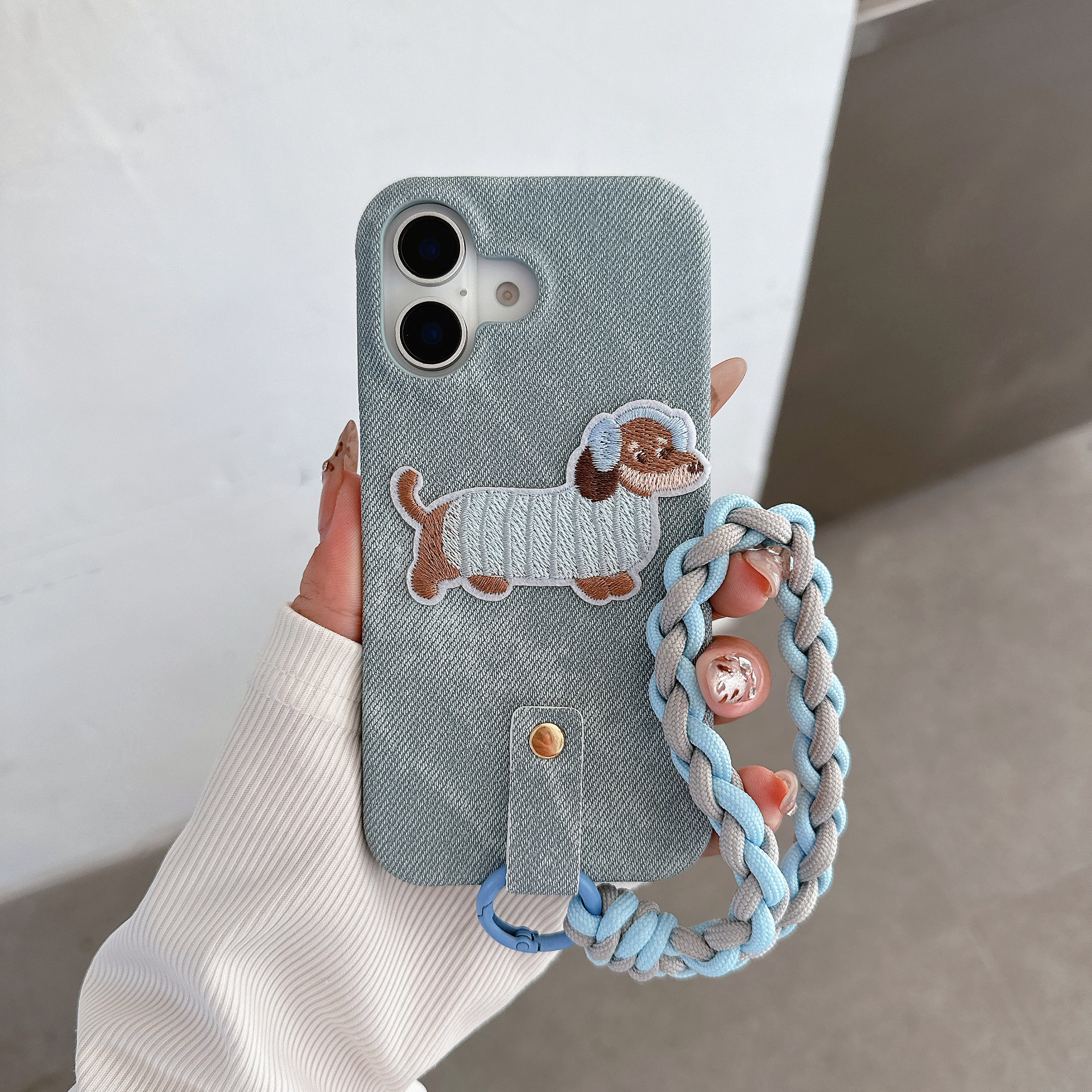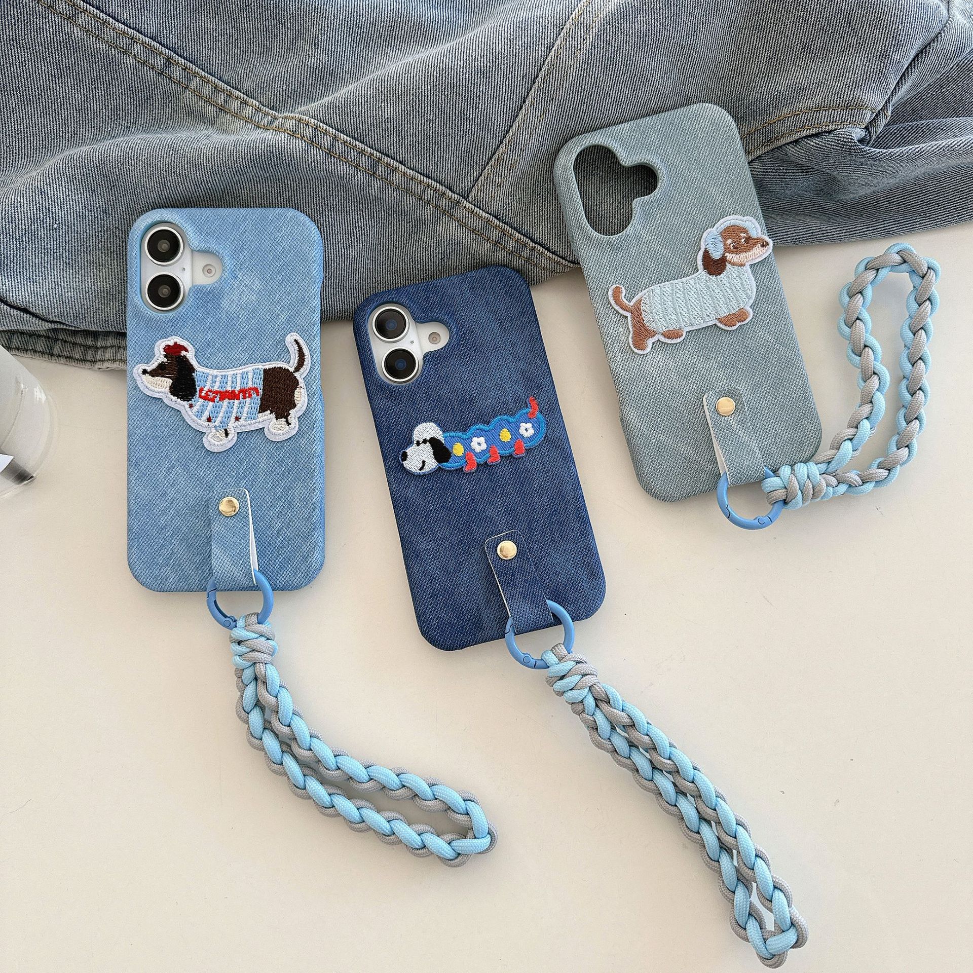iPhone15 강아지 자수는 Apple 16 휴대폰 케이스, 삼성 S25U 우븐 팔찌 S24 데님 17p에 적합합니다.