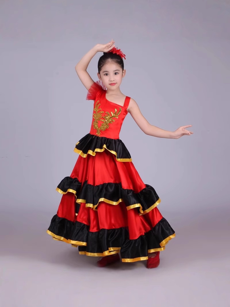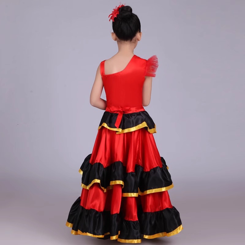 새로운 어린이 스페인 댄스 빅 스윙 원피스 공연 의상 불 댄스 의상 스커트 어린이 공연 의상 여성