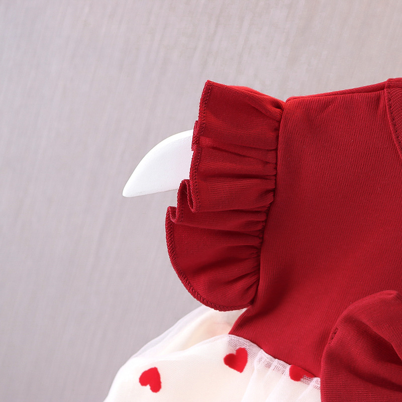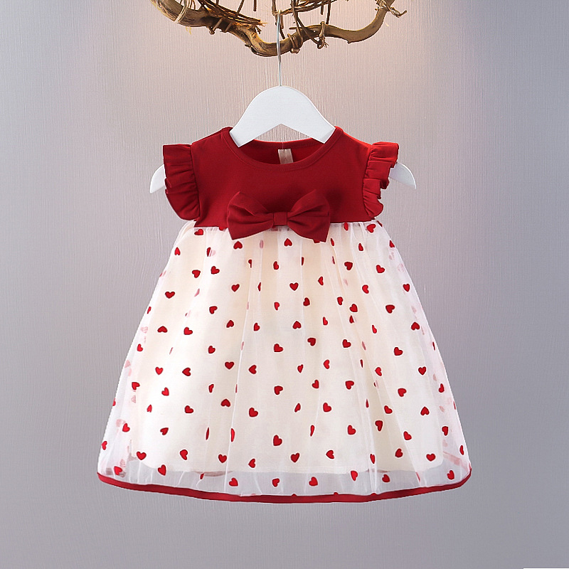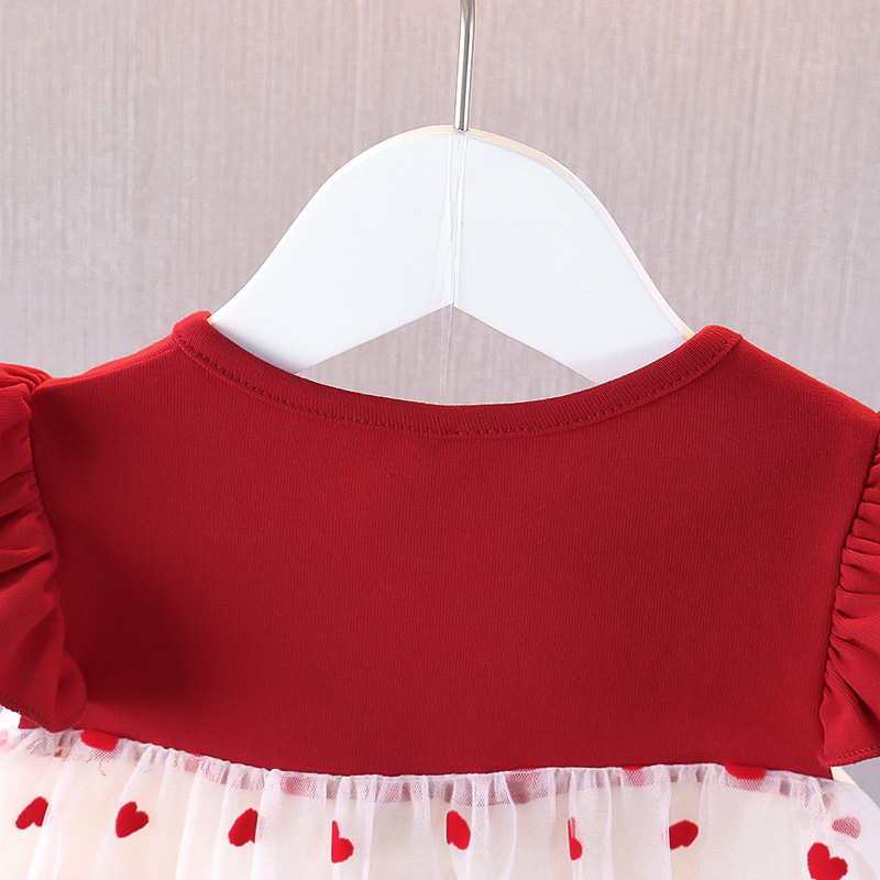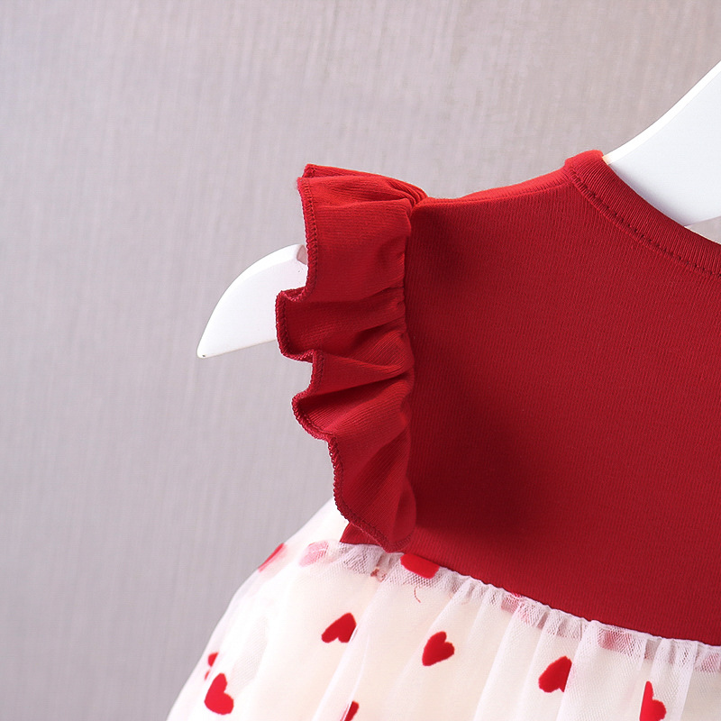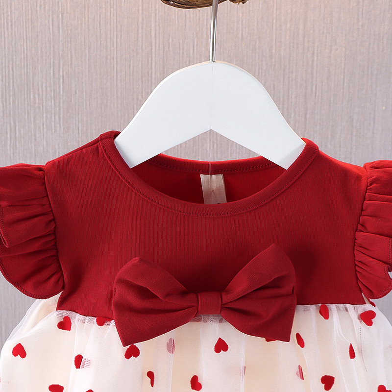 2025 여름 보우 플라잉 슬리브 스커트 소녀 한국 스타일 작은 사랑 메쉬 스커트 한 살 빨간 공주 코튼 드레스