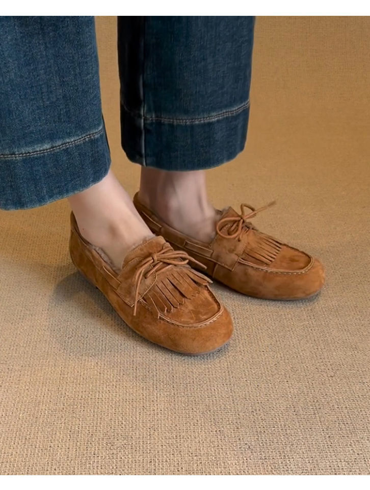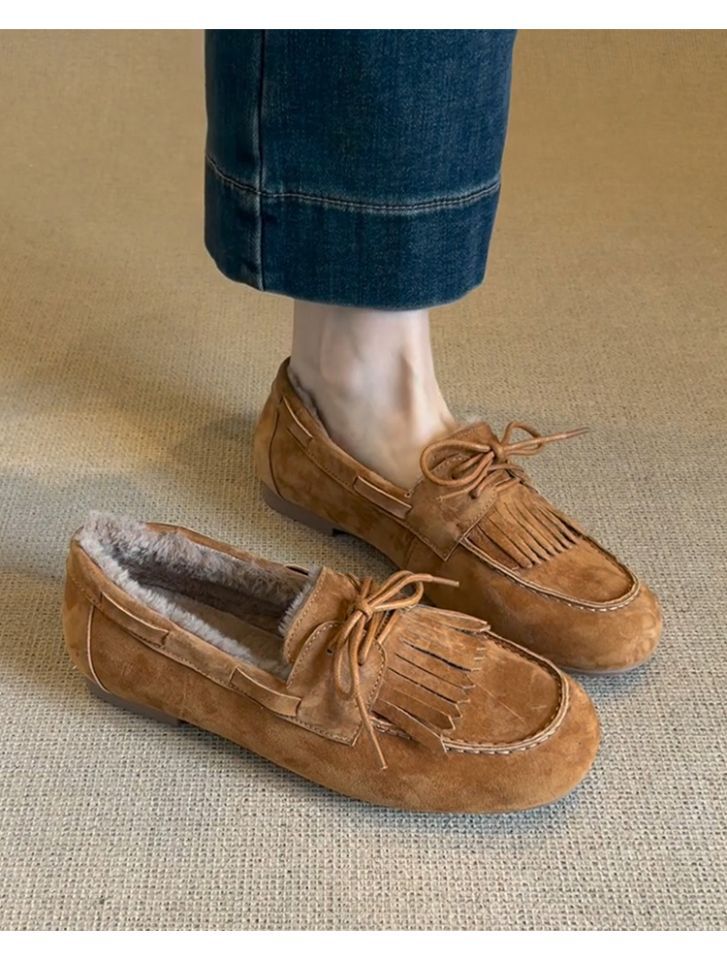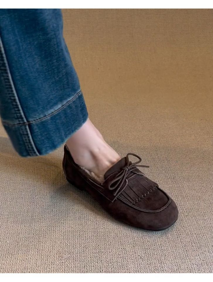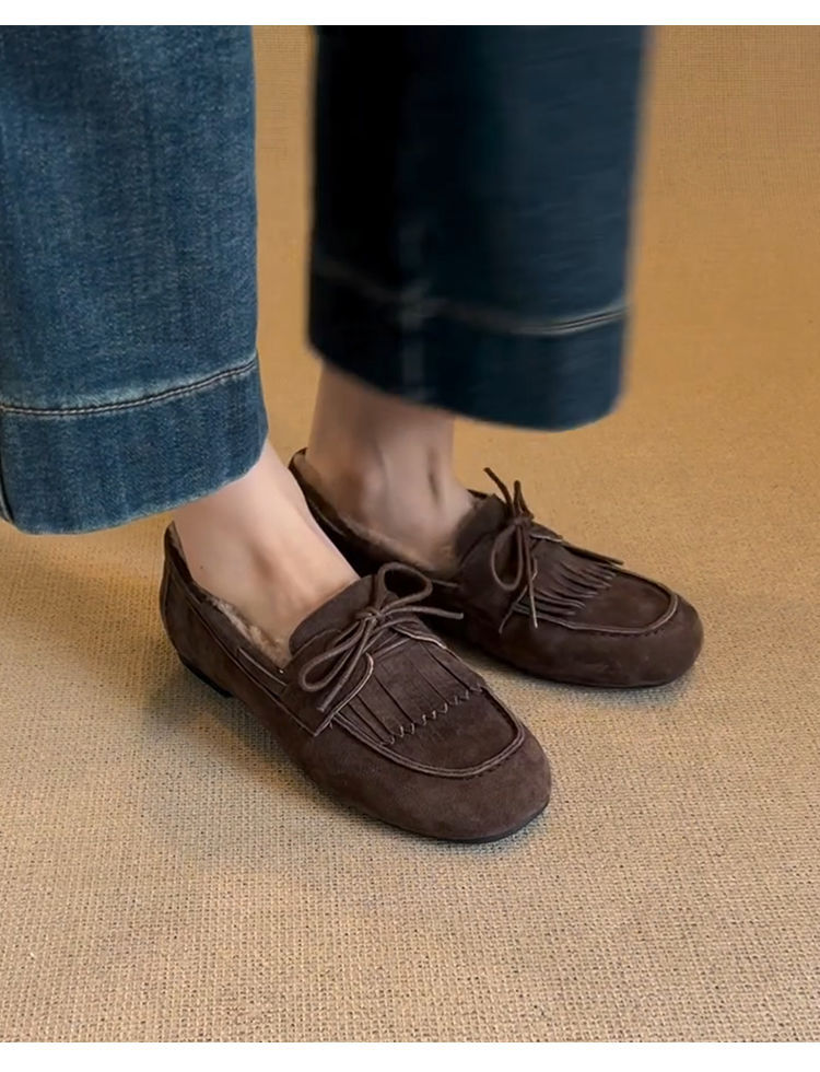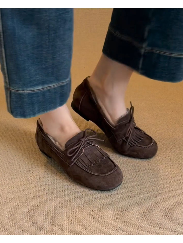 빈티지 슬립 온 슈퍼 편리한 기모 신발 여성 올 매치 프로스트 술 레이스 업 라운드 발가락 플랫 로퍼
