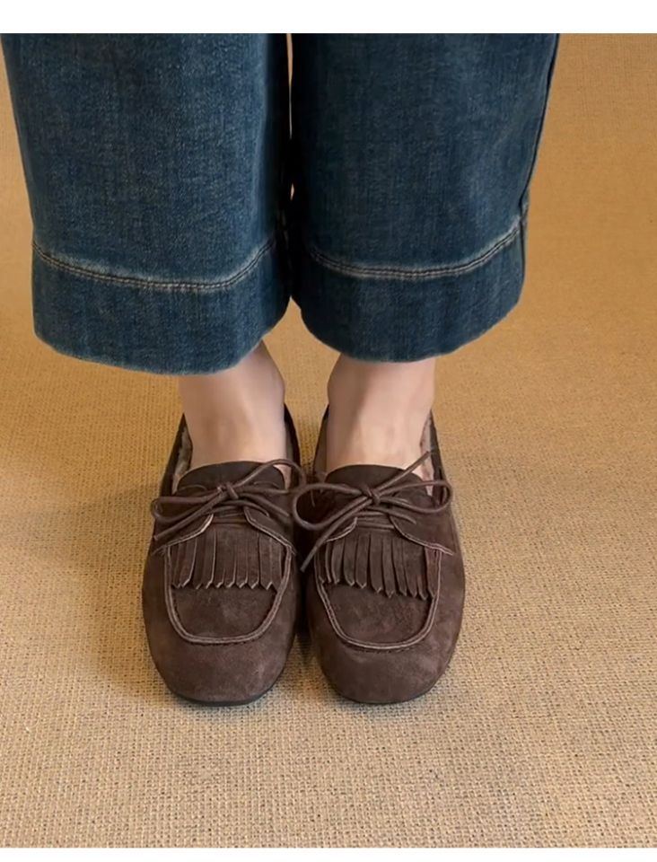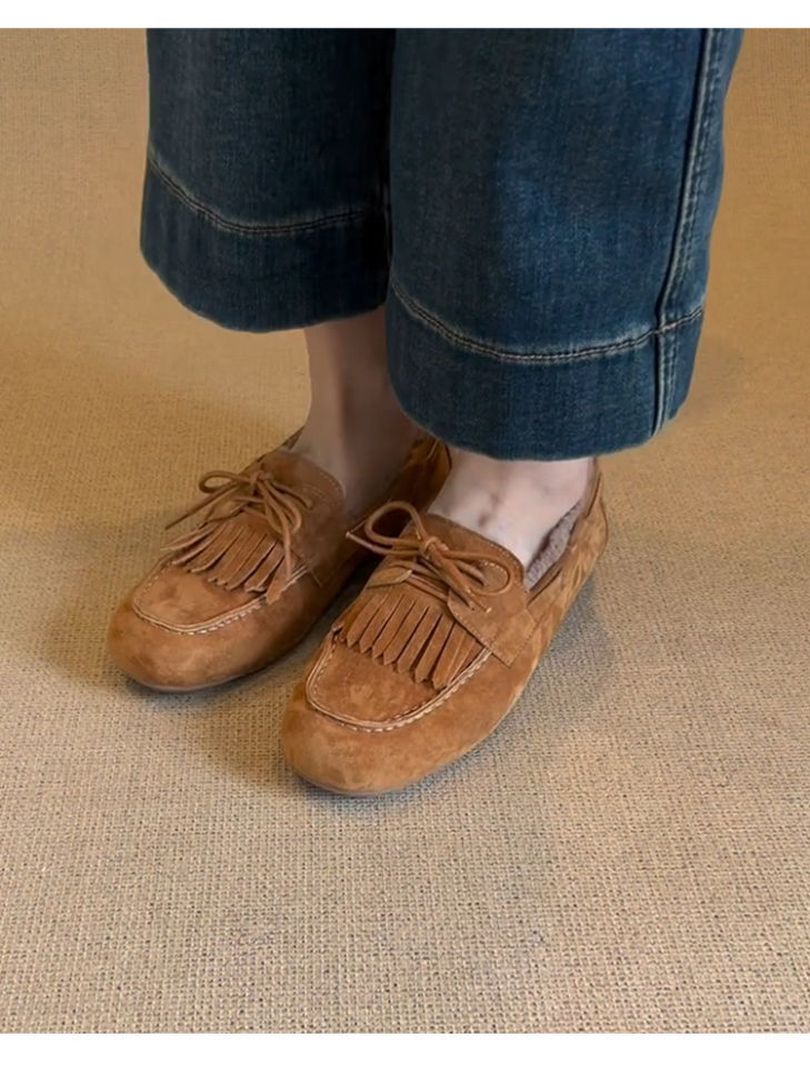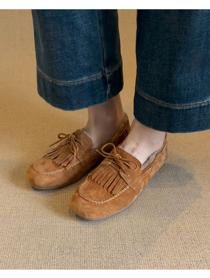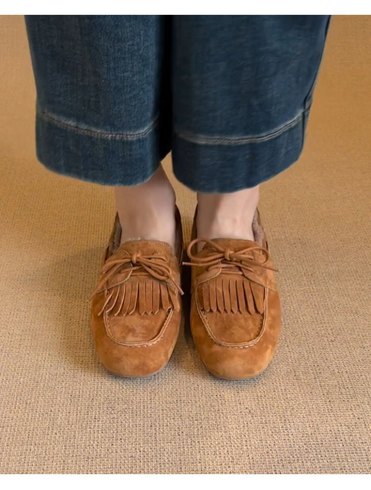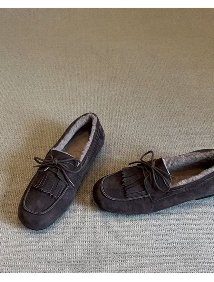 빈티지 슬립 온 슈퍼 편리한 기모 신발 여성 올 매치 프로스트 술 레이스 업 라운드 발가락 플랫 로퍼