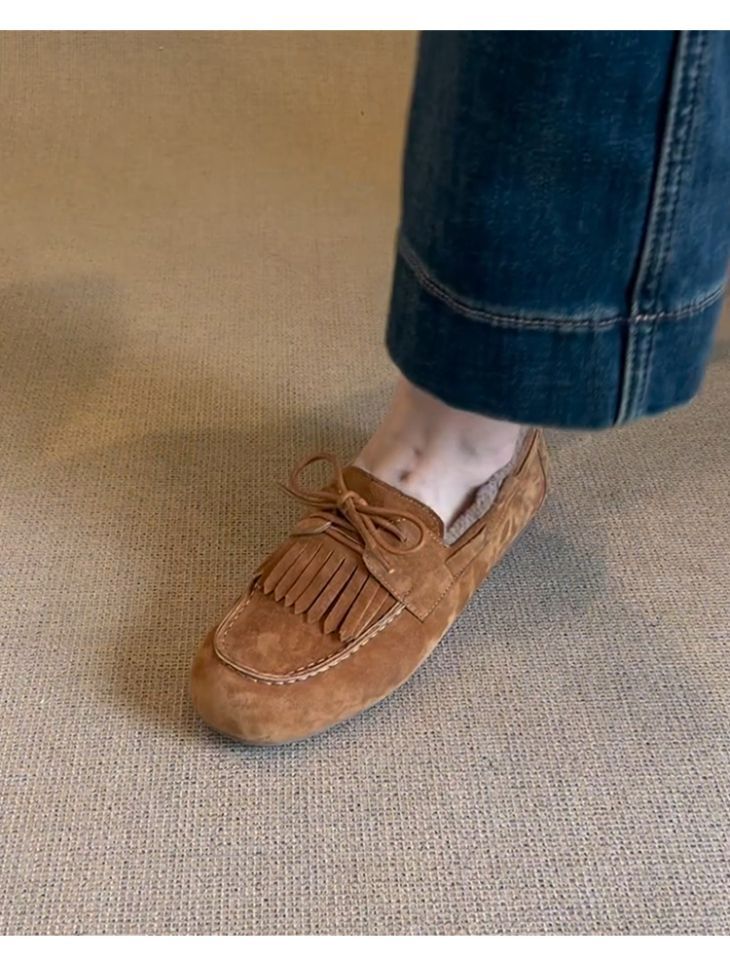 빈티지 슬립 온 슈퍼 편리한 기모 신발 여성 올 매치 프로스트 술 레이스 업 라운드 발가락 플랫 로퍼스토어 가기