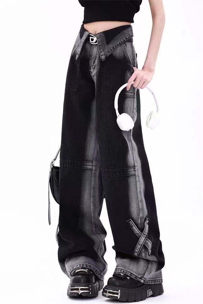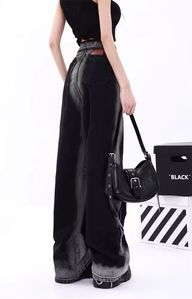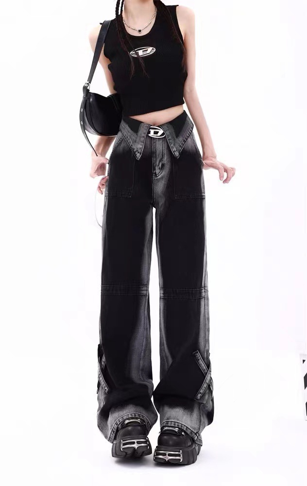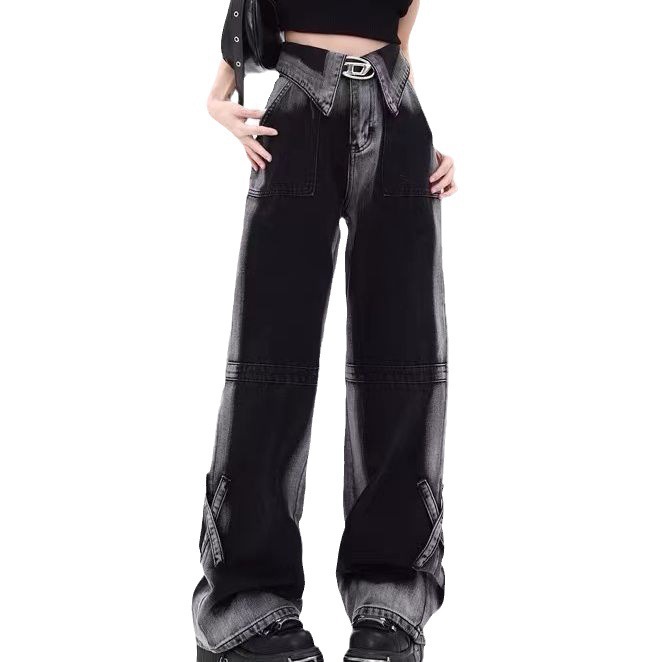 아메리칸 스타일 디자인 컬러 블록 줄무늬 스파이스 소녀 와이드 다리 청바지 여성의 2024 빈티지 틈새 느슨한 청바지스토어 가기