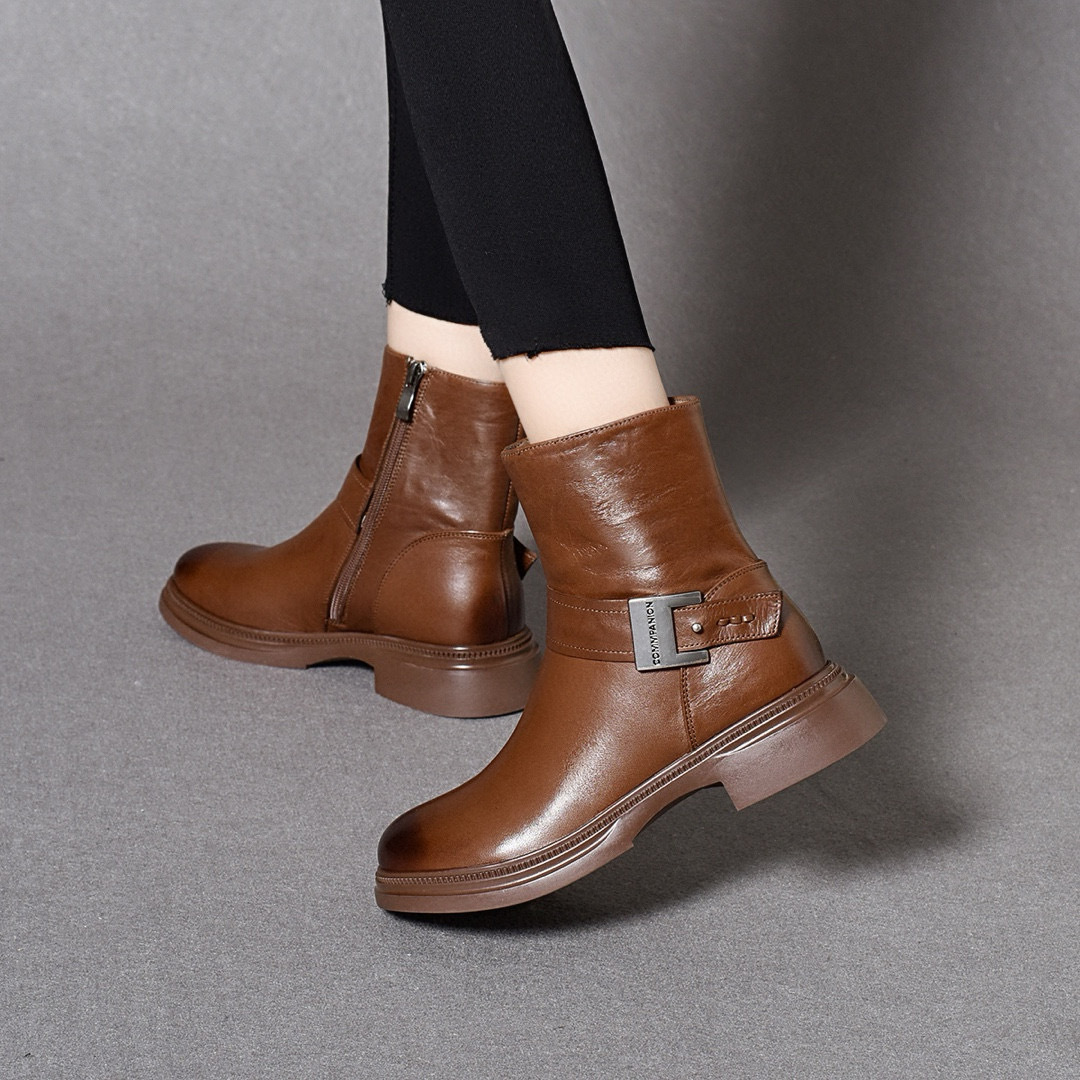 마틴 부츠 여성 부츠 2024 년 가을 및 겨울 유럽 및 미국 스타일 라운드 발가락 벨트 버클 미드 부츠 Cowhide 플랫 가죽 부츠 여성용 코튼 부츠