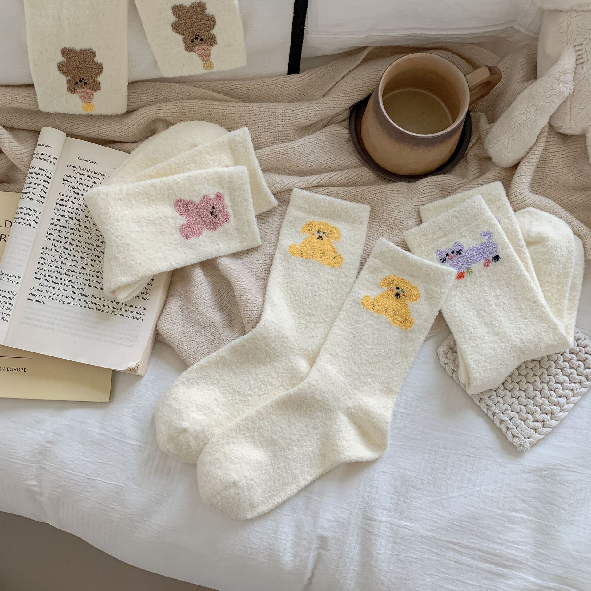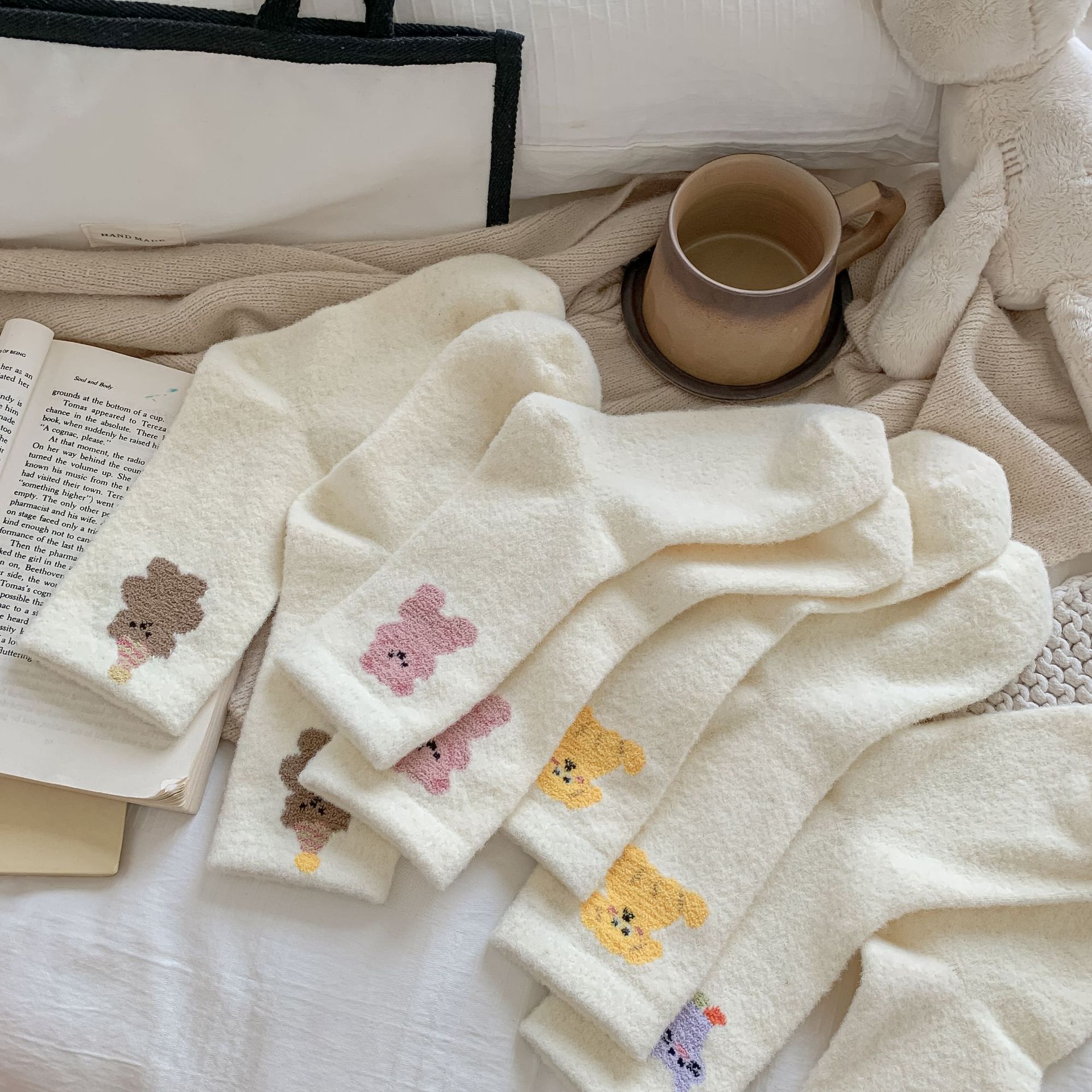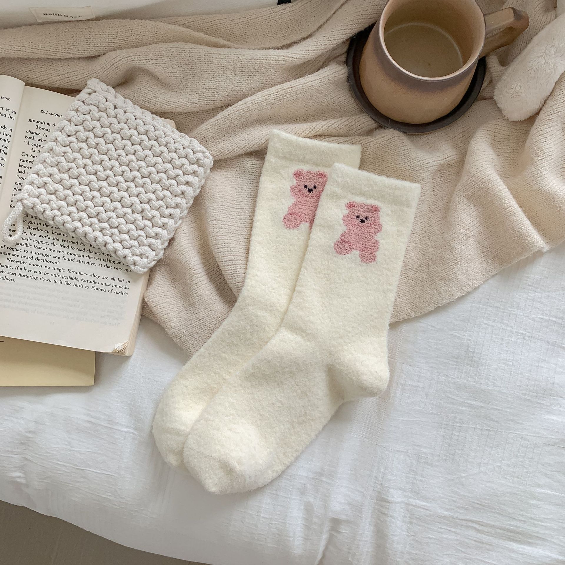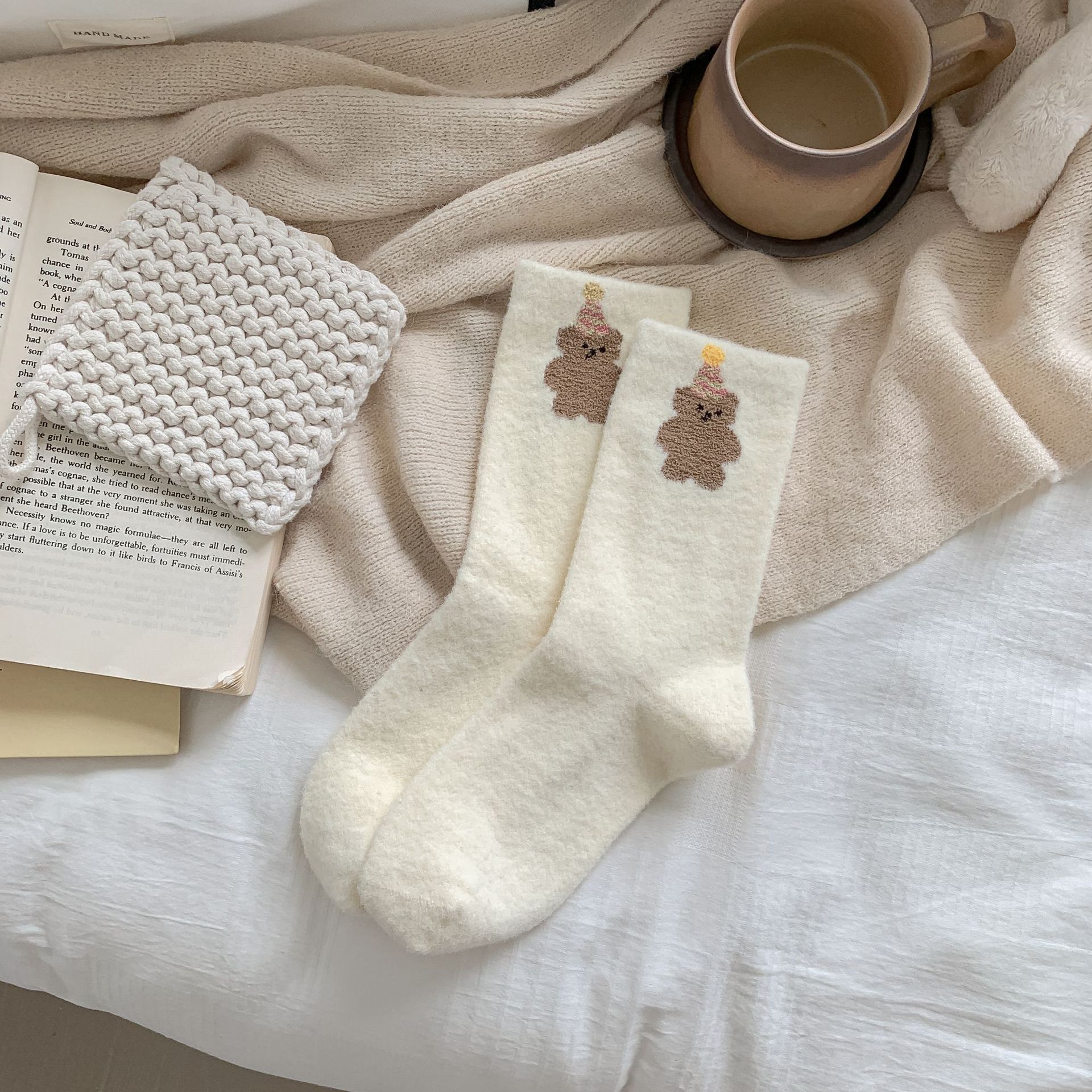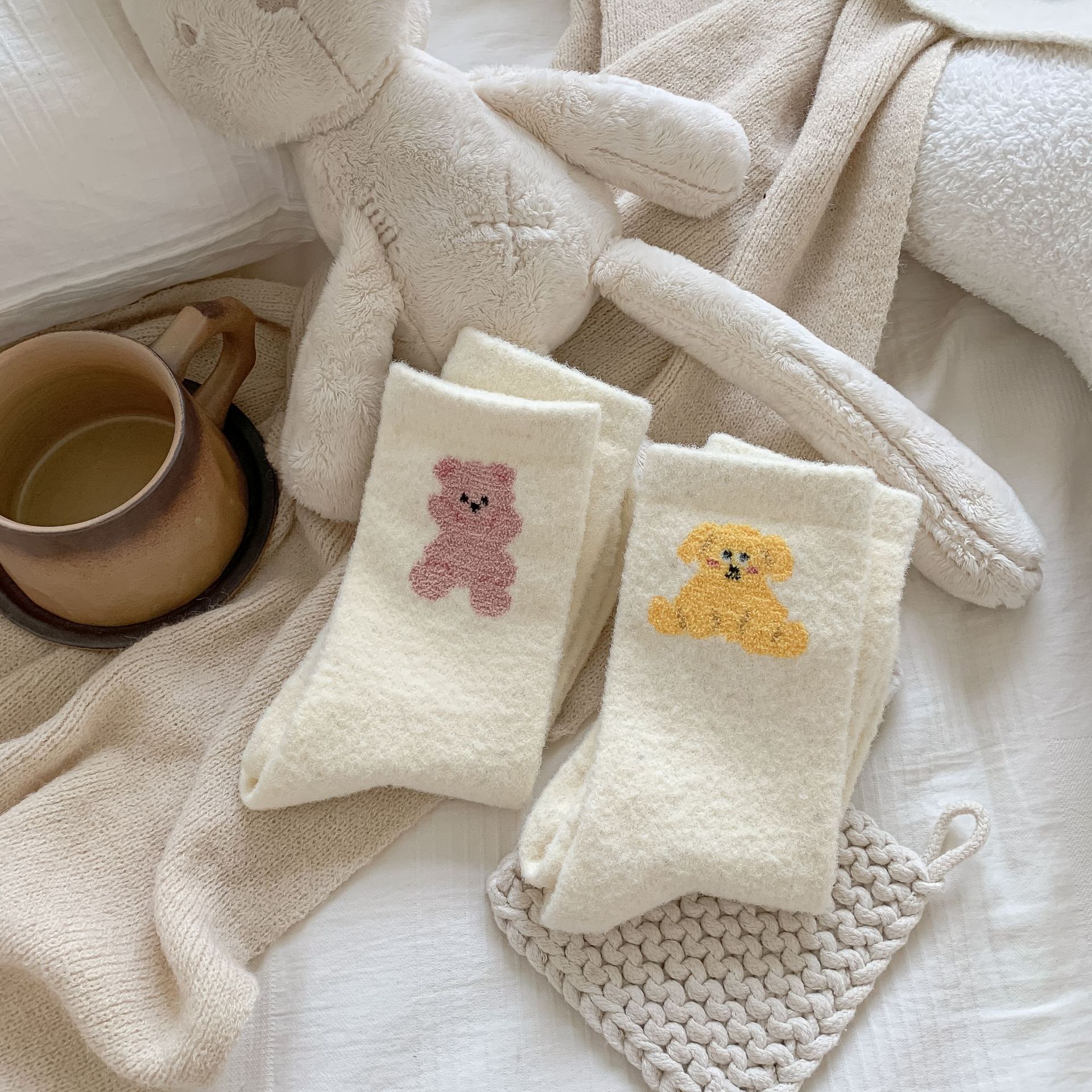귀여운 곰 회색 벨벳 화이트 양말 여성의 중간 길이 양말 가을과 겨울 기모 두꺼운 따뜻한 일본 스타일 만화 겨울 스타킹