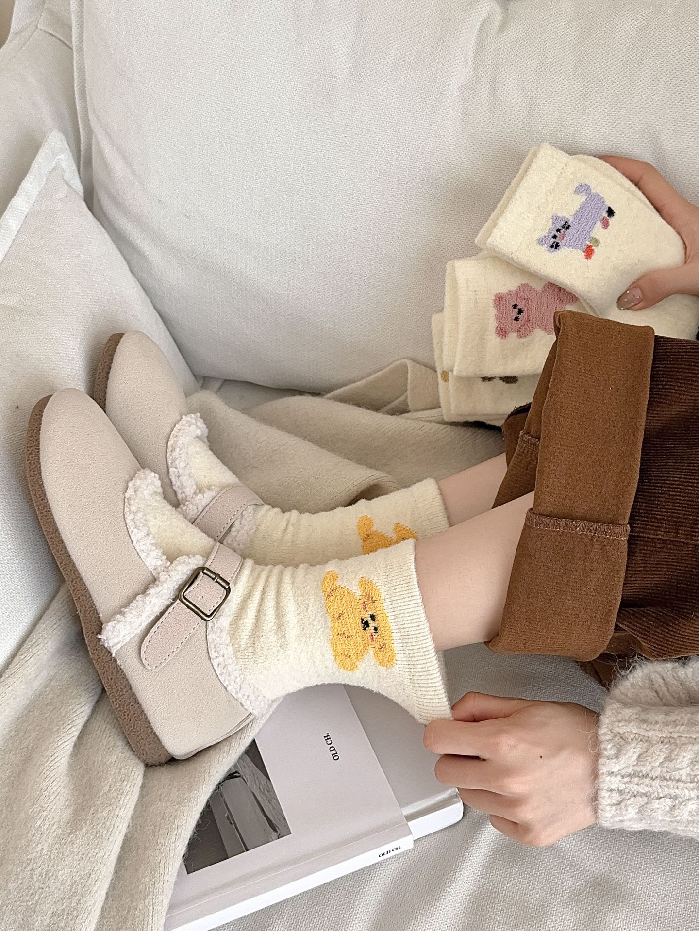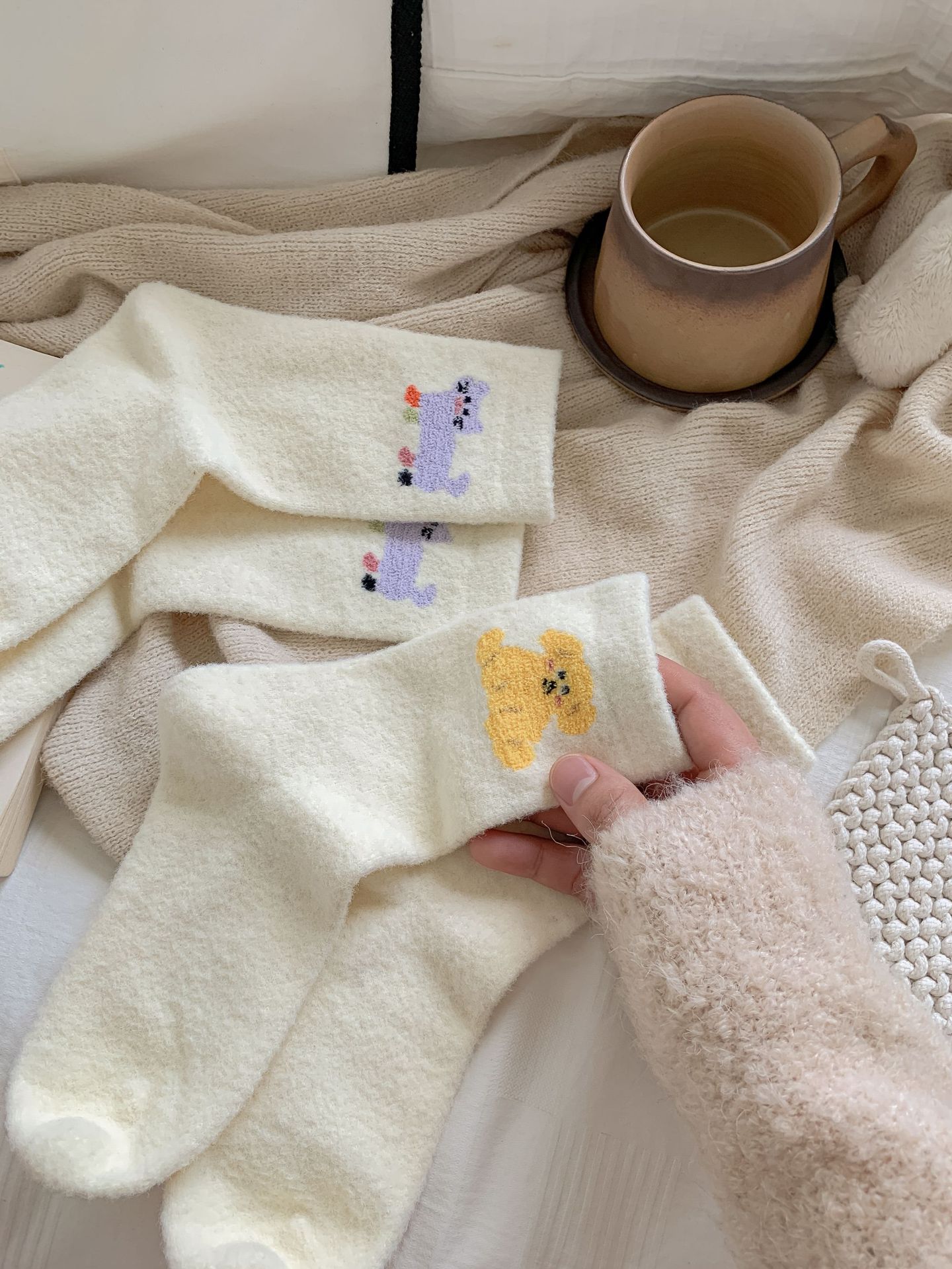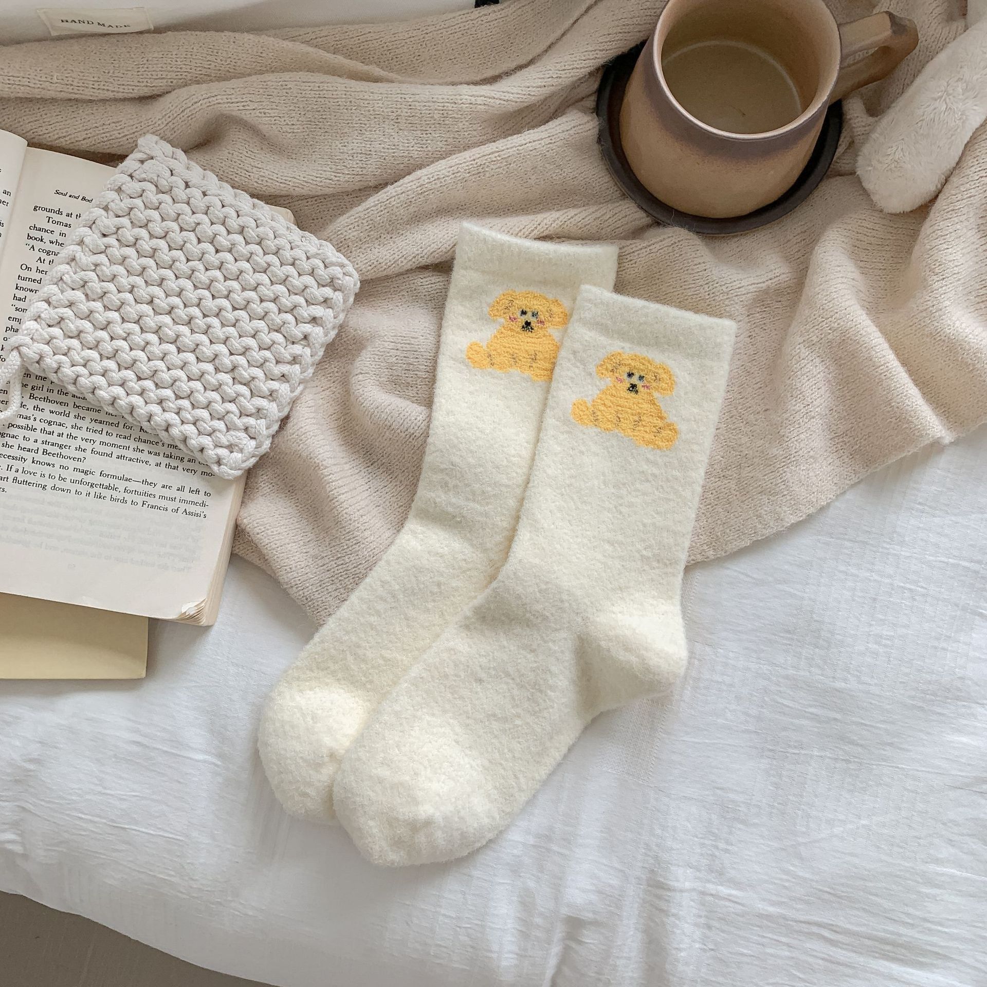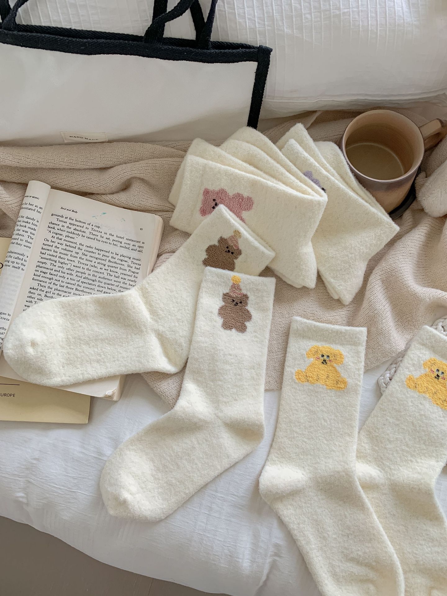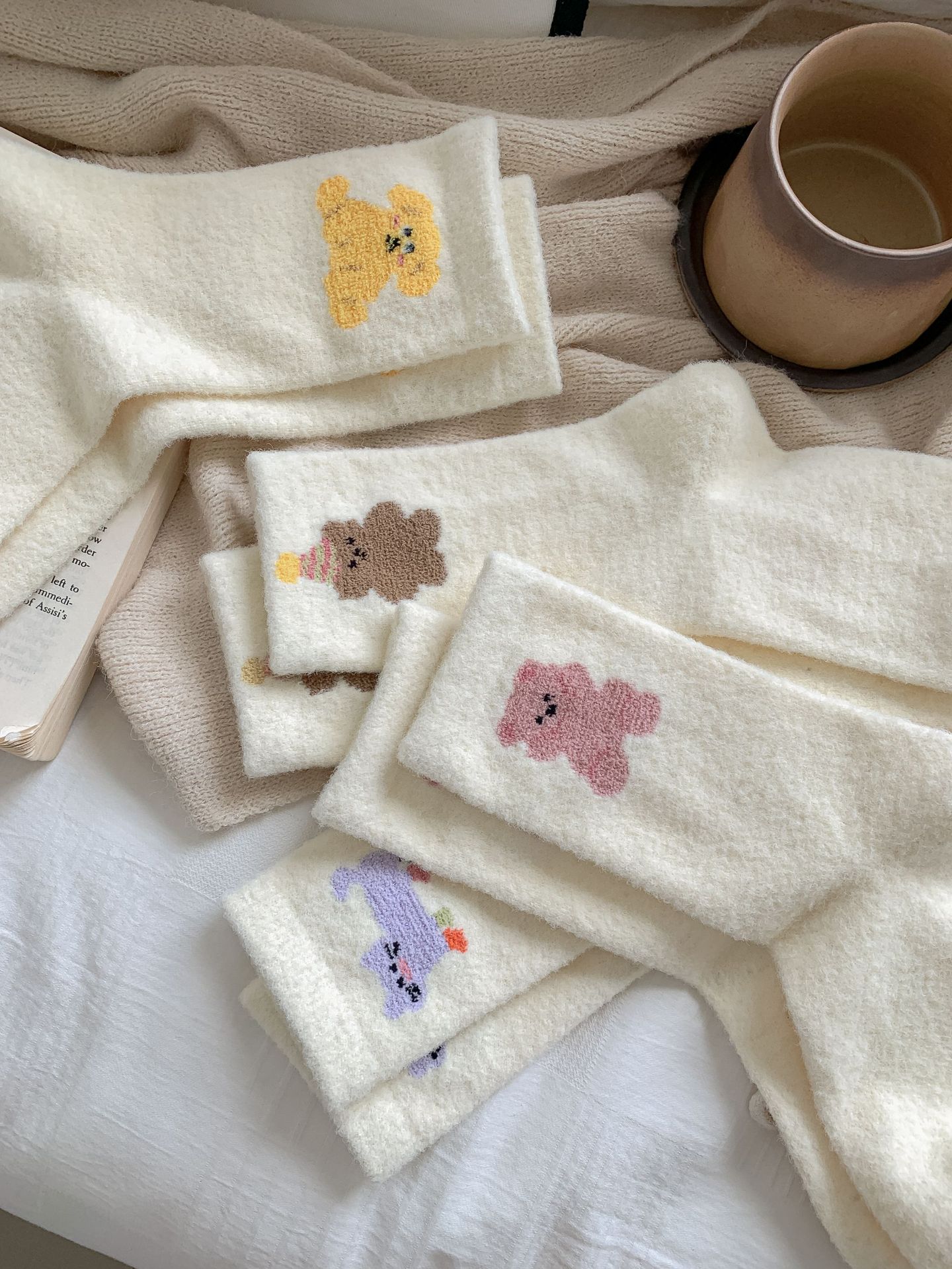 귀여운 곰 회색 벨벳 화이트 양말 여성의 중간 길이 양말 가을과 겨울 기모 두꺼운 따뜻한 일본 스타일 만화 겨울 스타킹