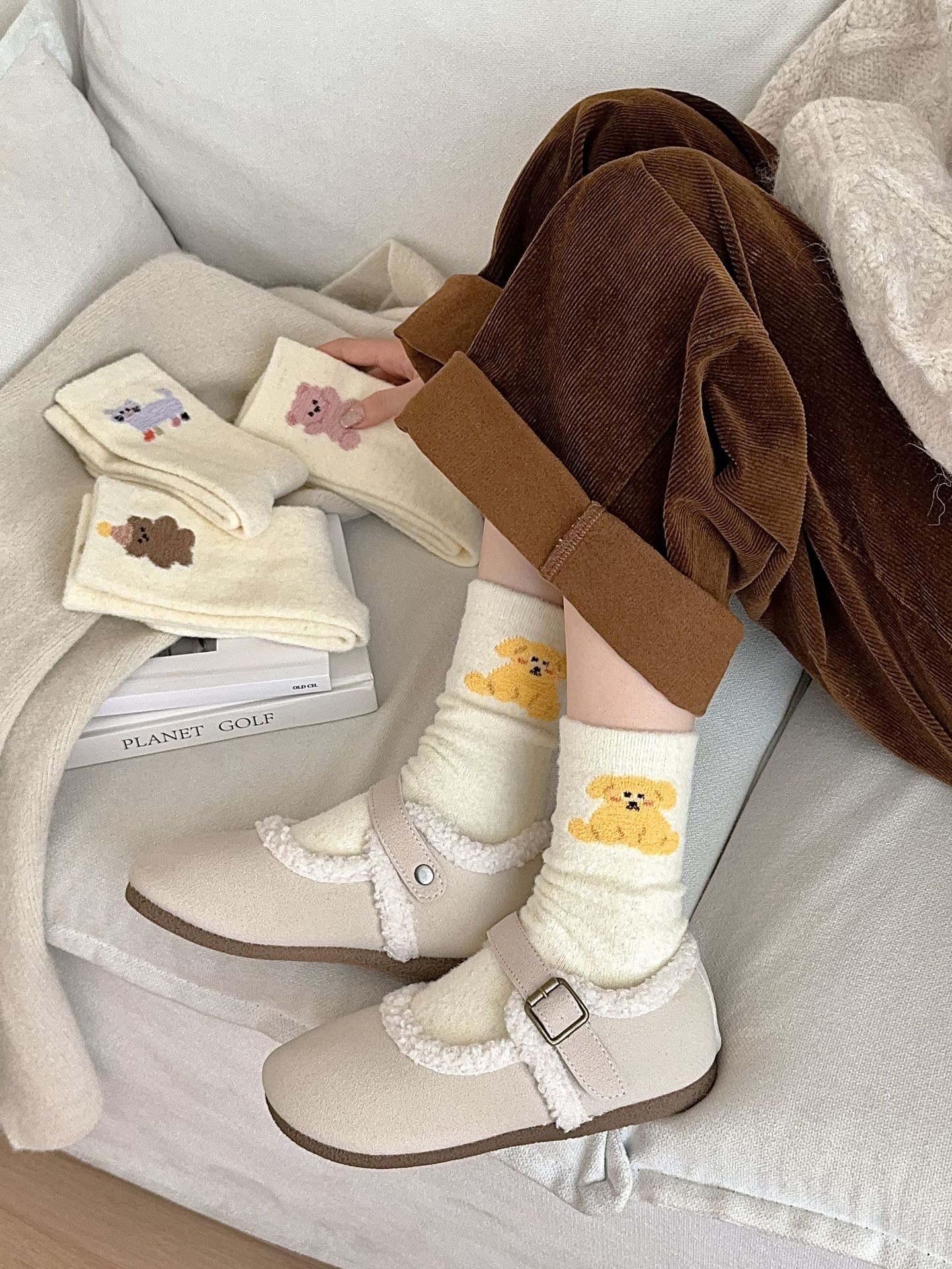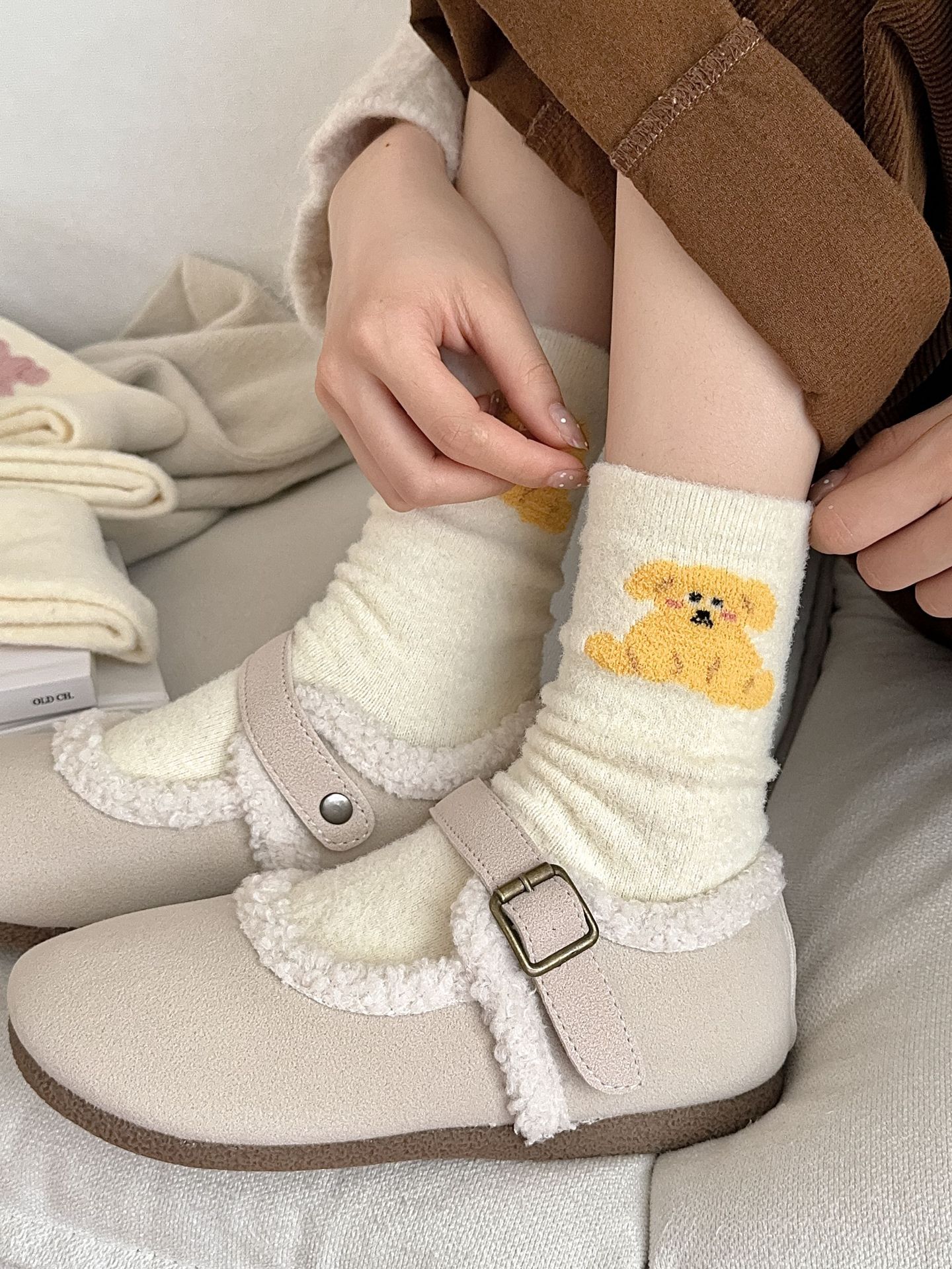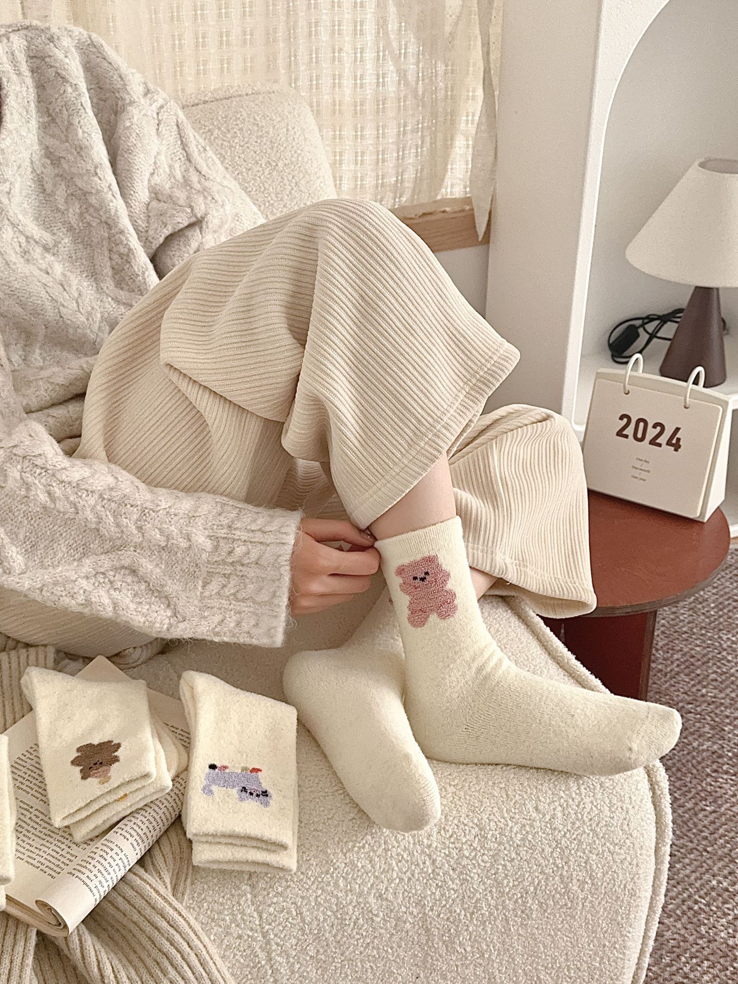 귀여운 곰 회색 벨벳 화이트 양말 여성의 중간 길이 양말 가을과 겨울 기모 두꺼운 따뜻한 일본 스타일 만화 겨울 스타킹스토어 가기