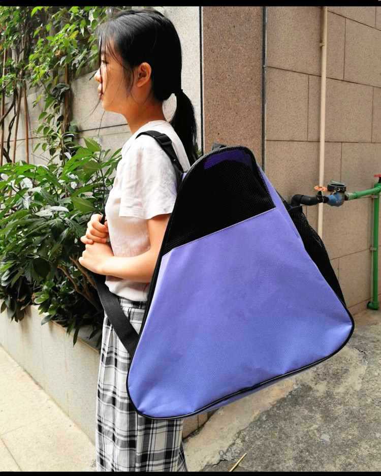 • 검정색과 파란색 삼각형 가방: 성인용 롤러 스케이트 한 켤레를 담을 수 있습니다.