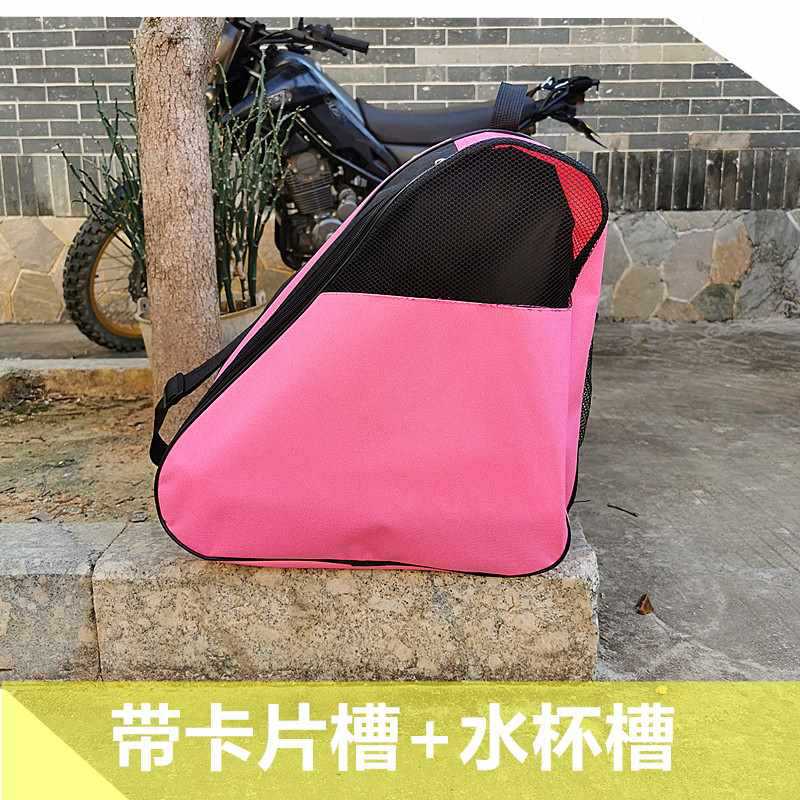 • 검정색과 분홍색 삼각형 가방: 성인용 롤러 스케이트 한 켤레를 담을 수 있습니다.