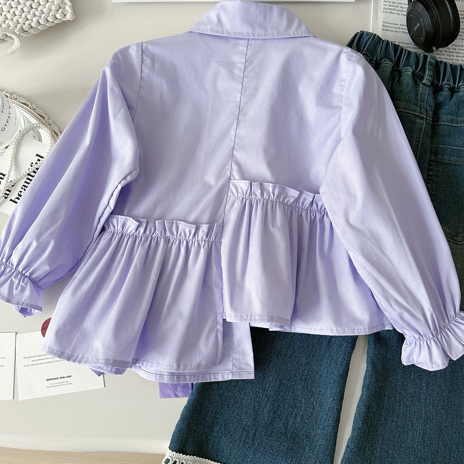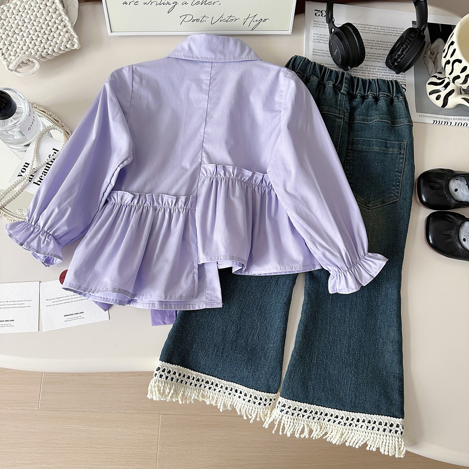 가을 2024 새로운 한국 소녀 보라색 셔츠 새끼 고양이 슬림 데님 바지 세트 67668