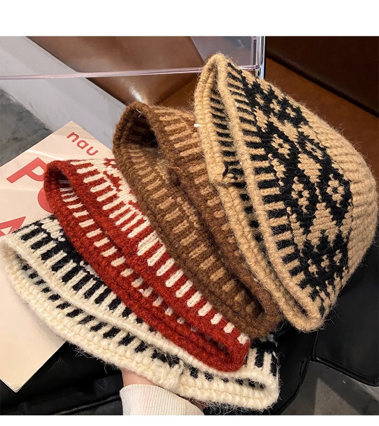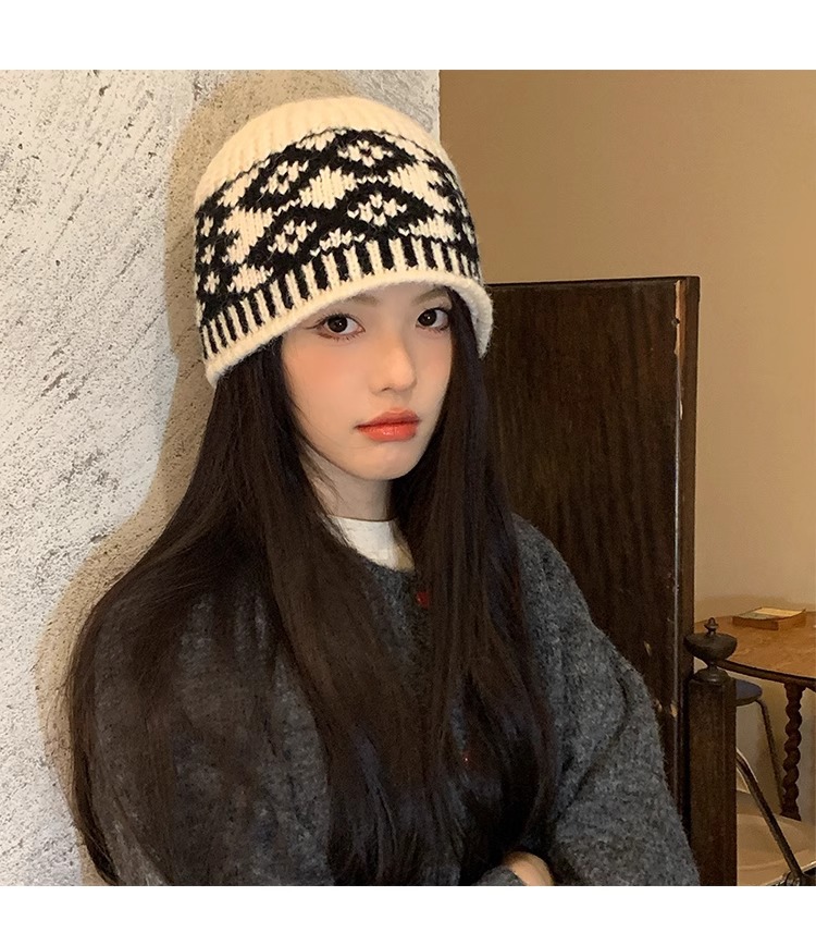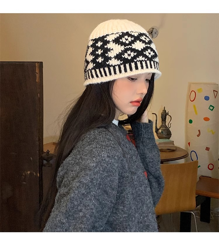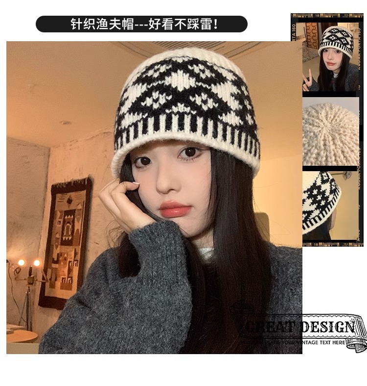 한국 빈티지 다이아몬드 격자 무늬 어부 모자 여성의 가을 및 겨울 얼굴 작은 올 매치 컬러 매칭 빅 헤드 울 니트 모자스토어 가기