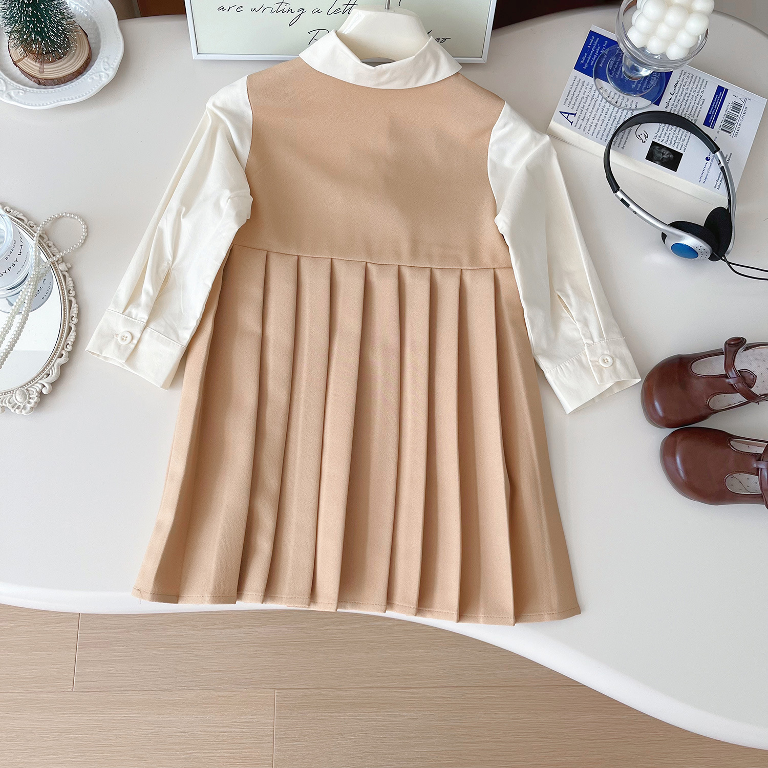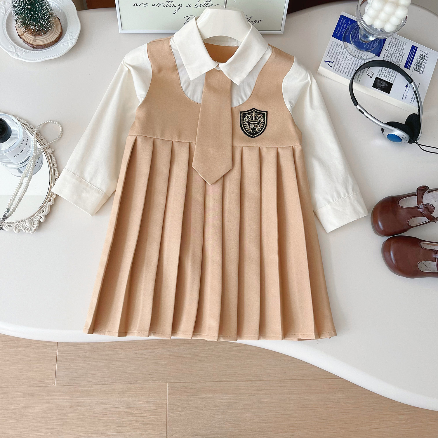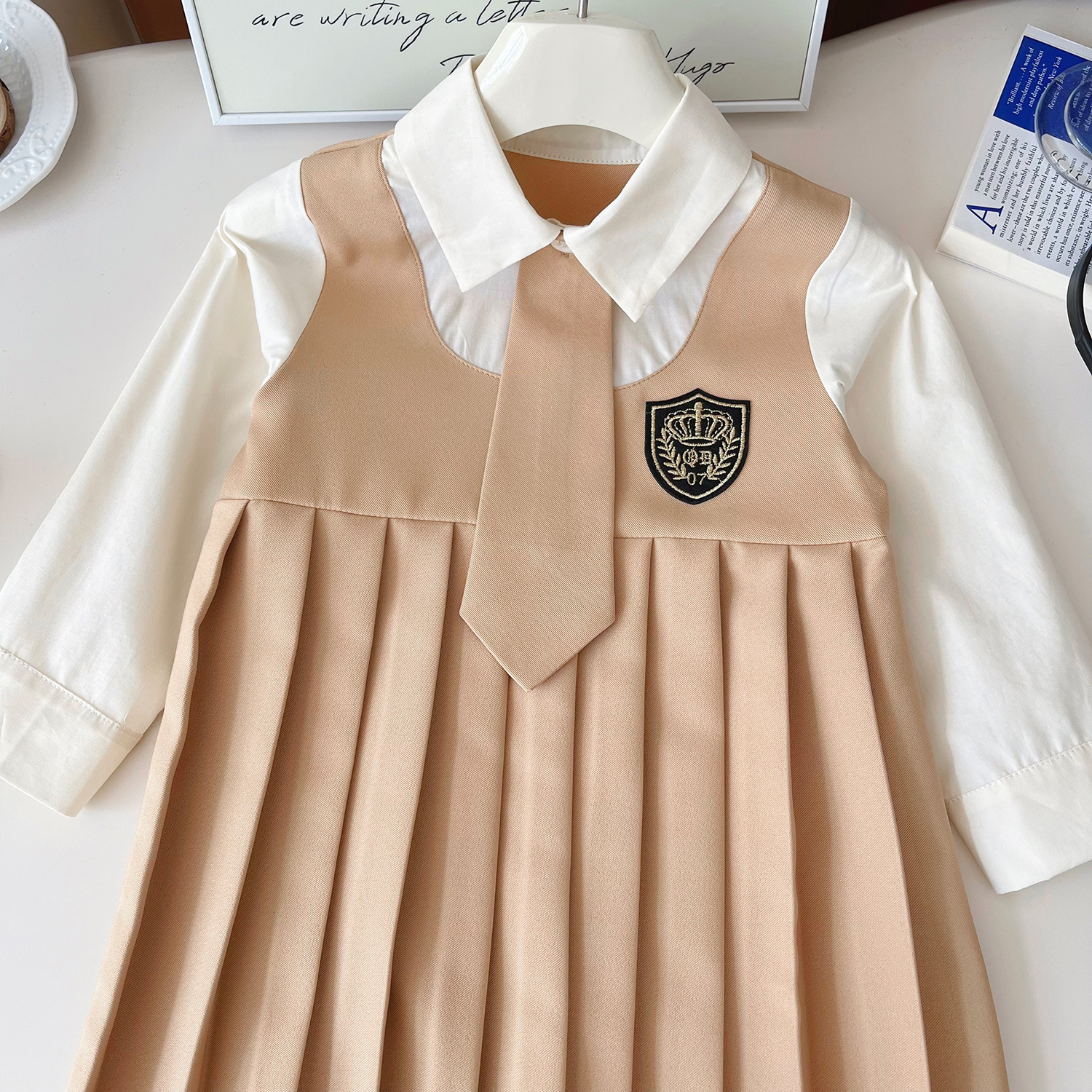 가을 2024 새로운 한국 여자 긴팔 셔츠 주름 치마 가짜 투피스 세트 학업 스타일 원피스 67363