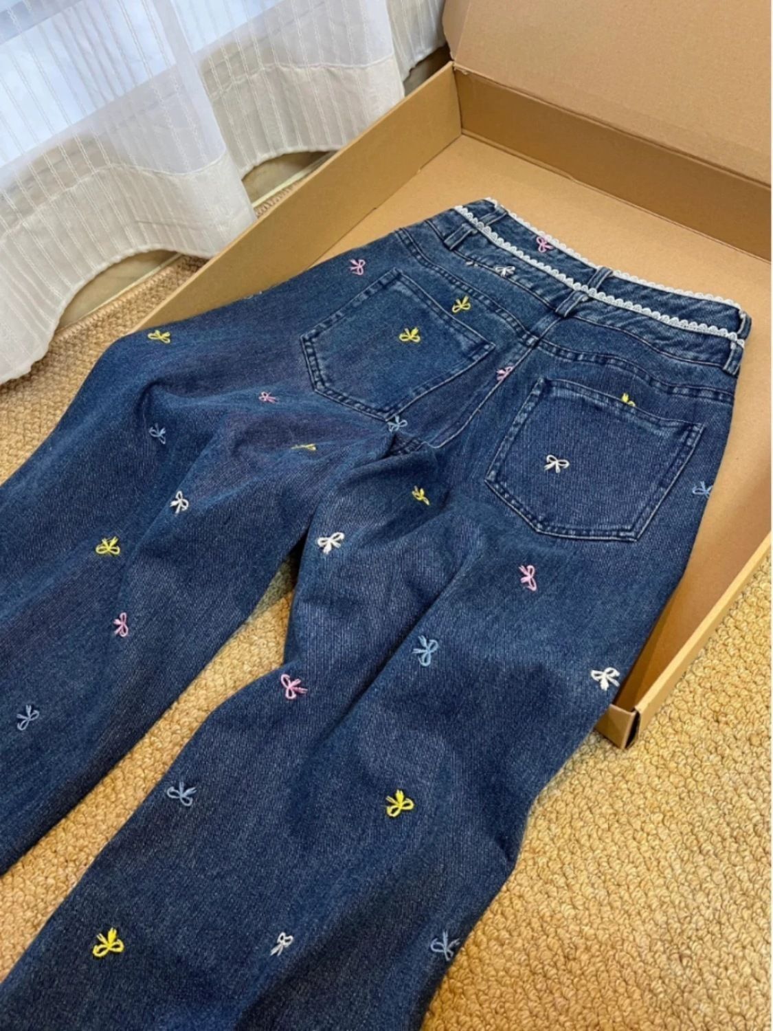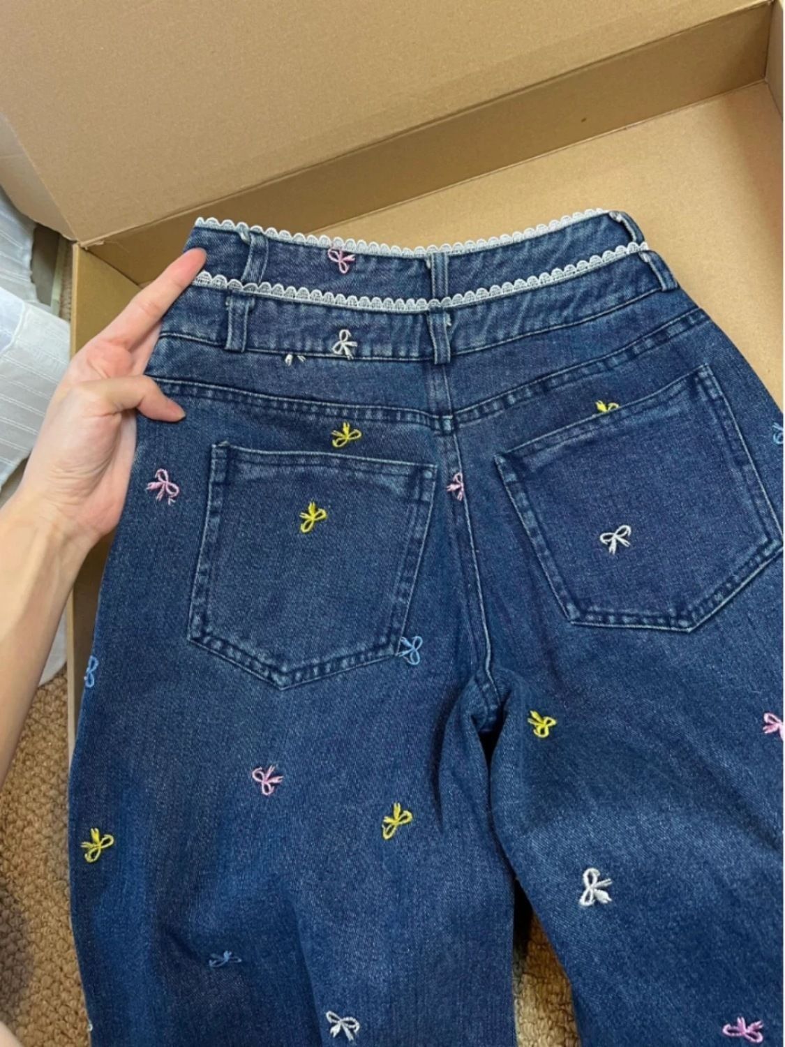 미국 스타일 작은 더블 헤드 다채로운 활 청바지 여성의 가을 2024 새로운 달콤한 허리 올 매치 와이드 다리 바지스토어 가기