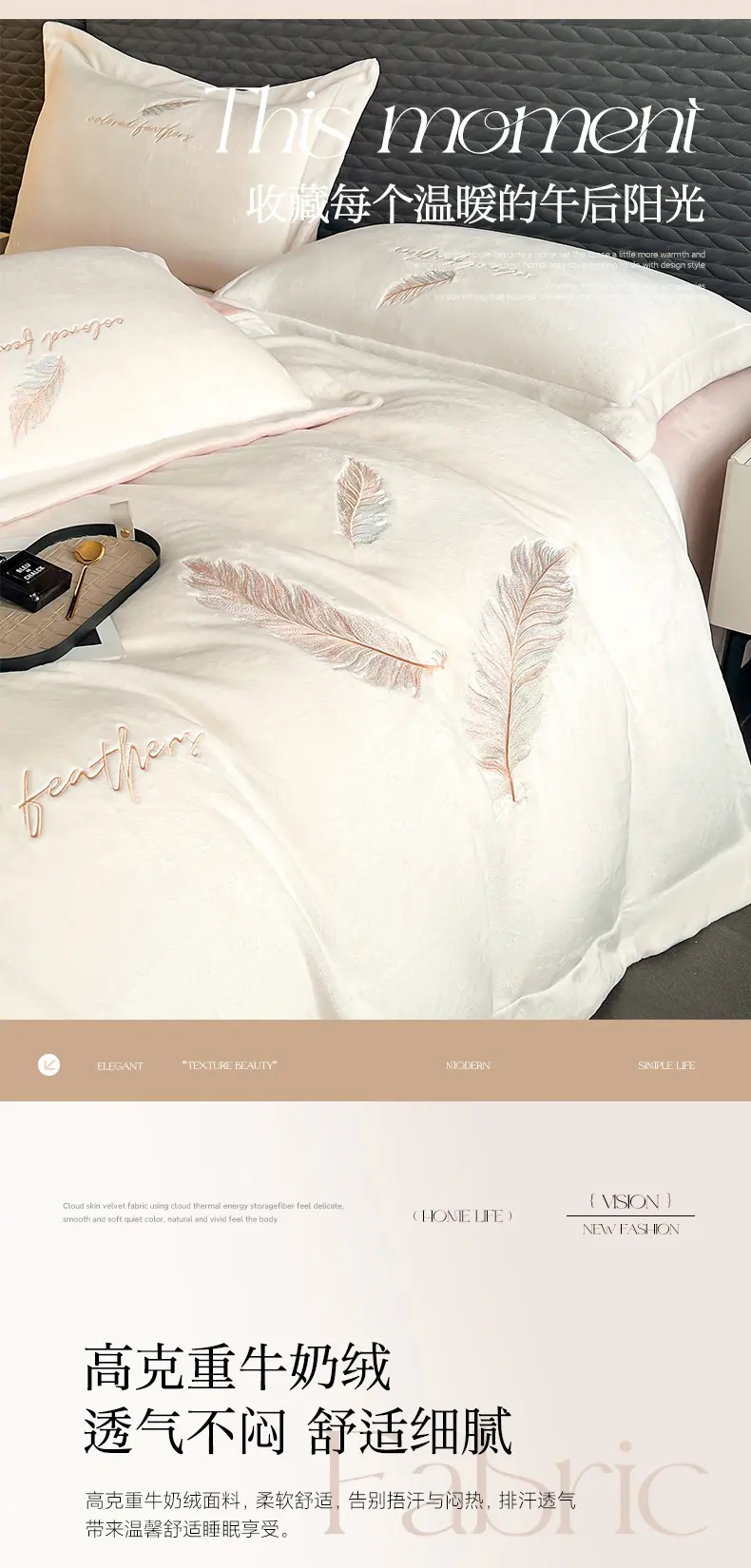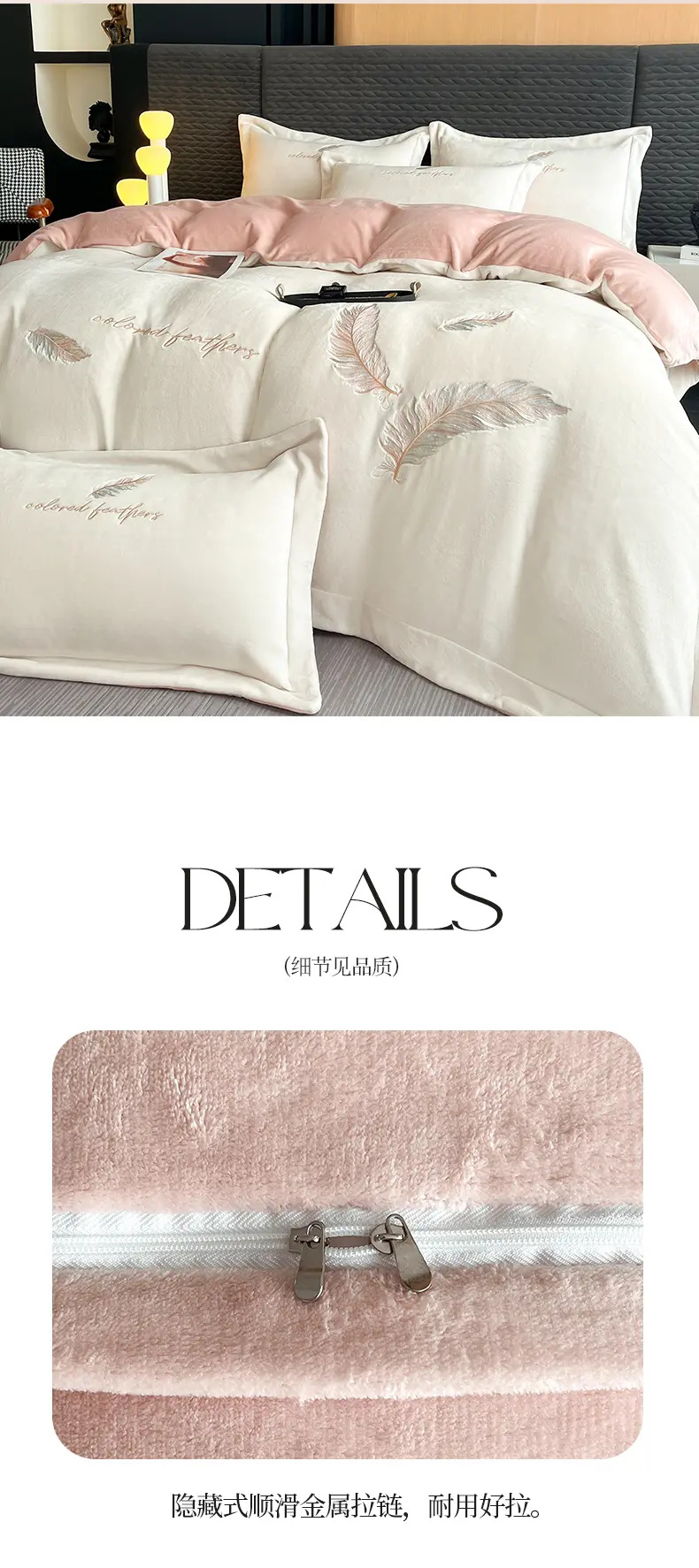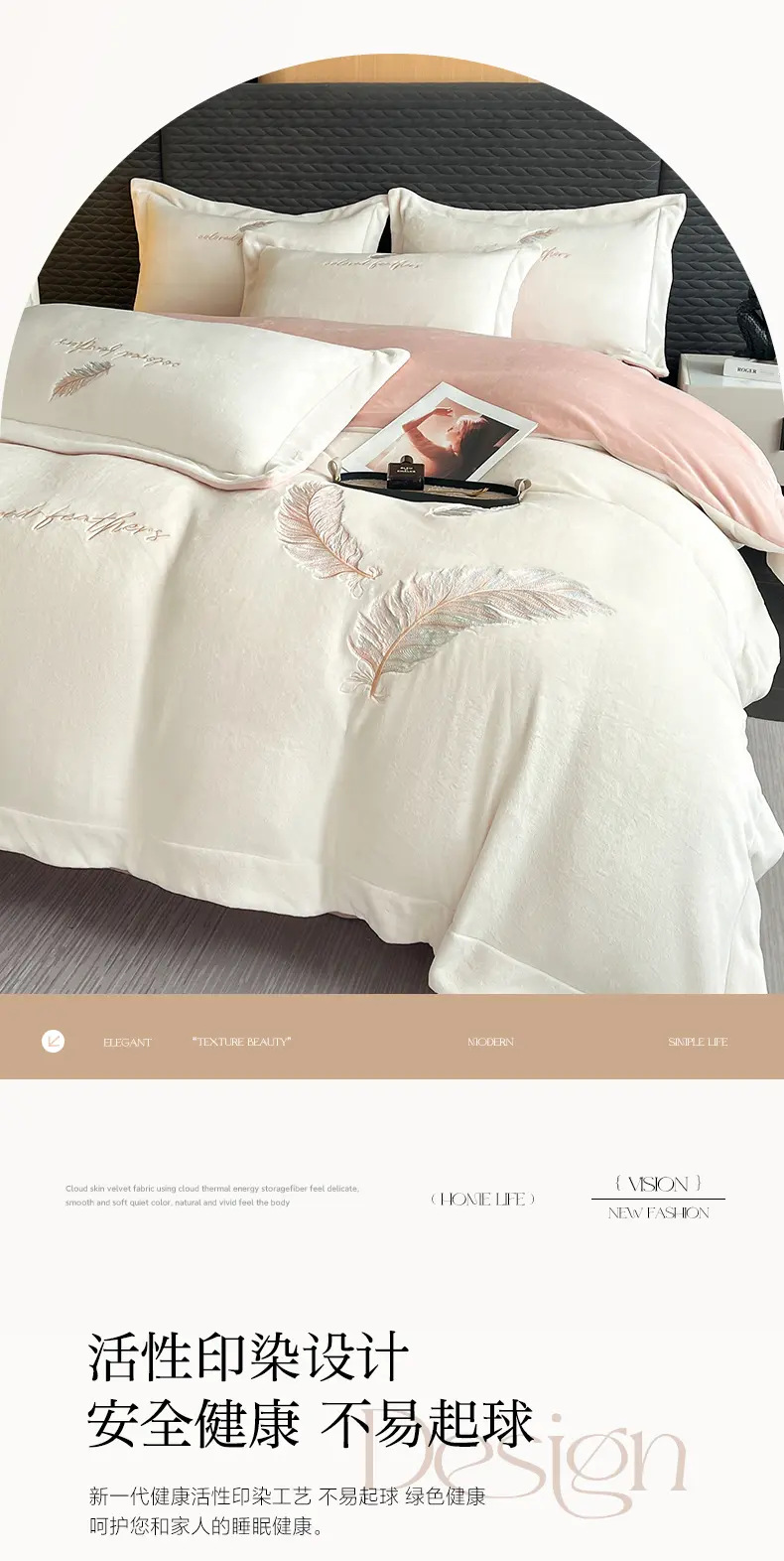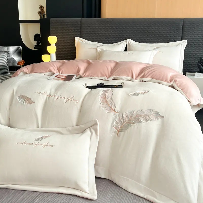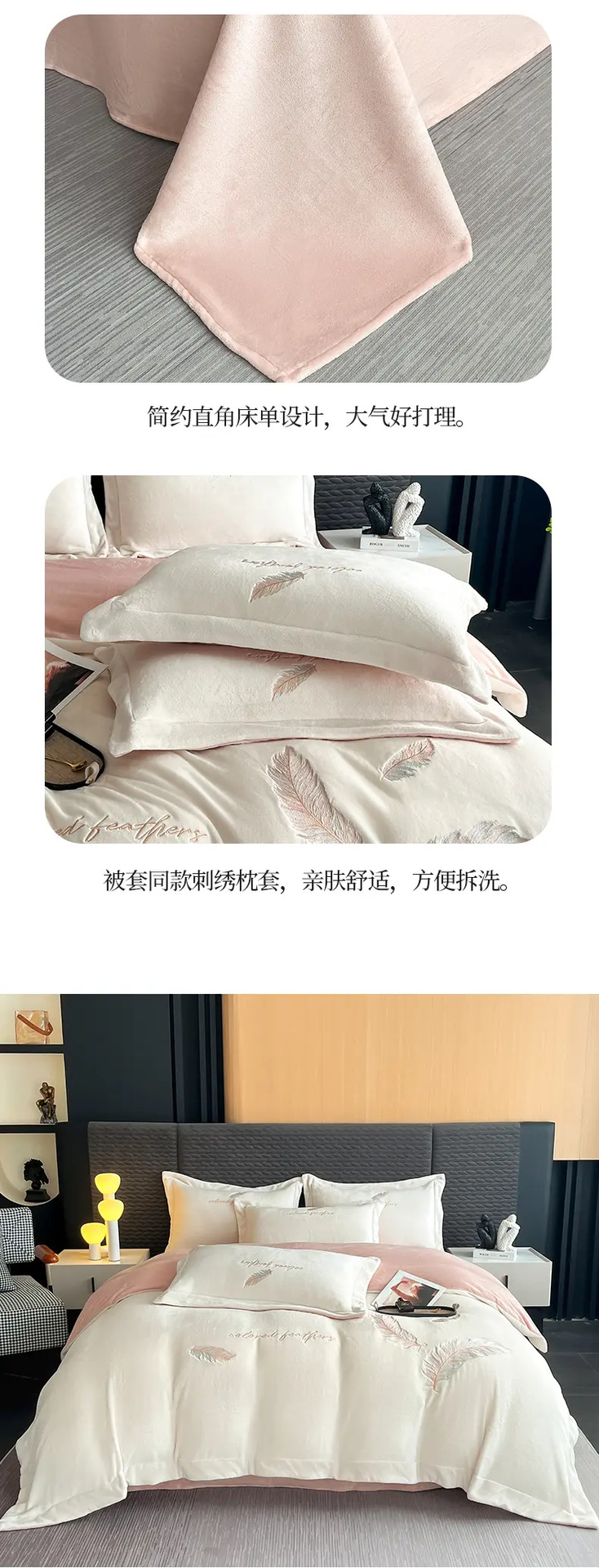 모성 및 유아 등급 높은 그램 무게 우유 벨벳 자수 4 피스 세트 두꺼운 따뜻한 산호 벨벳 침대 시트 퀼트 커버 침구 도매
