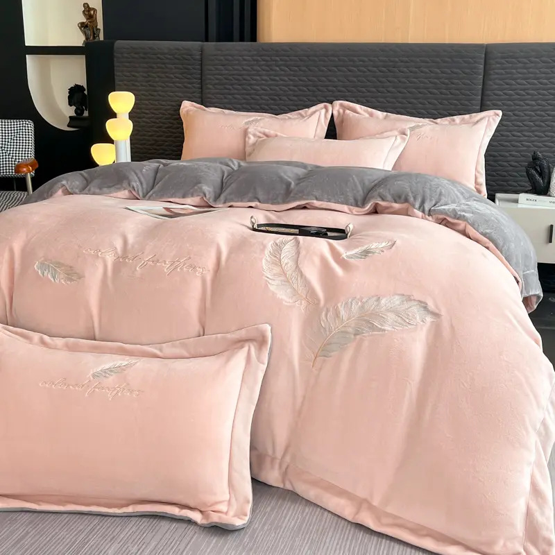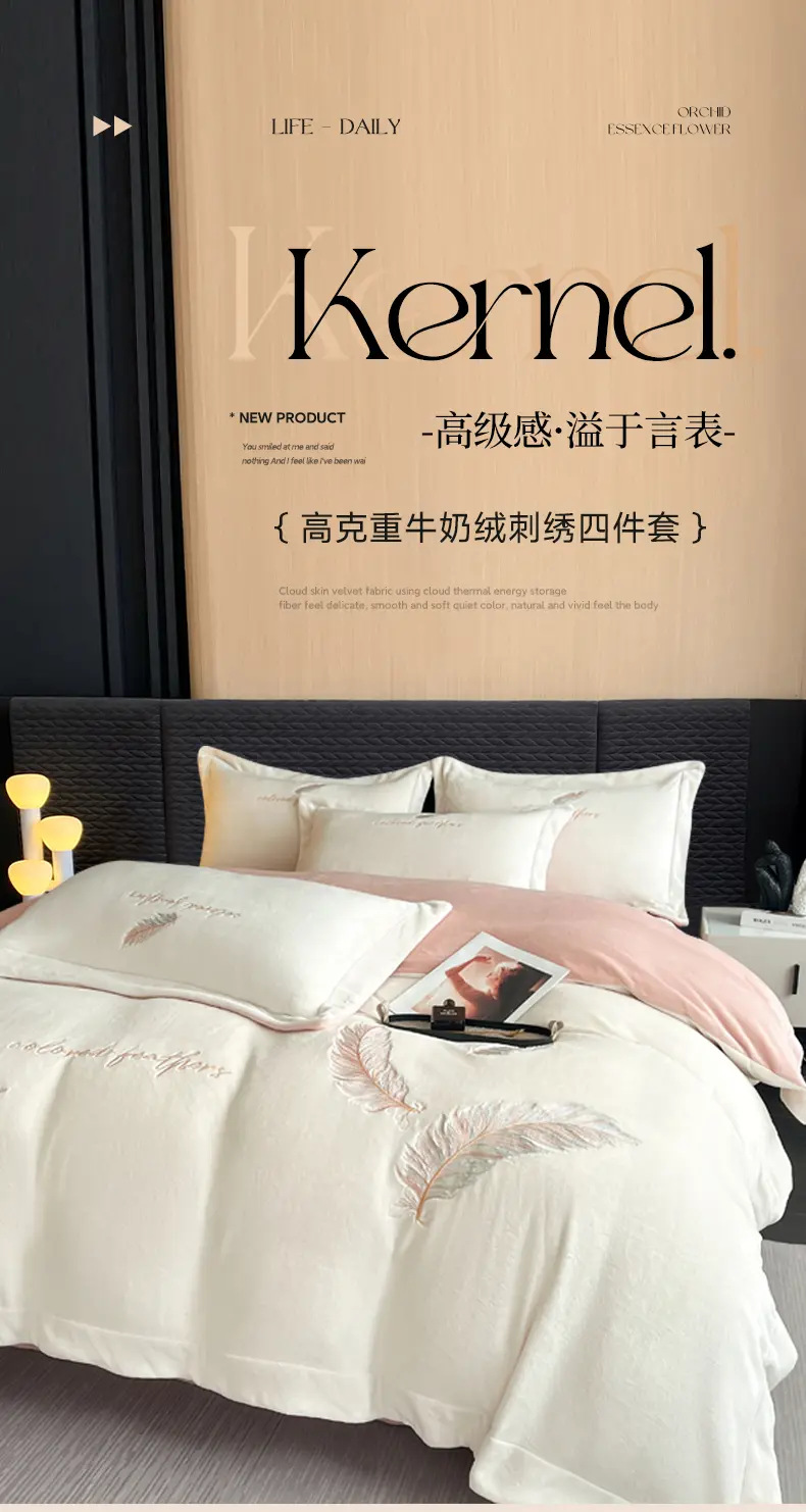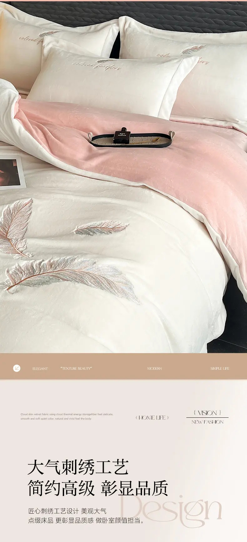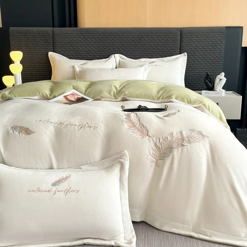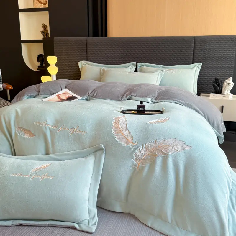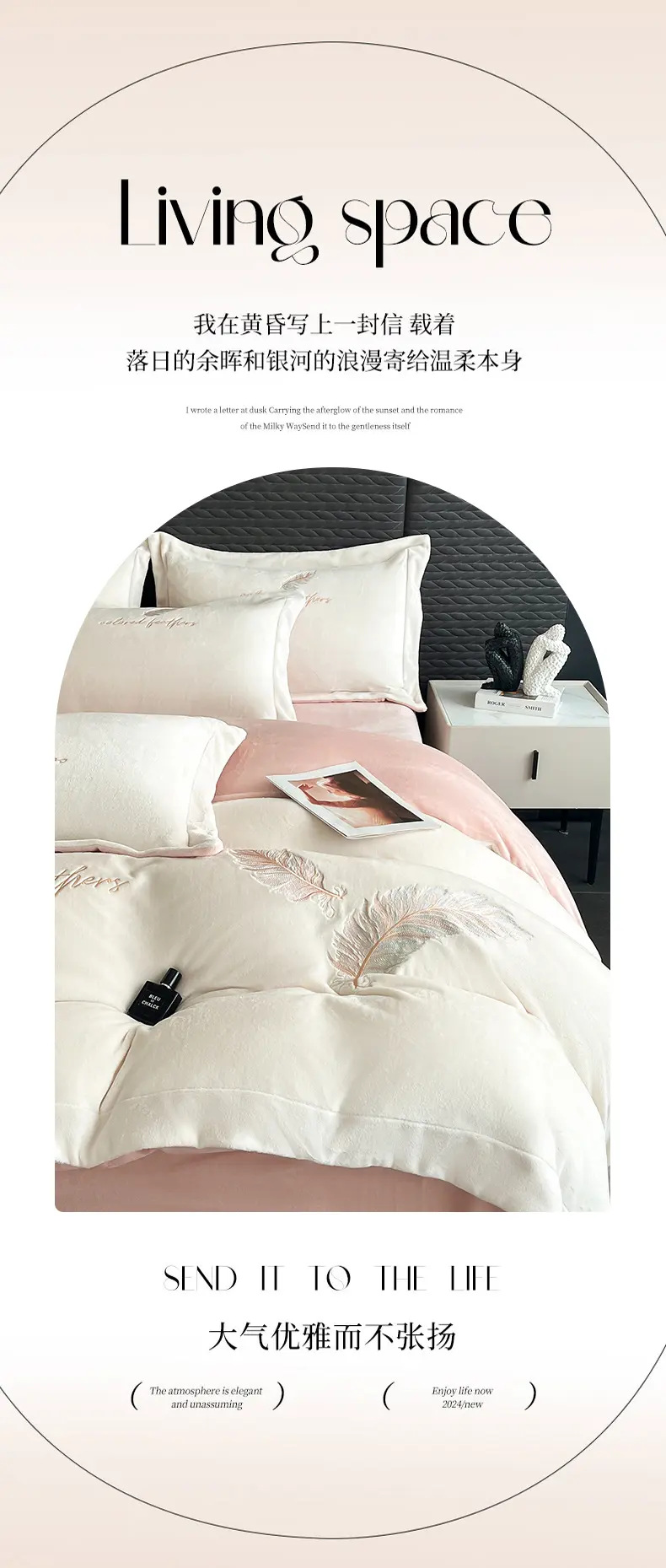 모성 및 유아 등급 높은 그램 무게 우유 벨벳 자수 4 피스 세트 두꺼운 따뜻한 산호 벨벳 침대 시트 퀼트 커버 침구 도매