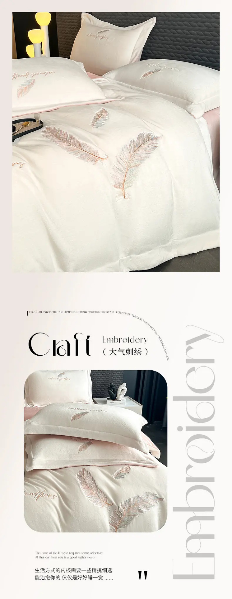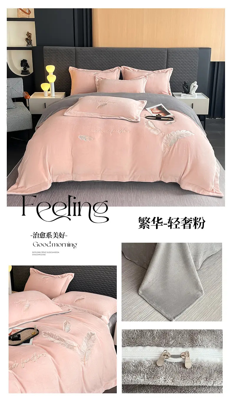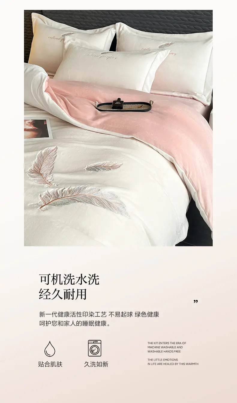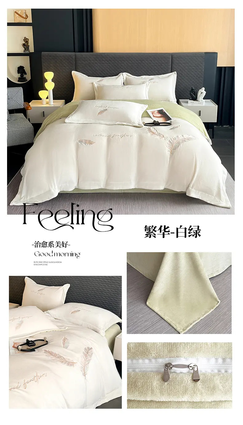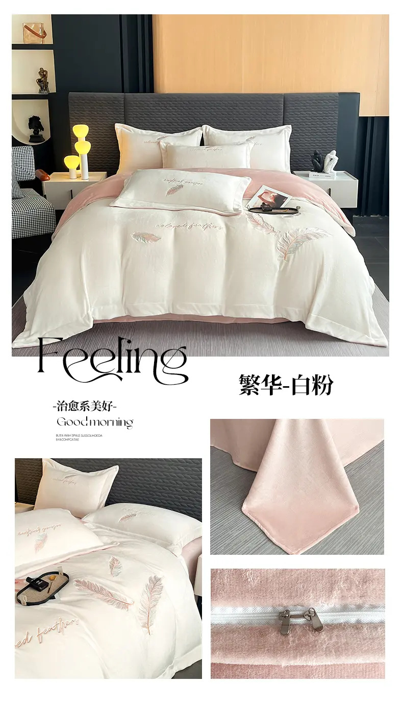 모성 및 유아 등급 높은 그램 무게 우유 벨벳 자수 4 피스 세트 두꺼운 따뜻한 산호 벨벳 침대 시트 퀼트 커버 침구 도매