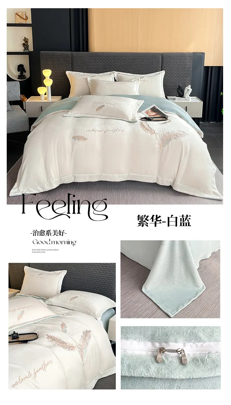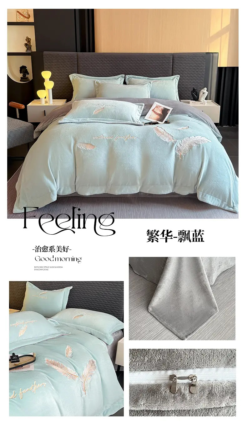 모성 및 유아 등급 높은 그램 무게 우유 벨벳 자수 4 피스 세트 두꺼운 따뜻한 산호 벨벳 침대 시트 퀼트 커버 침구 도매스토어 가기