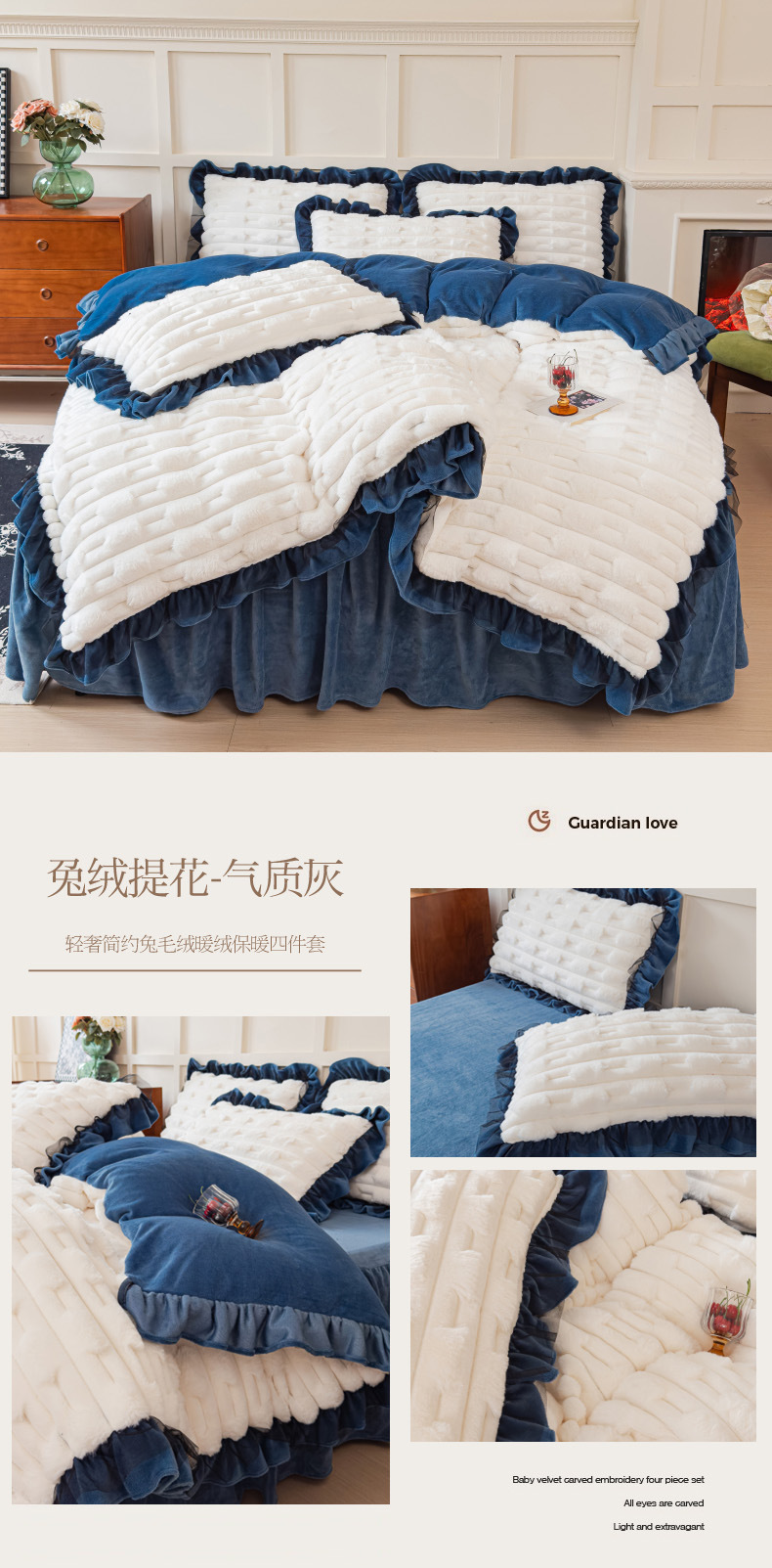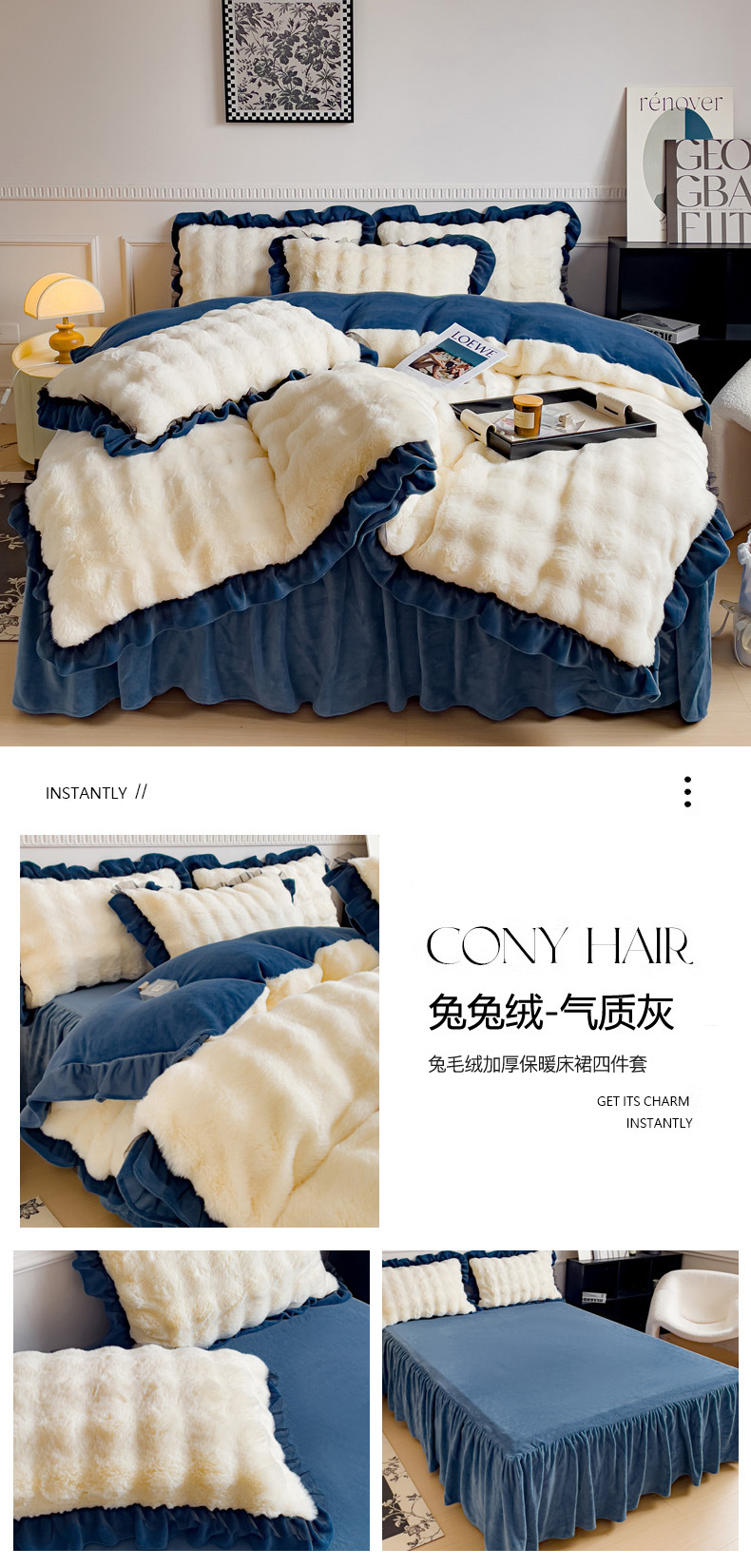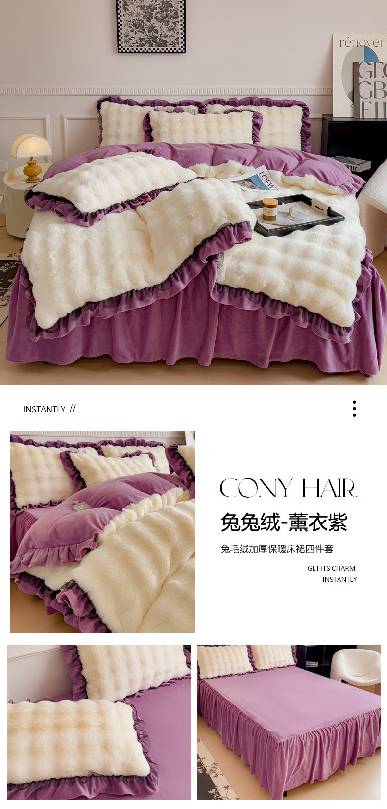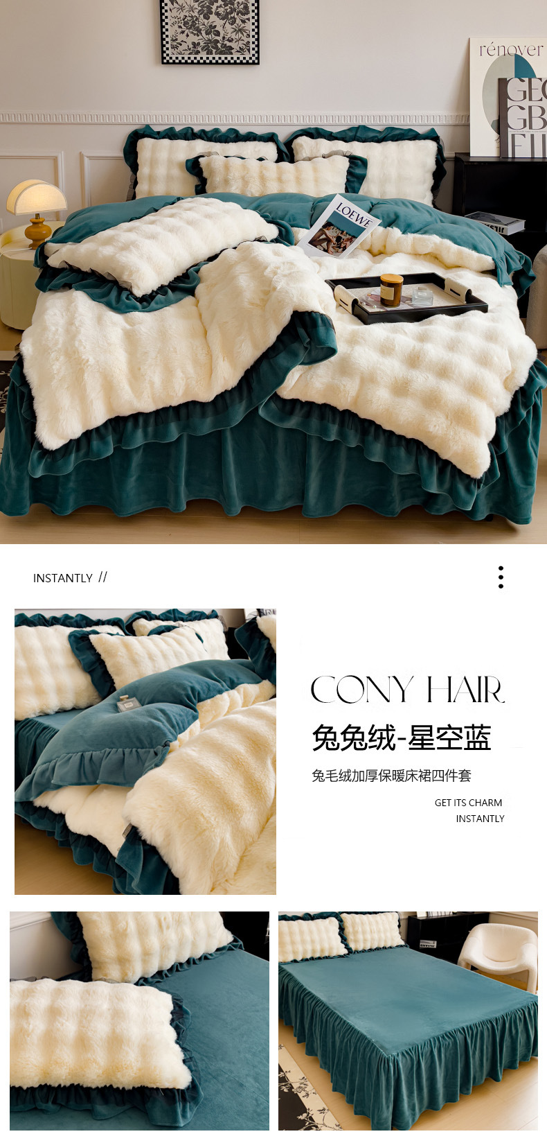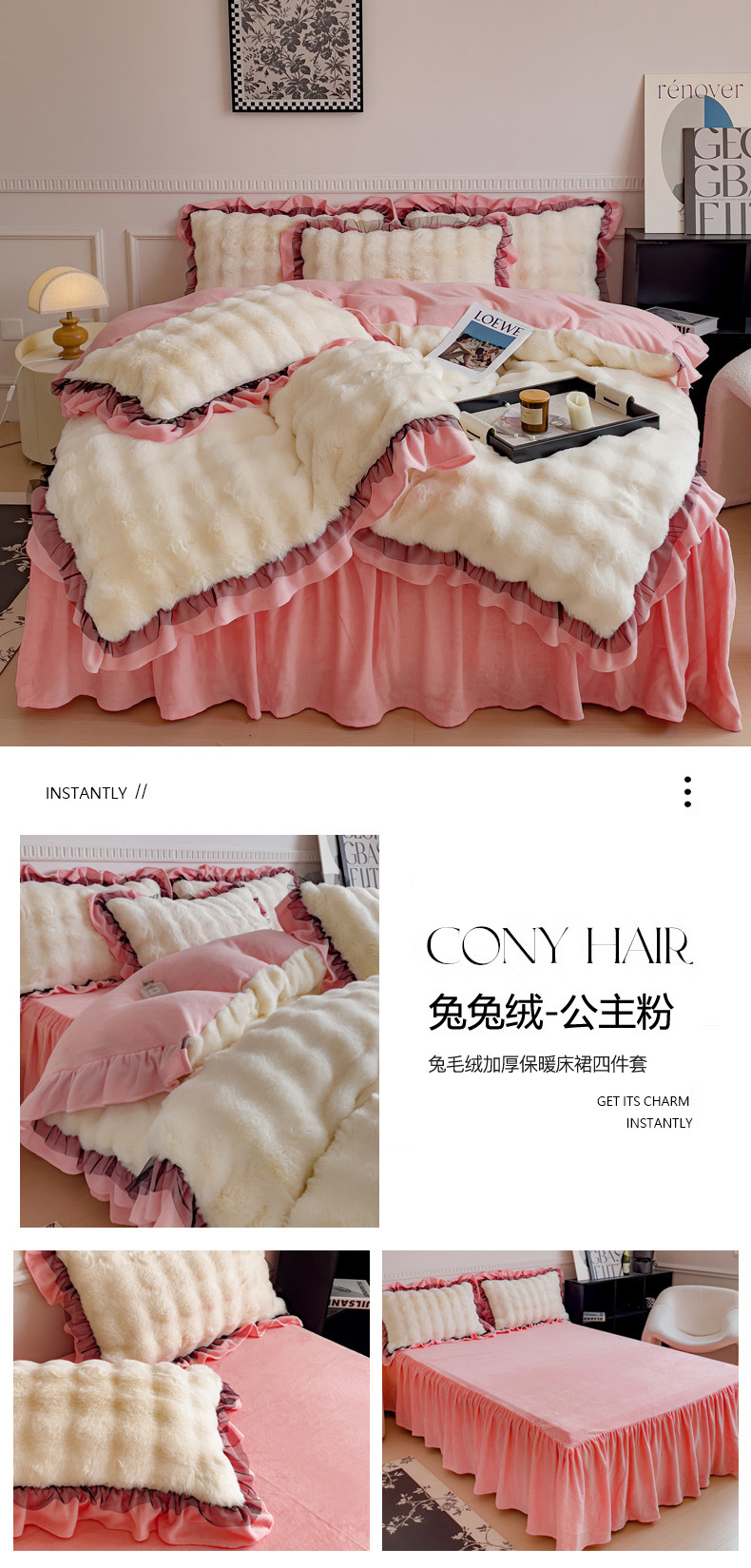두꺼운 따뜻한 토끼 토끼 벨벳 우유 벨벳 침대 스커트 시트 4 피스 세트의 2024 새로운 한국어 버전