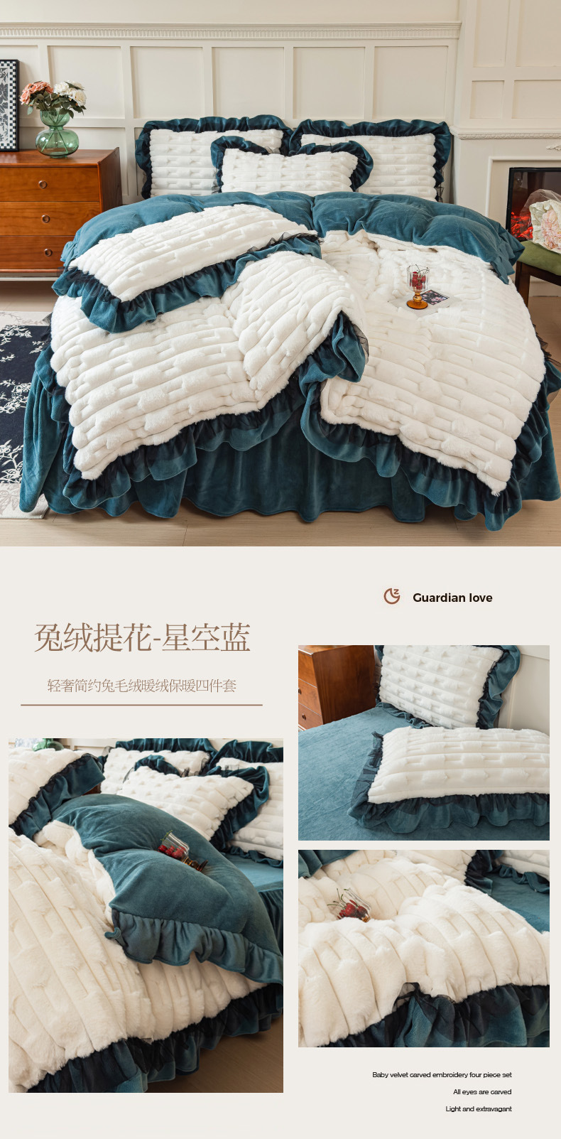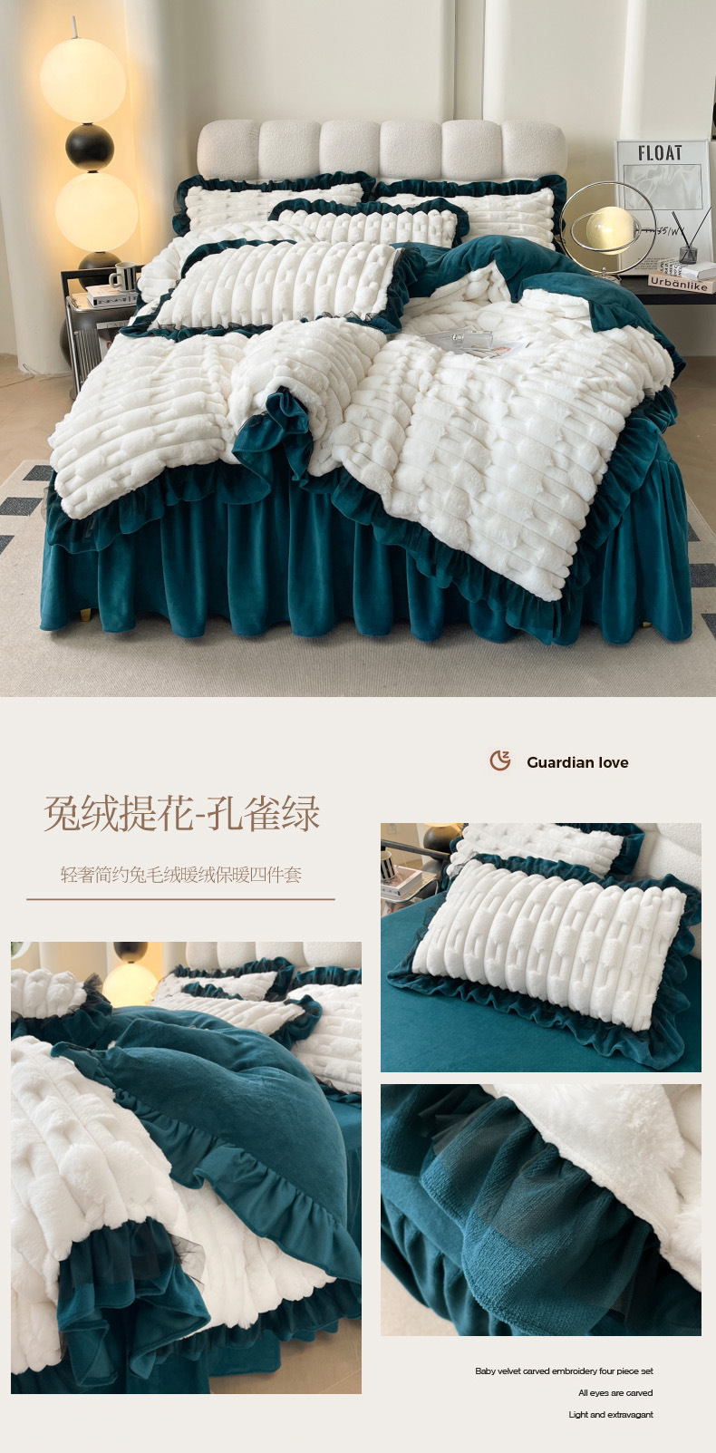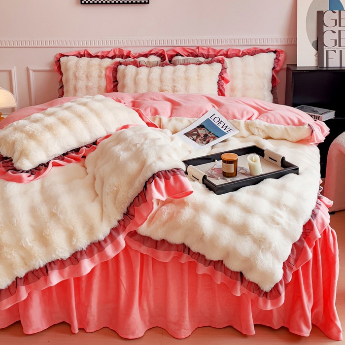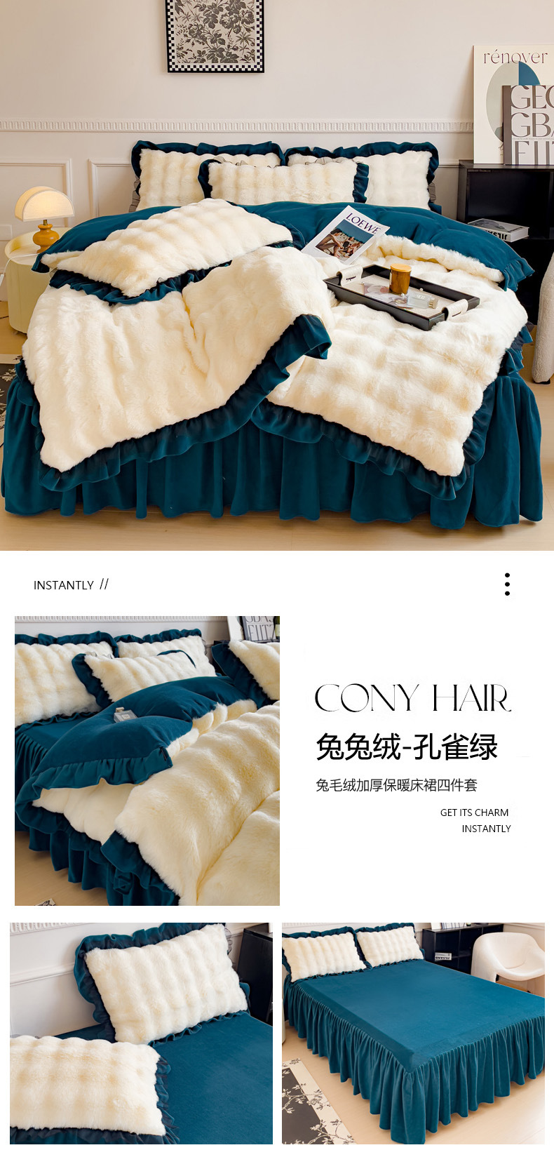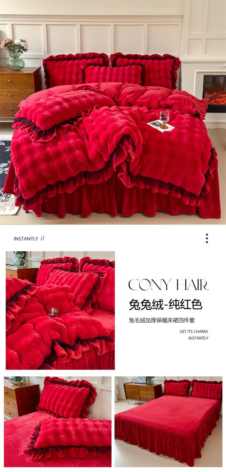 두꺼운 따뜻한 토끼 토끼 벨벳 우유 벨벳 침대 스커트 시트 4 피스 세트의 2024 새로운 한국어 버전