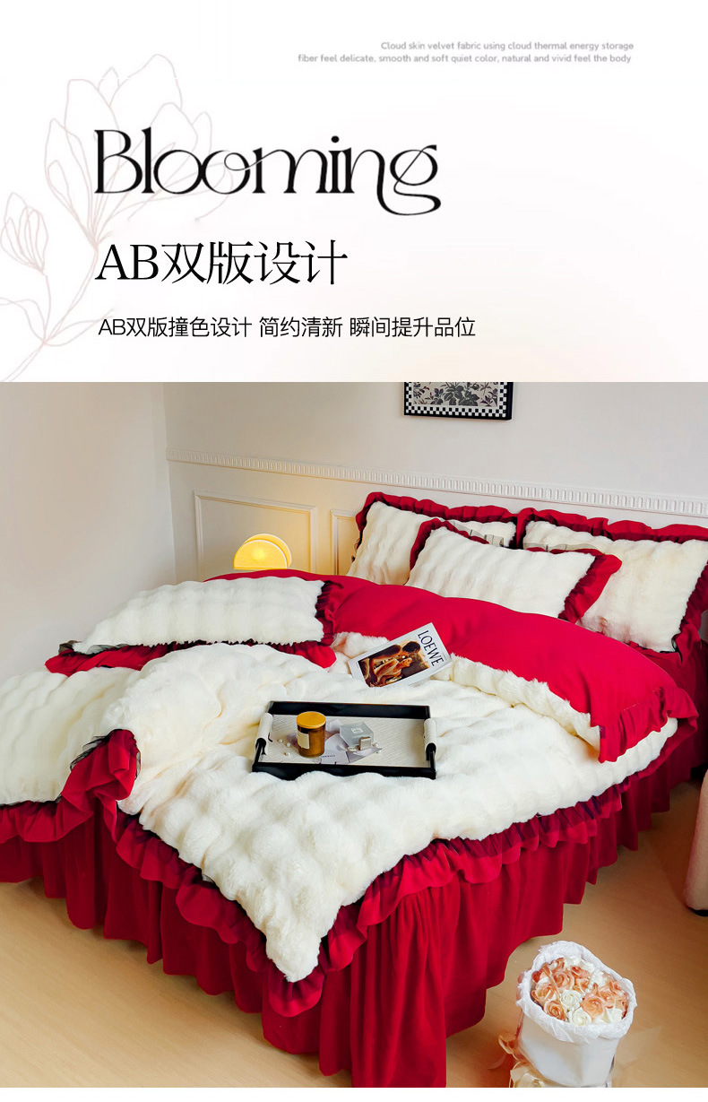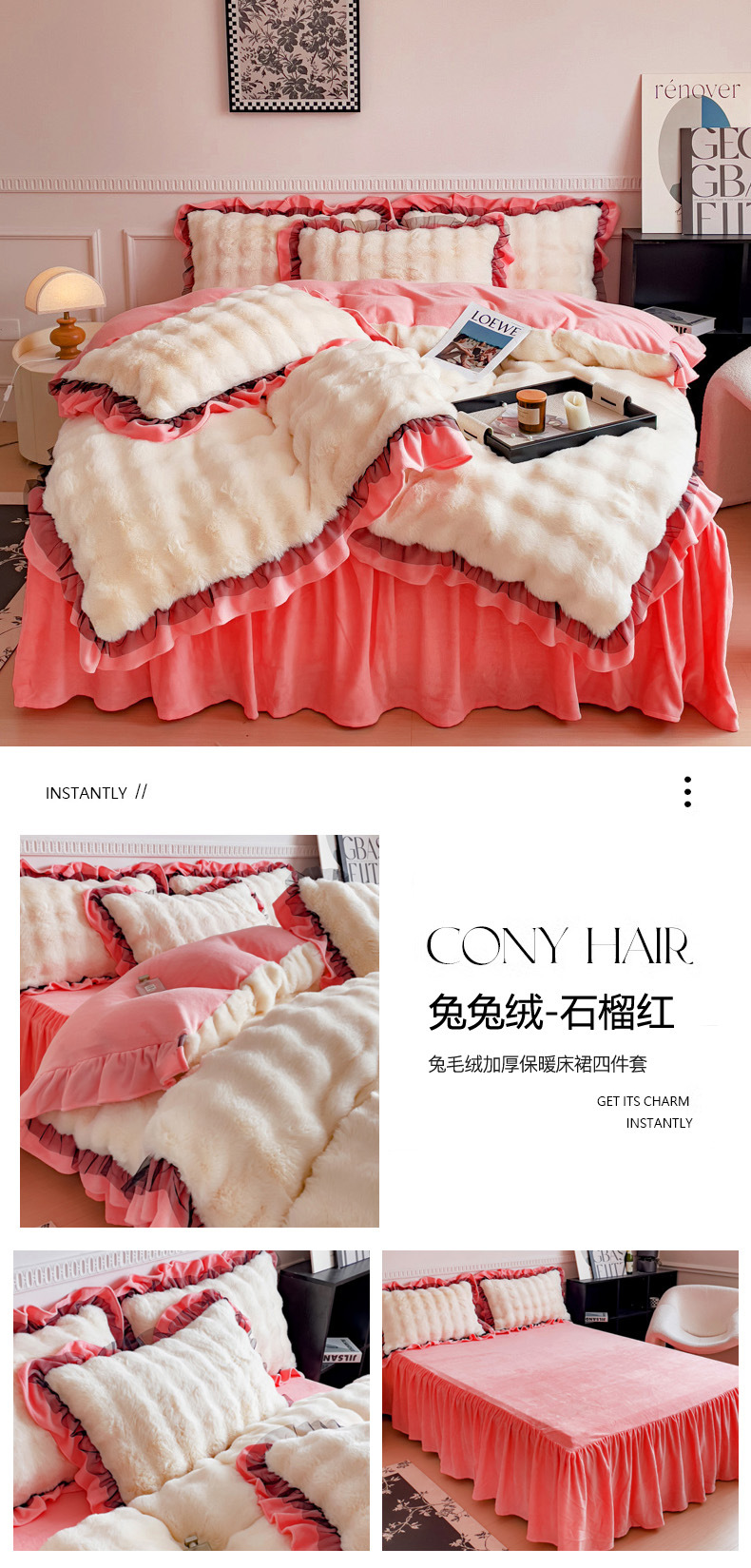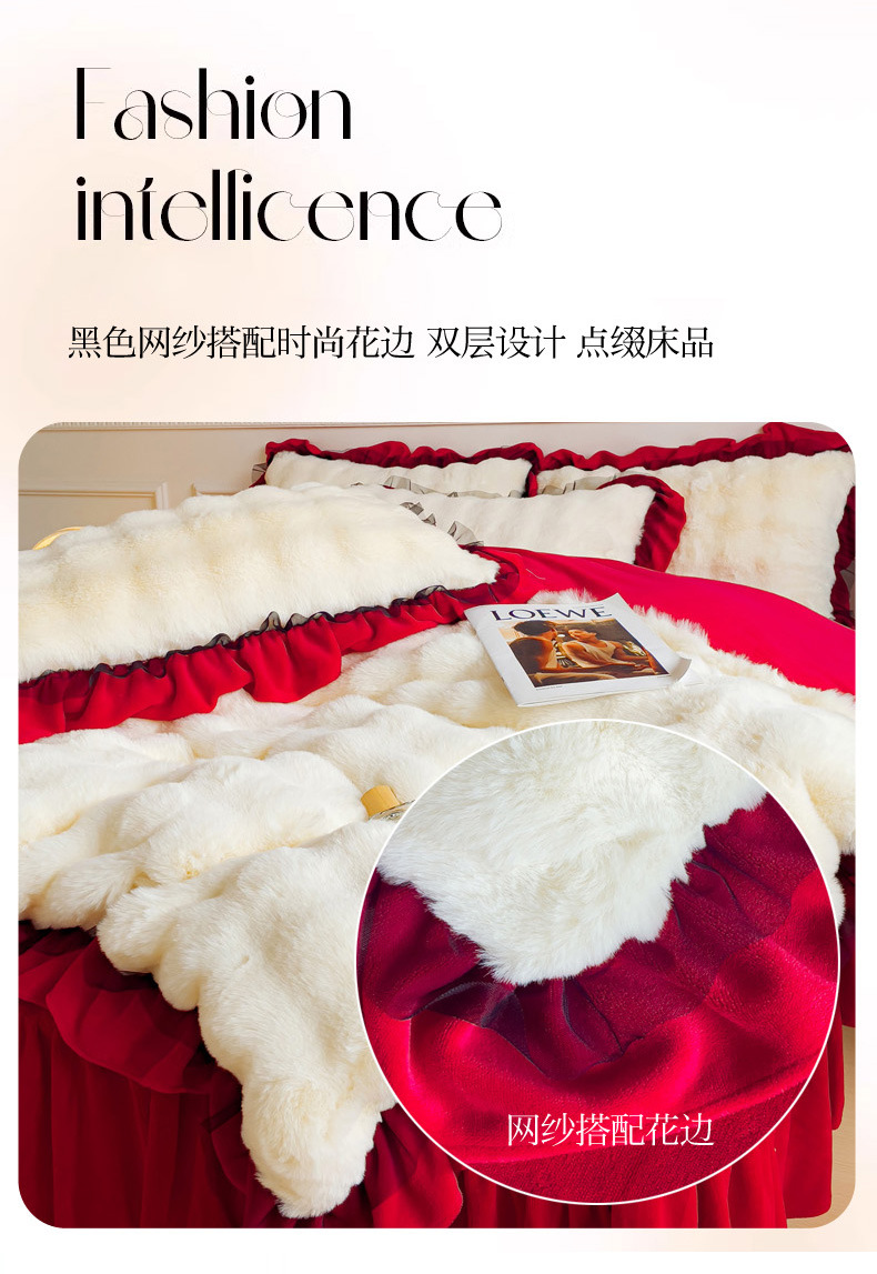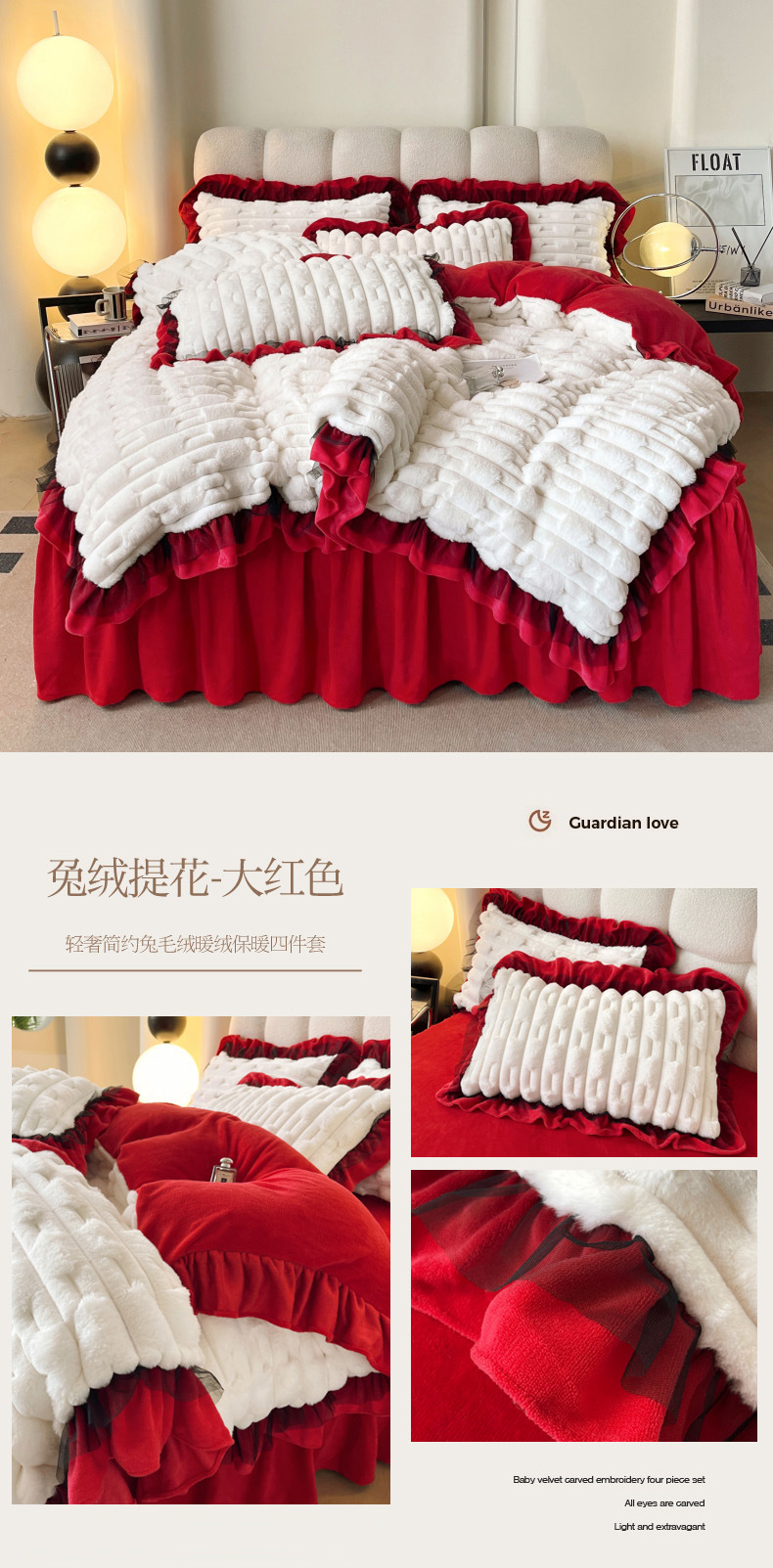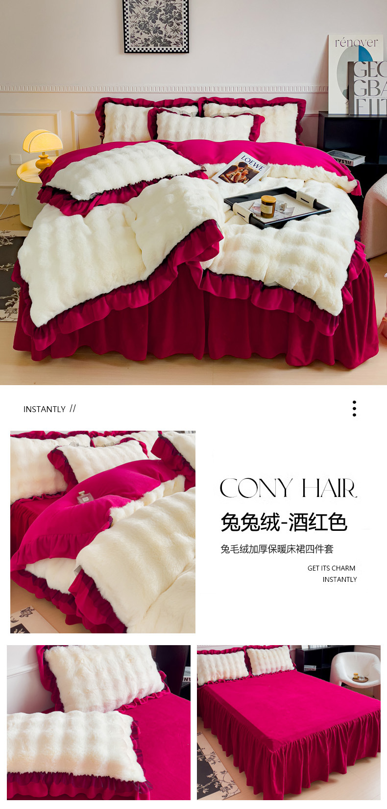 두꺼운 따뜻한 토끼 토끼 벨벳 우유 벨벳 침대 스커트 시트 4 피스 세트의 2024 새로운 한국어 버전
