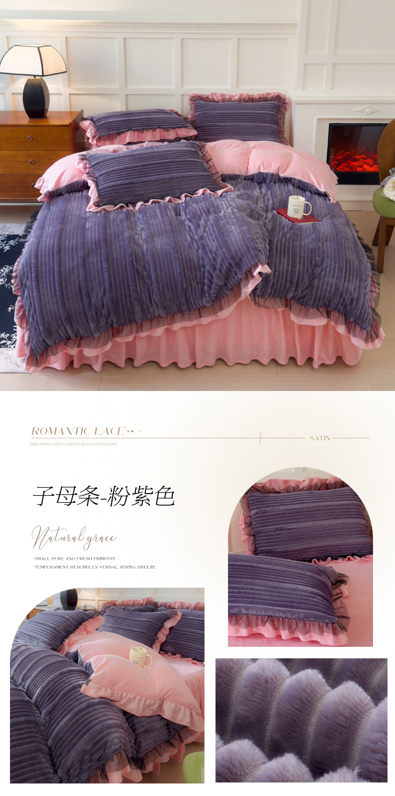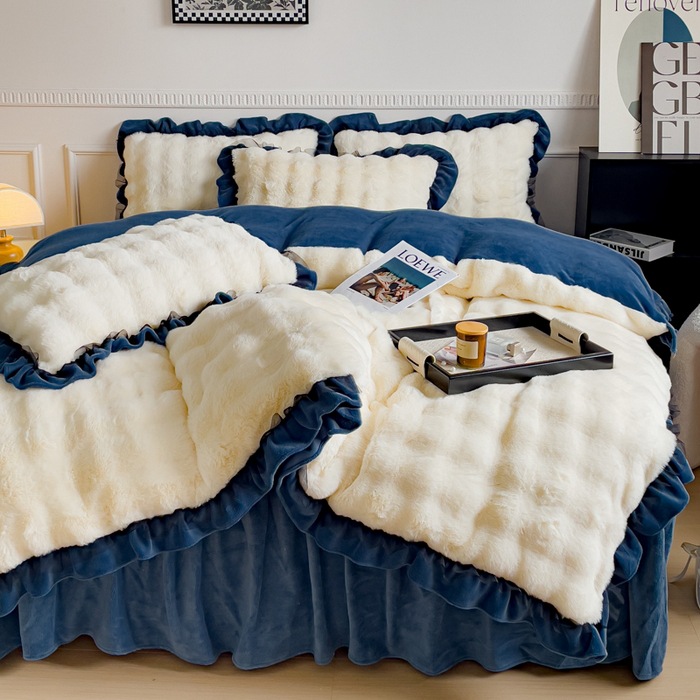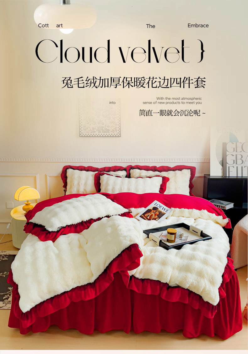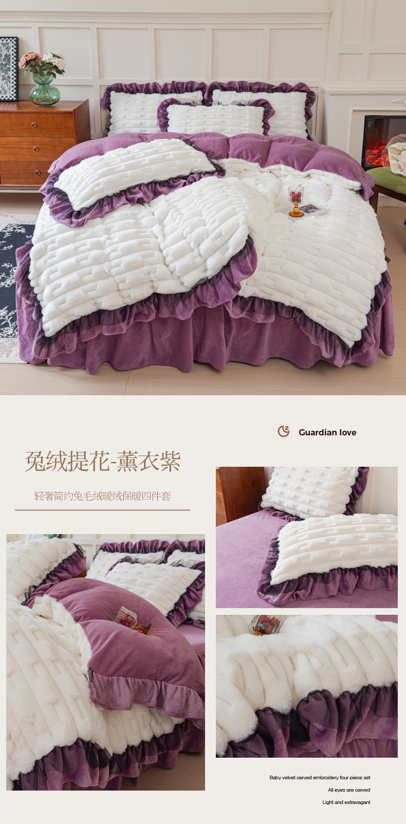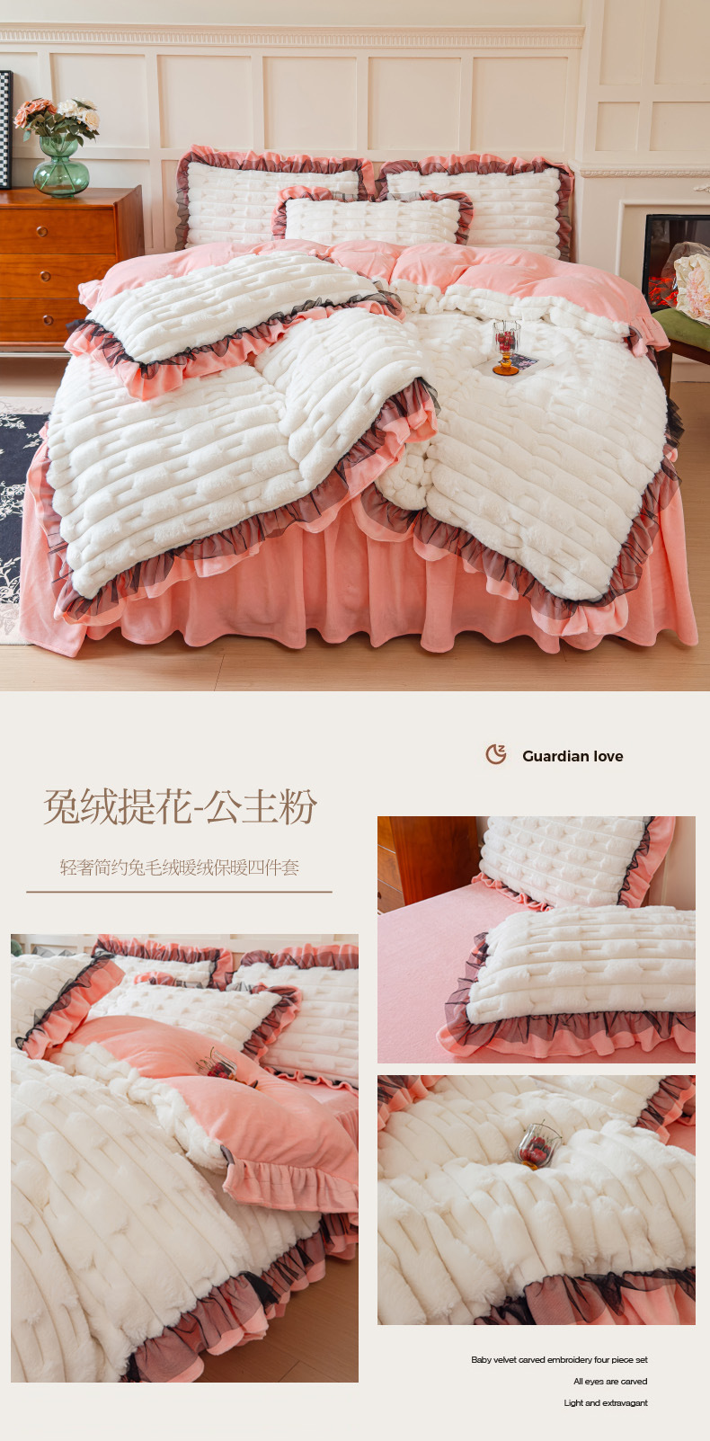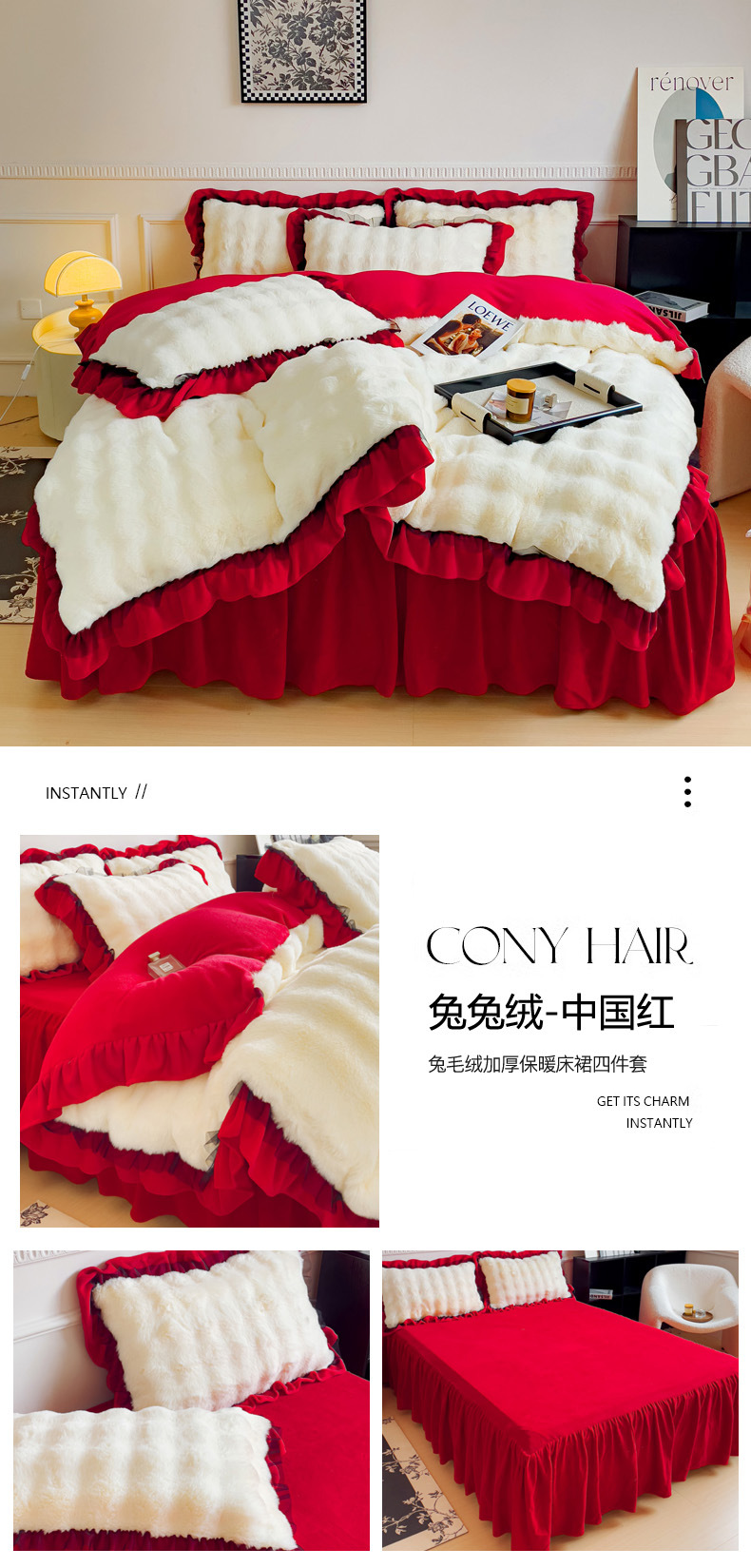 두꺼운 따뜻한 토끼 토끼 벨벳 우유 벨벳 침대 스커트 시트 4 피스 세트의 2024 새로운 한국어 버전