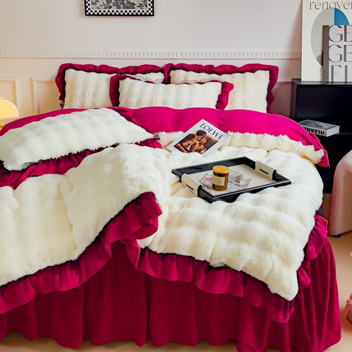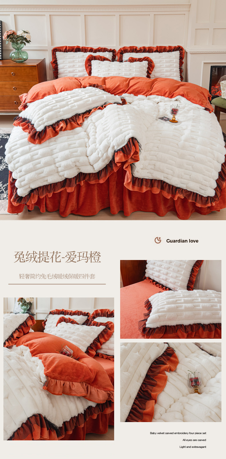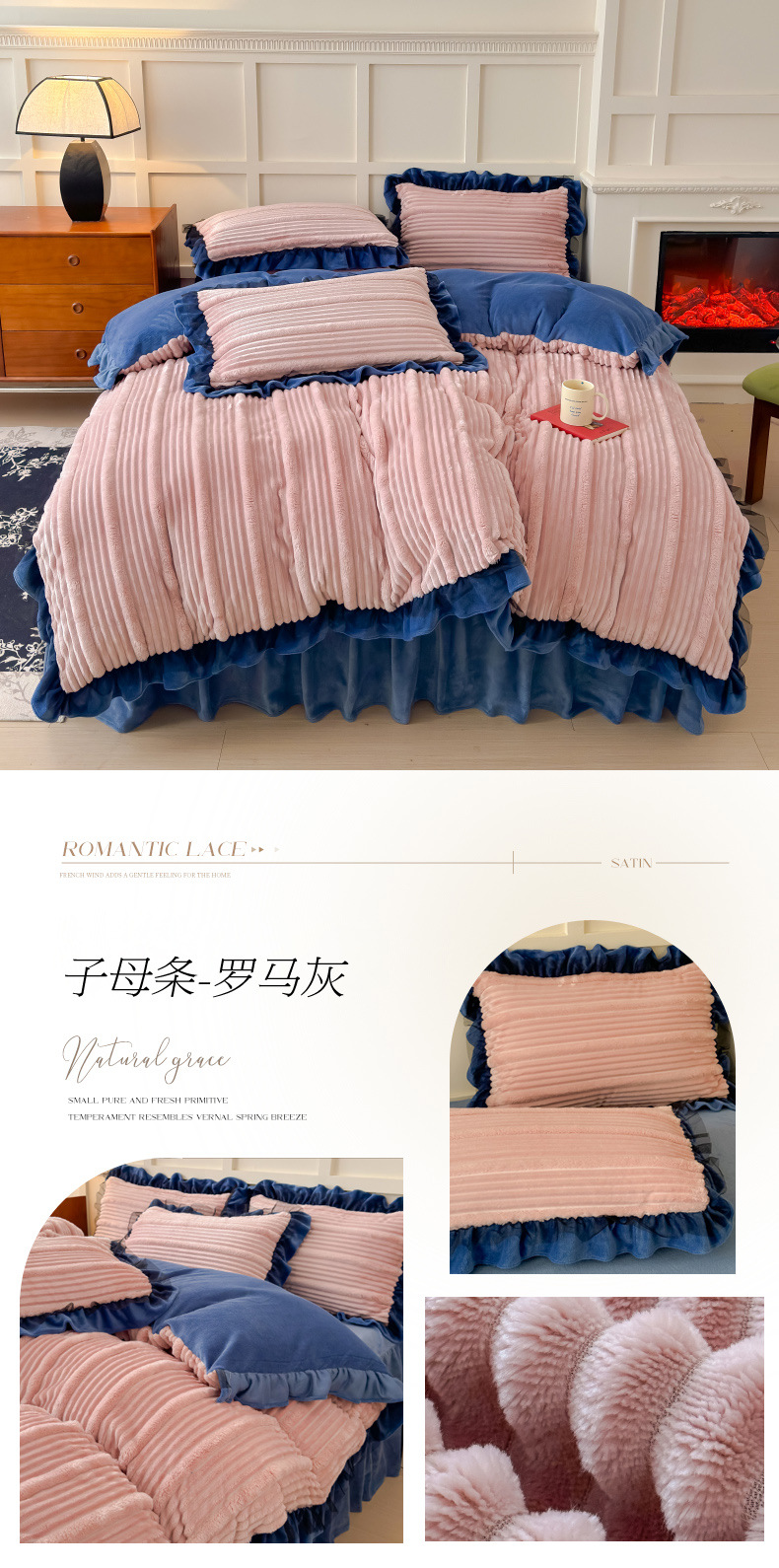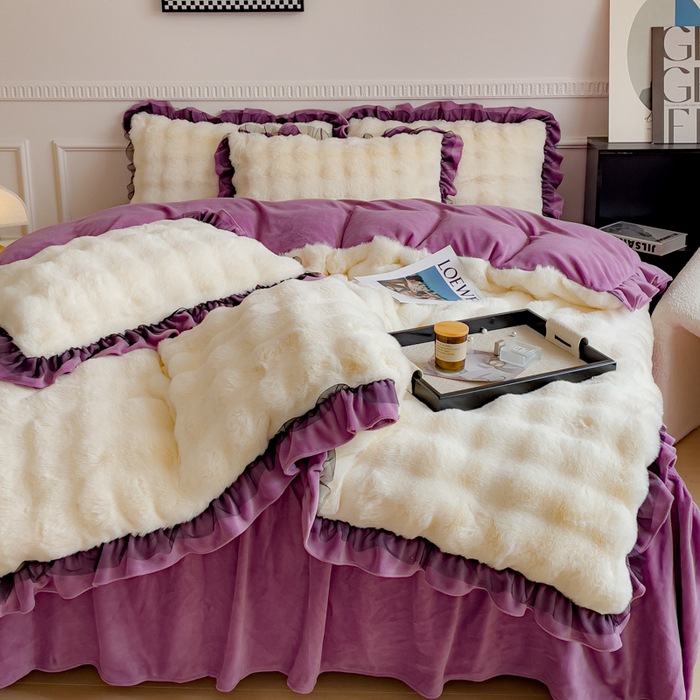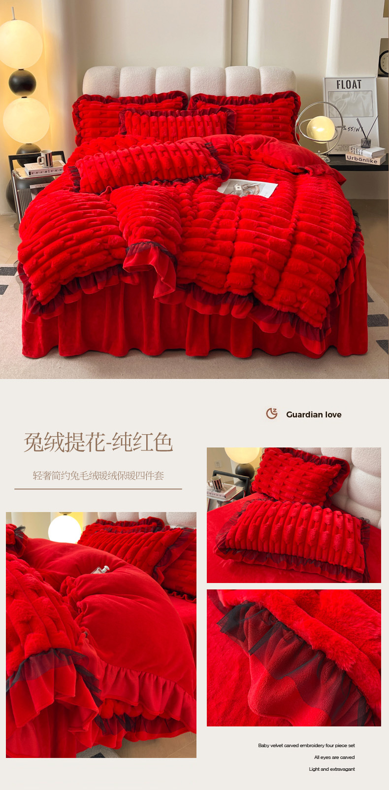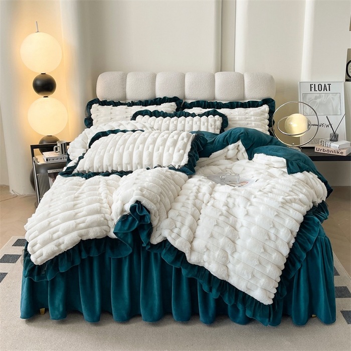 두꺼운 따뜻한 토끼 토끼 벨벳 우유 벨벳 침대 스커트 시트 4 피스 세트의 2024 새로운 한국어 버전