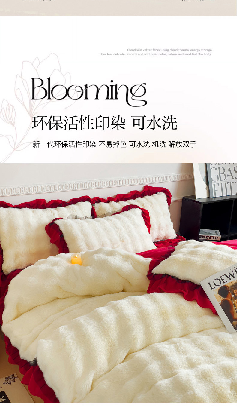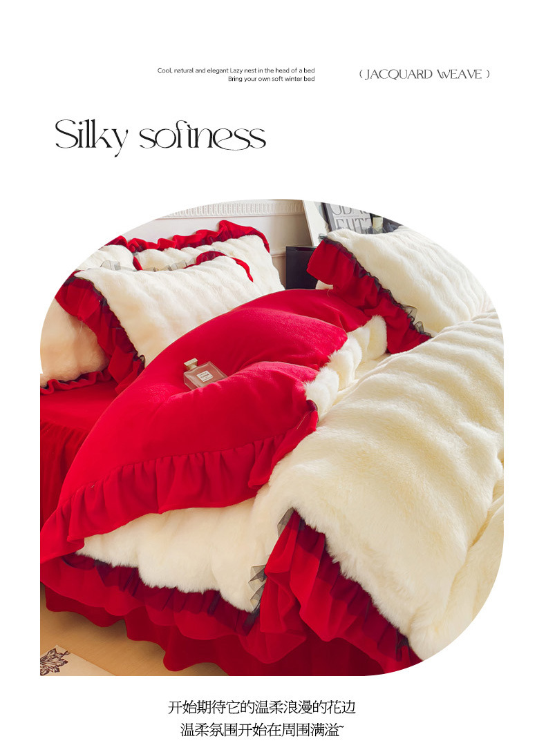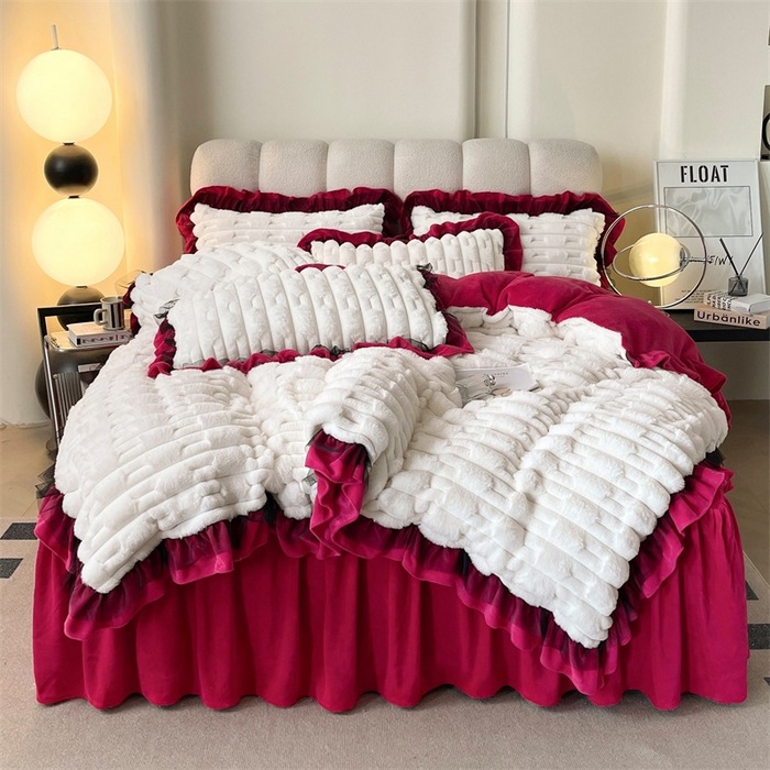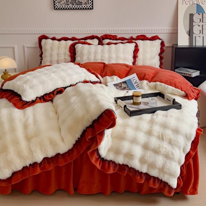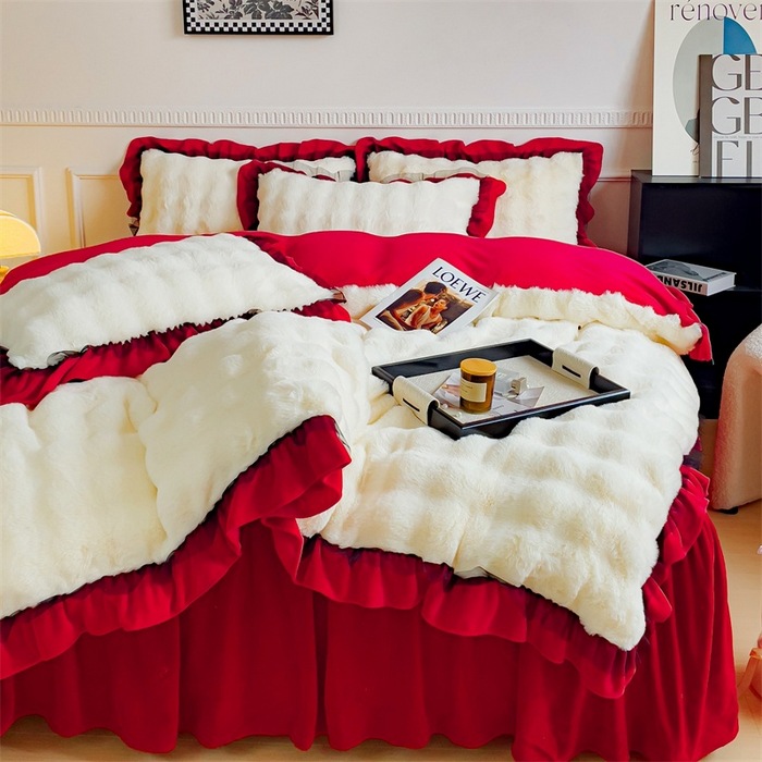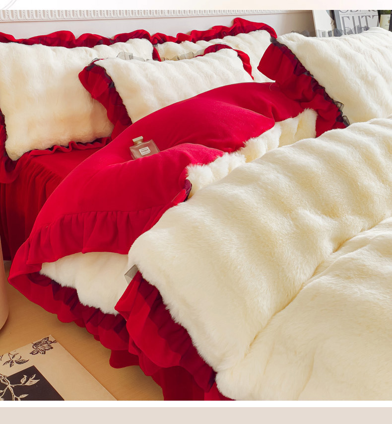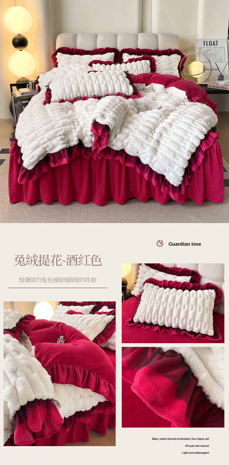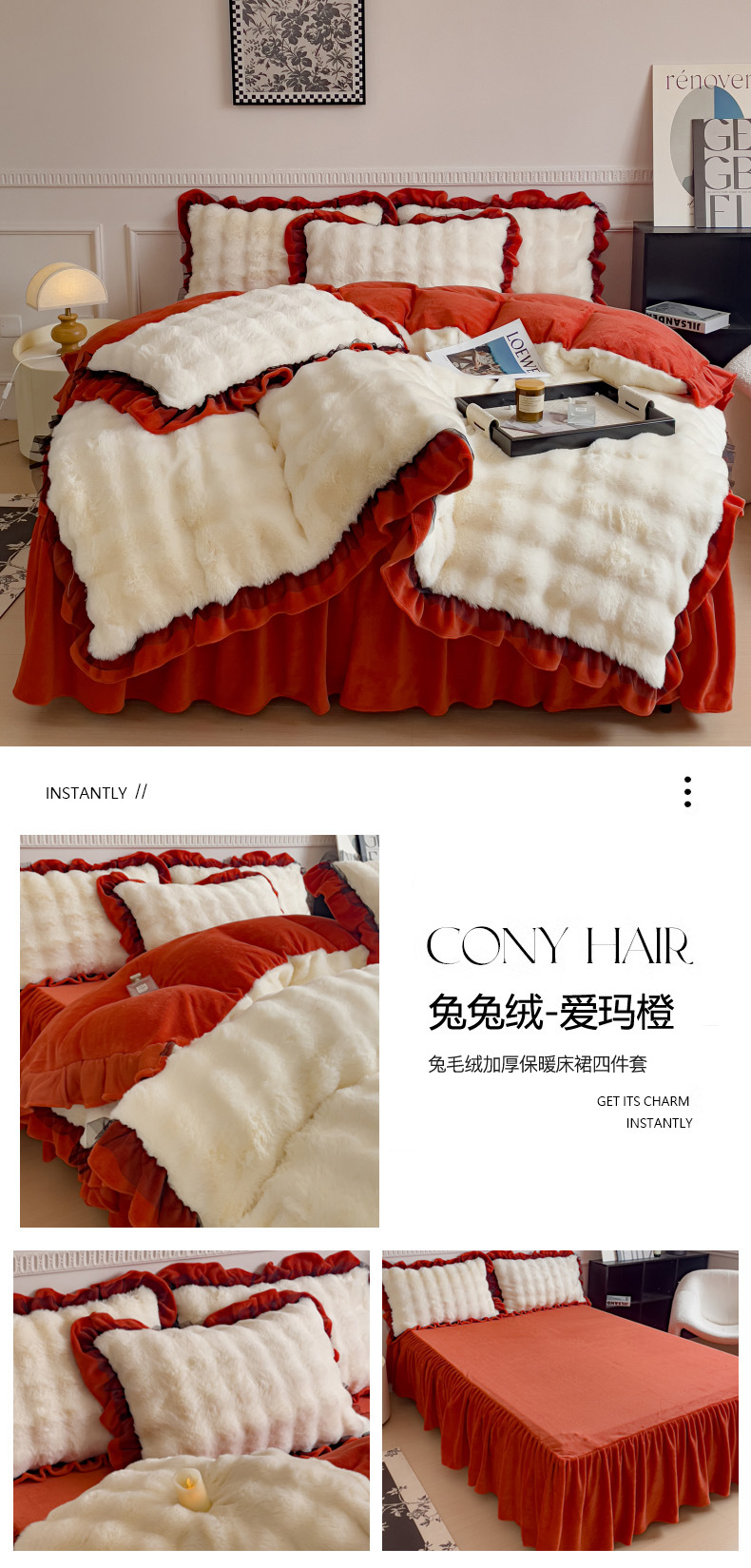 두꺼운 따뜻한 토끼 토끼 벨벳 우유 벨벳 침대 스커트 시트 4 피스 세트의 2024 새로운 한국어 버전